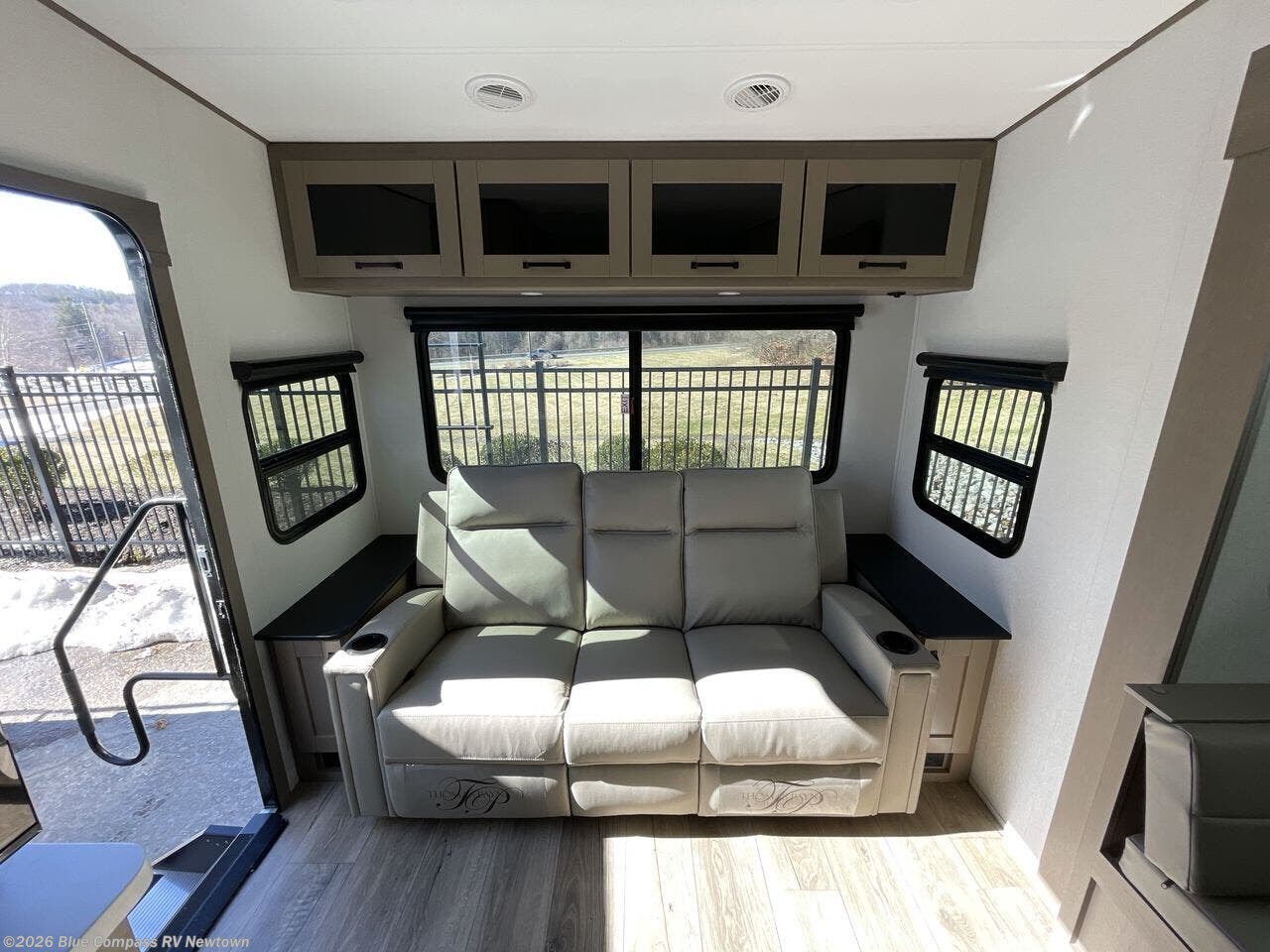 This is the perfect couple's trailer with a space for an overnight guest or two little ones on the booth dinette. You can switch out this dinette for an optional swivel dinette as well, and the standard theater seating can be replaced by an optional trundle bed if you need more sleeping space. A 40" HDTV will keep you entertained when the weather isn't cooperating, and you can whip up your best meals in the full kitchen. And a 19' power awning will provide shade if you choose to take your plate outdoors! The spacious full bath will let you clean up each day, and you'll feel right at home in the front private bedroom with a queen bed!