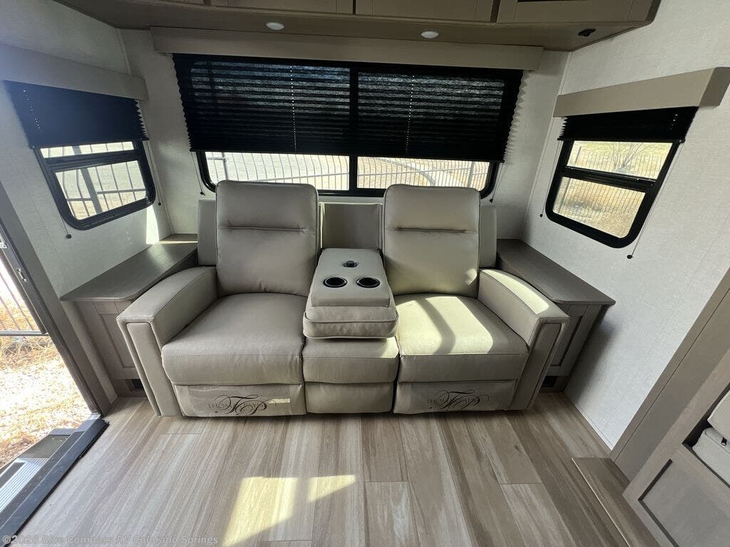 This is the perfect couple's trailer with a space for an overnight guest or two little ones on the booth dinette. You can switch out this dinette for an optional swivel dinette as well, and the standard theater seating can be replaced by an optional trundle bed if you need more sleeping space. A 40" HDTV will keep you entertained when the weather isn't cooperating, and you can whip up your best meals in the full kitchen. And a 19' power awning will provide shade if you choose to take your plate outdoors! The spacious full bath will let you clean up each day, and you'll feel right at home in the front private bedroom with a queen bed!