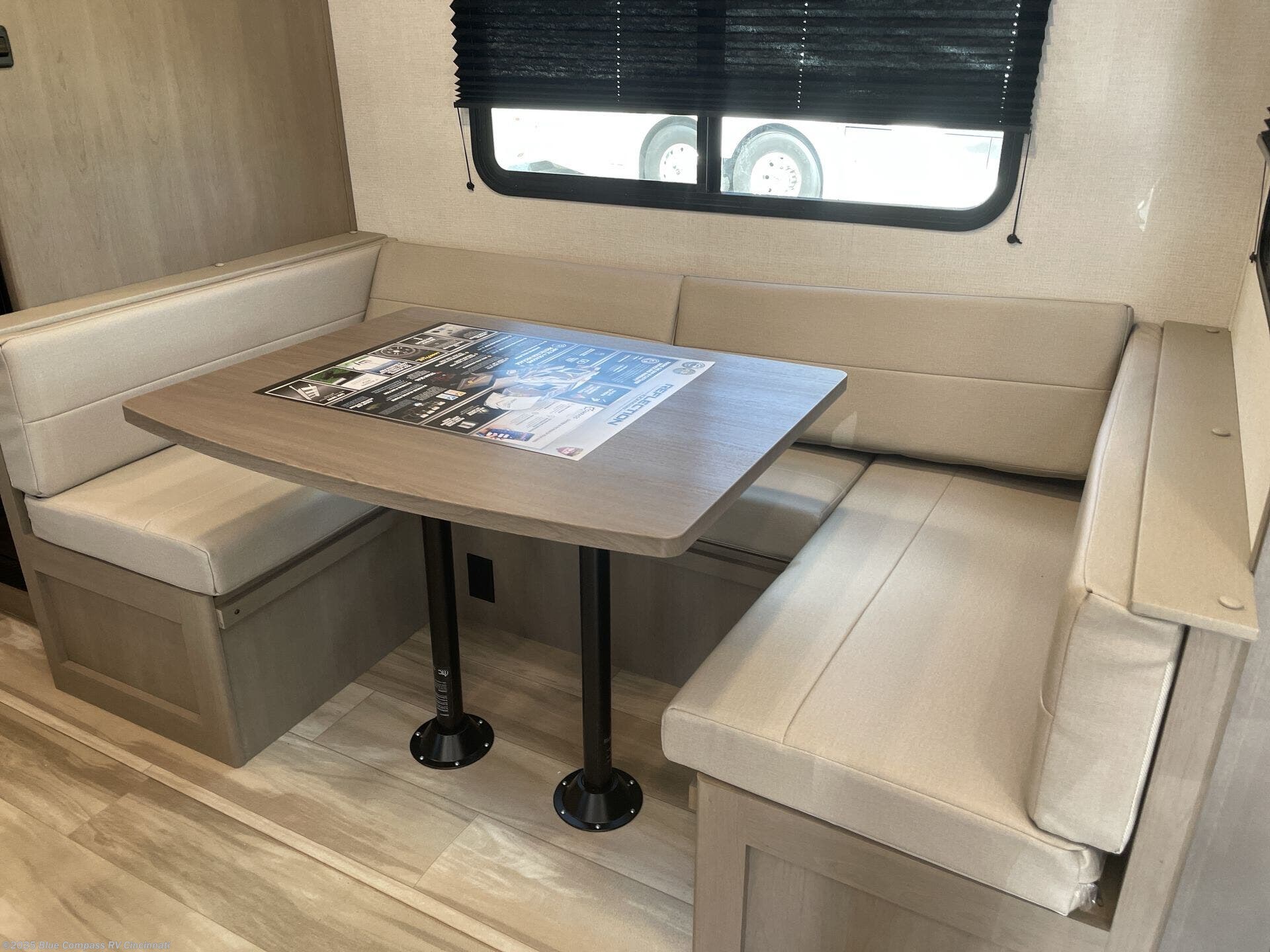 Camping with friends and family just got a whole lot easier in this fifth wheel with double-size bunks and a front private bedroom. Your guests will also have a wardrobe to keep their things tidy, and the bedroom closet will be perfect for your things. If you have other guests stay over, they can sleep on the U-shaped dinette within the slide out or the tri-fold sofa, and there is a 40" high-definition LED TV here to keep everyone entertained on rainy days. Everyone can take turns cleaning up in the full bath that includes a residential walk-in shower, a power vent fan, plus a large vanity top with a deep sink. And you will feel right at home in the front private bedroom with its queen bed, overhead cabinets, and TV prep if you'd like to add a television!