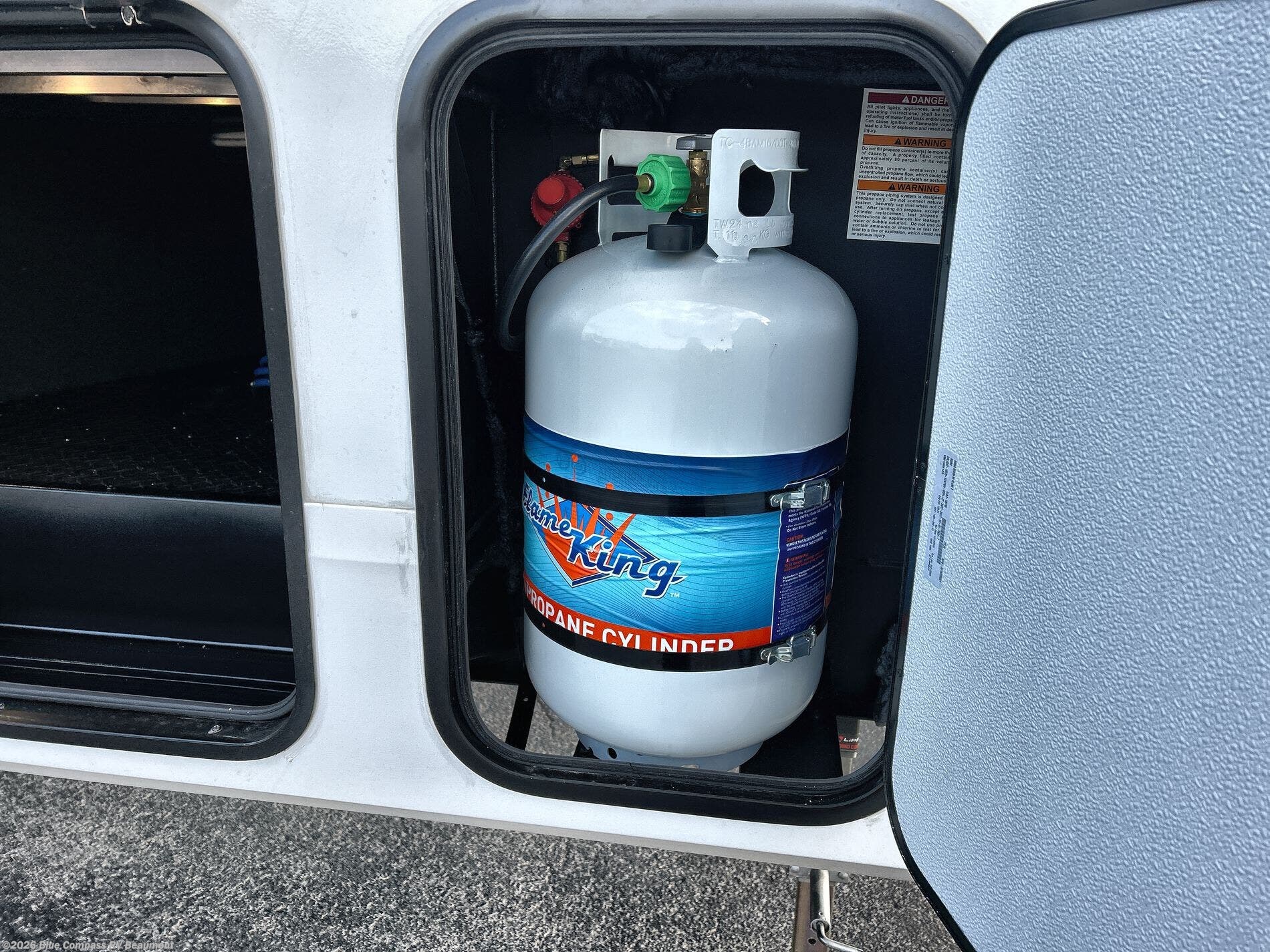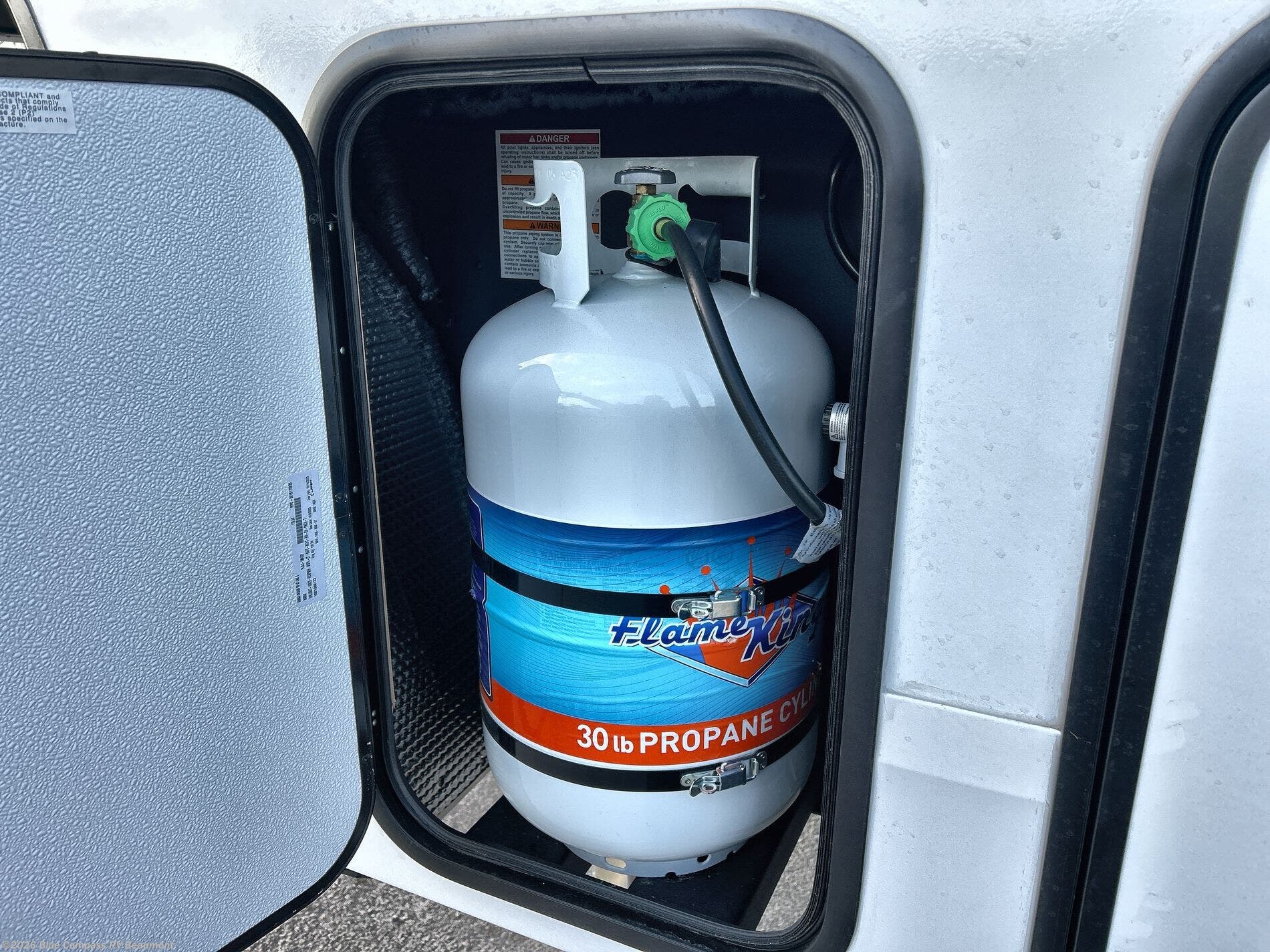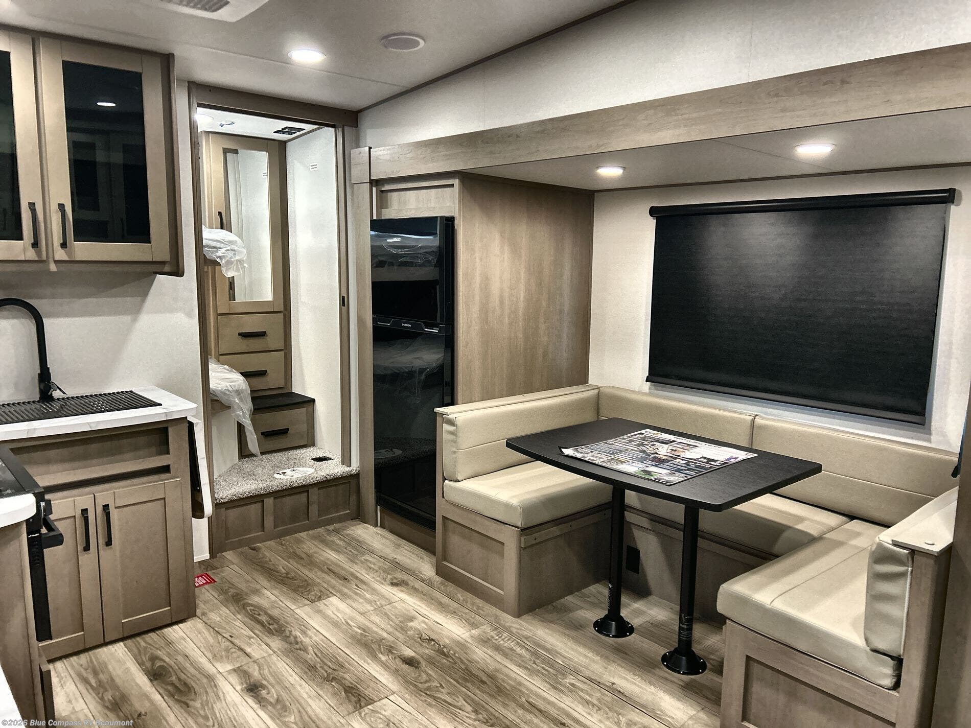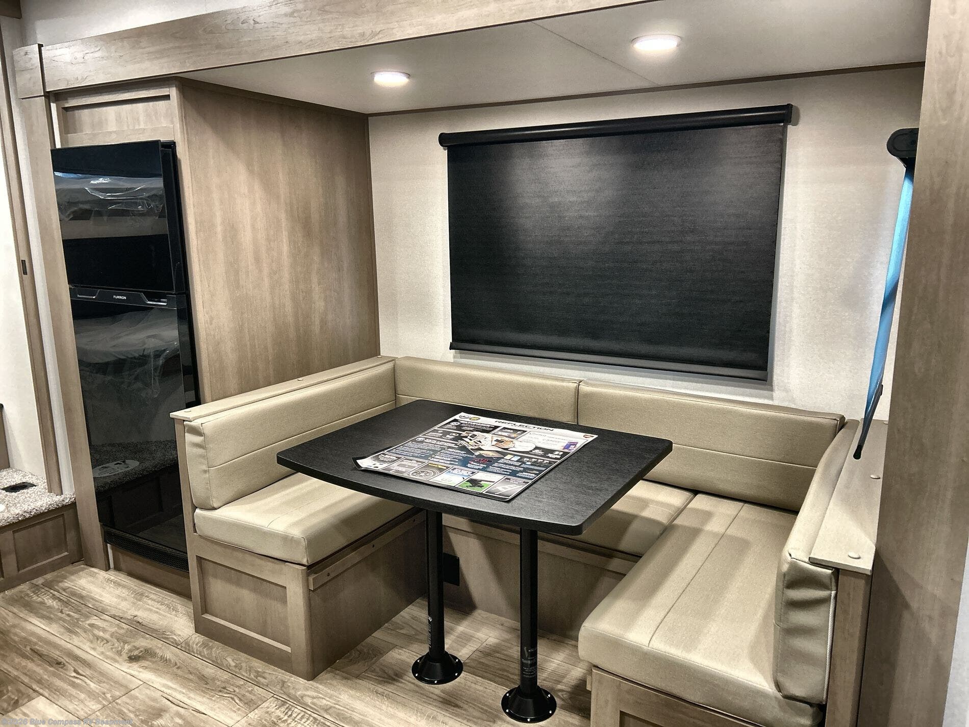 Camping with friends and family just got a whole lot easier in this fifth wheel with double-size bunks and a front private bedroom. Your guests will also have a wardrobe to keep their things tidy, and the bedroom closet will be perfect for your things. If you have other guests stay over, they can sleep on the U-shaped dinette within the slide out or the tri-fold sofa, and there is a 40" high-definition LED TV here to keep everyone entertained on rainy days. Everyone can take turns cleaning up in the full bath that includes a residential walk-in shower, a power vent fan, plus a large vanity top with a deep sink. And you will feel right at home in the front private bedroom with its queen bed, overhead cabinets, and TV prep if you'd like to add a television!