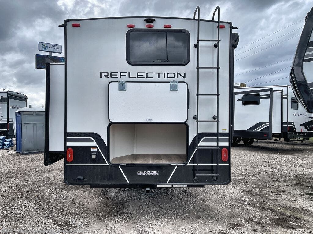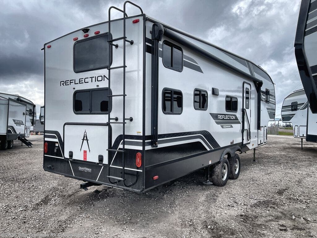 Each Reflection 100 Series fifth wheel by Grand Design is affordable and packed with luxury for unforgettable camping memories! The MorRyde CRE3000 suspension system and Goodyear Endurance tires will provide smooth towing from home to campground. And the solar package with a 180W solar panel, 60 Amp charge controller and 12V refrigerator will allow you to camp for longer periods of time and in more locations! A heated and enclosed underbelly with circulating heat is included in the Arctic 4-Seasons Protection Package, along with a double insulated roof and front cap, and thermofoil insulation under the holding tanks so you can camp all year long if you choose. You will appreciate having an on-demand water heater for hot showers after exploring, and the universal all-in-one docking station will let you monitor your RVs tanks levels and functions with ease. These models also include many luxurious interior features, such as premium Congoleum flooring, pleated shades, residential cabinetry, and matte black fixtures and hardware. Don't let the Reflection 100 Series fifth wheels pass you by!