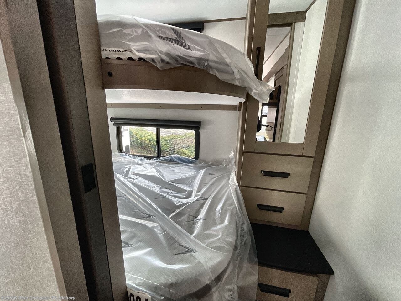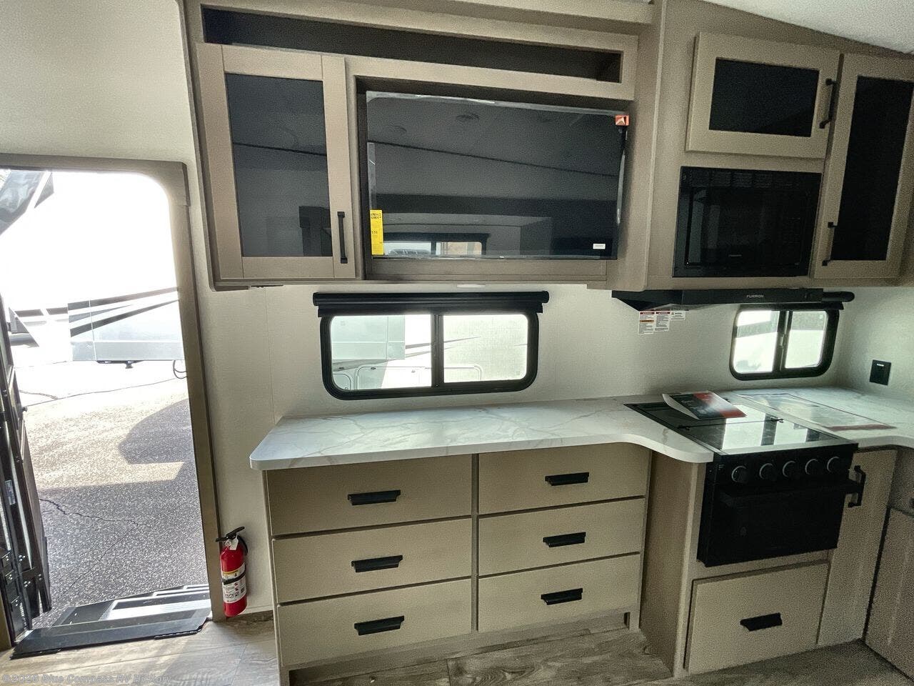 Camping with friends and family just got a whole lot easier in this fifth wheel with double-size bunks and a front private bedroom. Your guests will also have a wardrobe to keep their things tidy, and the bedroom closet will be perfect for your things. If you have other guests stay over, they can sleep on the U-shaped dinette within the slide out or the tri-fold sofa, and there is a 40" high-definition LED TV here to keep everyone entertained on rainy days. Everyone can take turns cleaning up in the full bath that includes a residential walk-in shower, a power vent fan, plus a large vanity top with a deep sink. And you will feel right at home in the front private bedroom with its queen bed, overhead cabinets, and TV prep if you'd like to add a television!