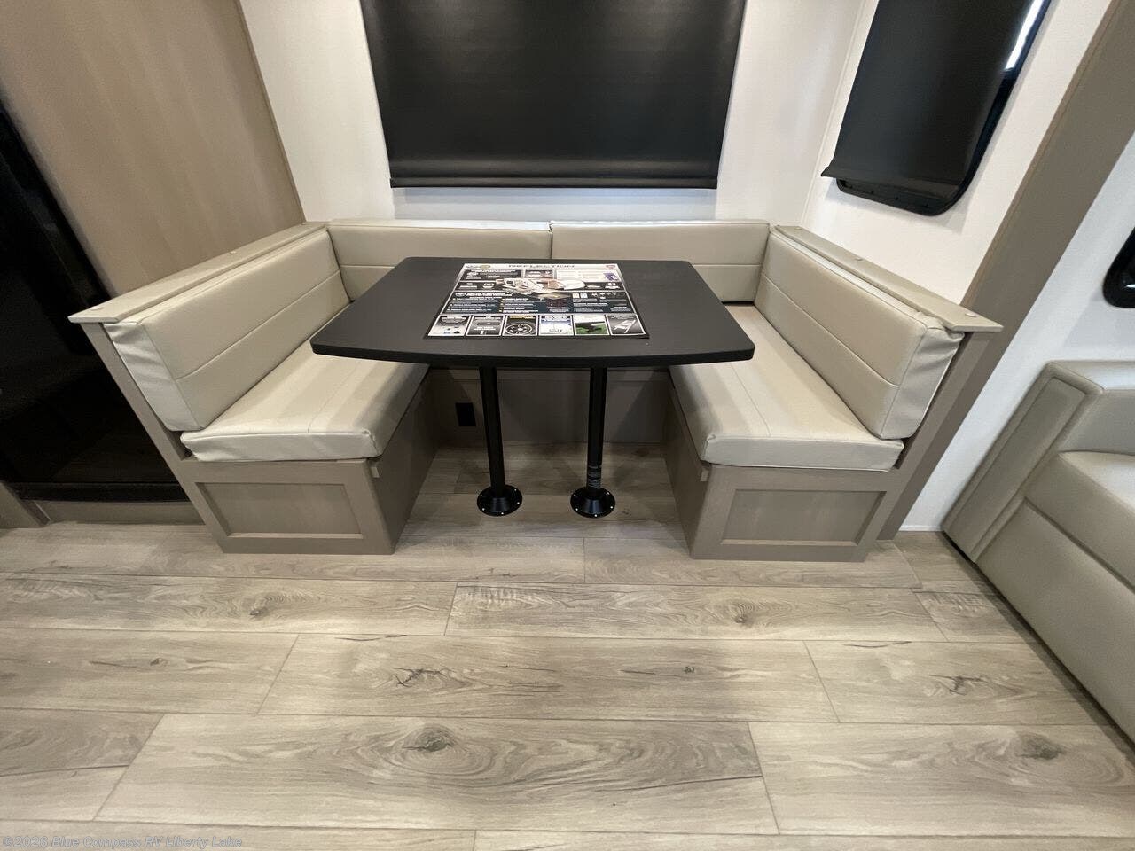 Camping with friends and family just got a whole lot easier in this fifth wheel with double-size bunks and a front private bedroom. Your guests will also have a wardrobe to keep their things tidy, and the bedroom closet will be perfect for your things. If you have other guests stay over, they can sleep on the U-shaped dinette within the slide out or the tri-fold sofa, and there is a 40" high-definition LED TV here to keep everyone entertained on rainy days. Everyone can take turns cleaning up in the full bath that includes a residential walk-in shower, a power vent fan, plus a large vanity top with a deep sink. And you will feel right at home in the front private bedroom with its queen bed, overhead cabinets, and TV prep if you'd like to add a television!