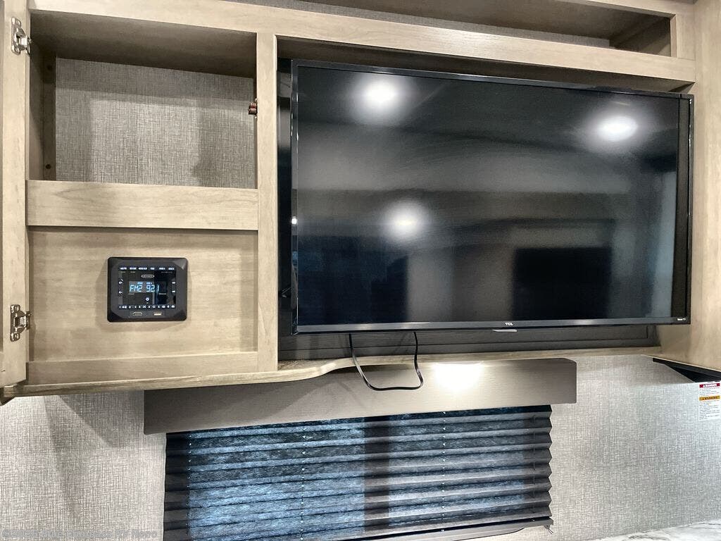 Camping with friends and family just got a whole lot easier in this fifth wheel with double-size bunks and a front private bedroom. Your guests will also have a wardrobe to keep their things tidy, and the bedroom closet will be perfect for your things. If you have other guests stay over, they can sleep on the U-shaped dinette within the slide out or the tri-fold sofa, and there is a 40" high-definition LED TV here to keep everyone entertained on rainy days. Everyone can take turns cleaning up in the full bath that includes a residential walk-in shower, a power vent fan, plus a large vanity top with a deep sink. And you will feel right at home in the front private bedroom with its queen bed, overhead cabinets, and TV prep if you'd like to add a television!