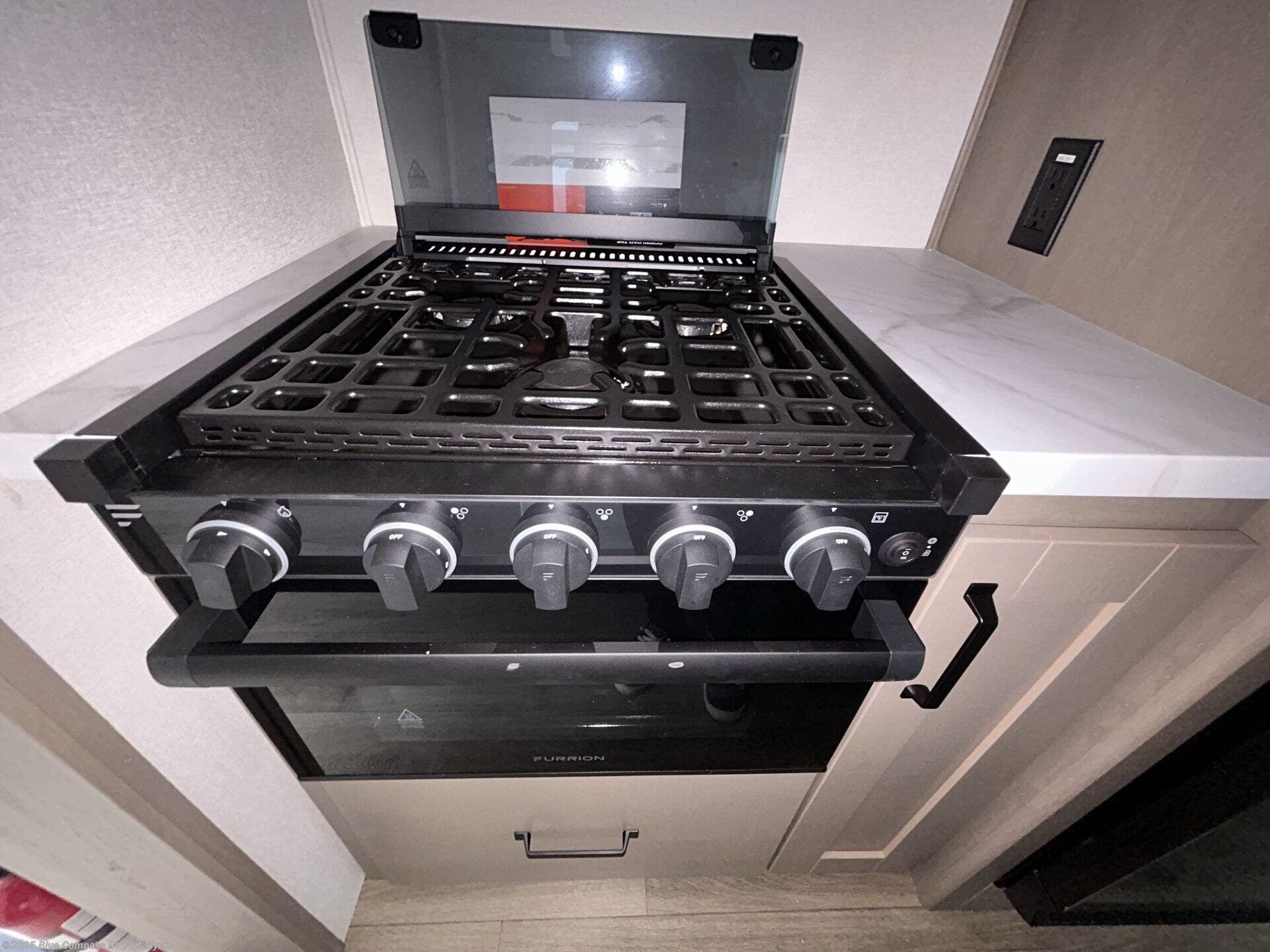 You'll love the amount of space you have in this fifth wheel thanks to the dual opposing slides in the rear living area/kitchen. Your friends and family can relax on the tri-fold sofa or theater seating across from the high-definition 40" LED TV. There is also a booth dinette or you can choose the optional swivel dinette if you prefer that seating. The chef of your group will appreciate having a kitchen island that will provide more counter space, plus there is a hutch with overhead cabinets for nice dishes. A full bath onboard lets you clean up each day and the front private bedroom includes a queen bed just like at home. You'll also love spending time outdoors under the electric awning, and there is an unobstructed pass-thru storage for fishing poles, hiking gear, and camp chairs!