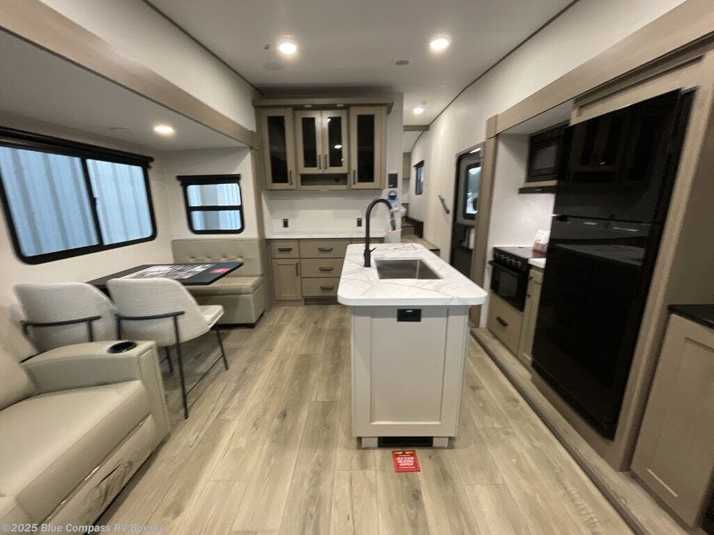 You'll love the amount of space you have in this fifth wheel thanks to the dual opposing slides in the rear living area/kitchen. Your friends and family can relax on the tri-fold sofa or theater seating across from the high-definition 40" LED TV. There is also a booth dinette or you can choose the optional swivel dinette if you prefer that seating. The chef of your group will appreciate having a kitchen island that will provide more counter space, plus there is a hutch with overhead cabinets for nice dishes. A full bath onboard lets you clean up each day and the front private bedroom includes a queen bed just like at home. You'll also love spending time outdoors under the electric awning, and there is an unobstructed pass-thru storage for fishing poles, hiking gear, and camp chairs!