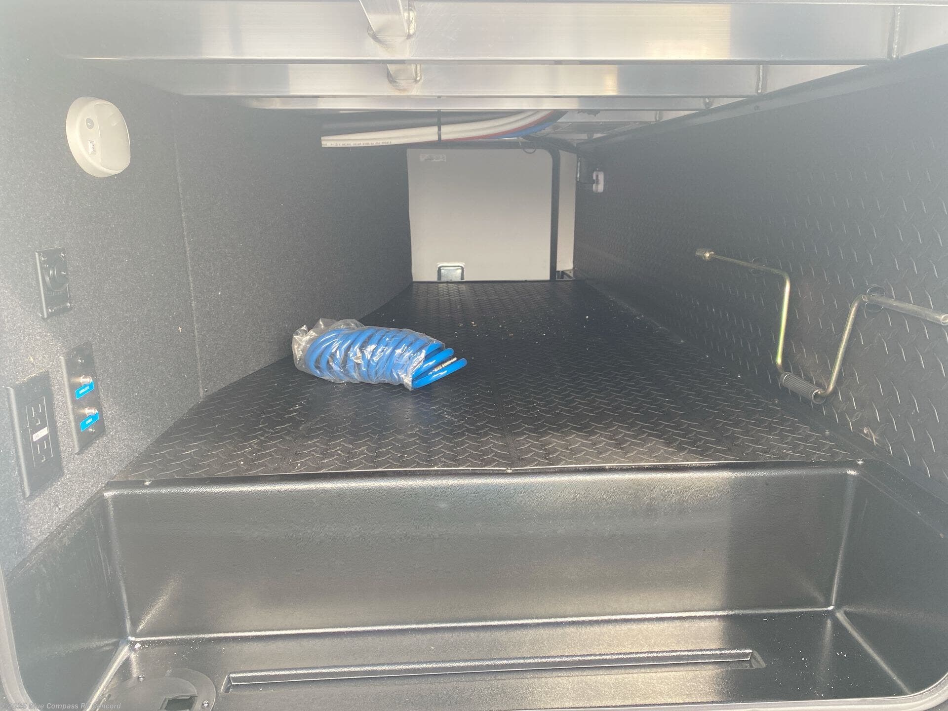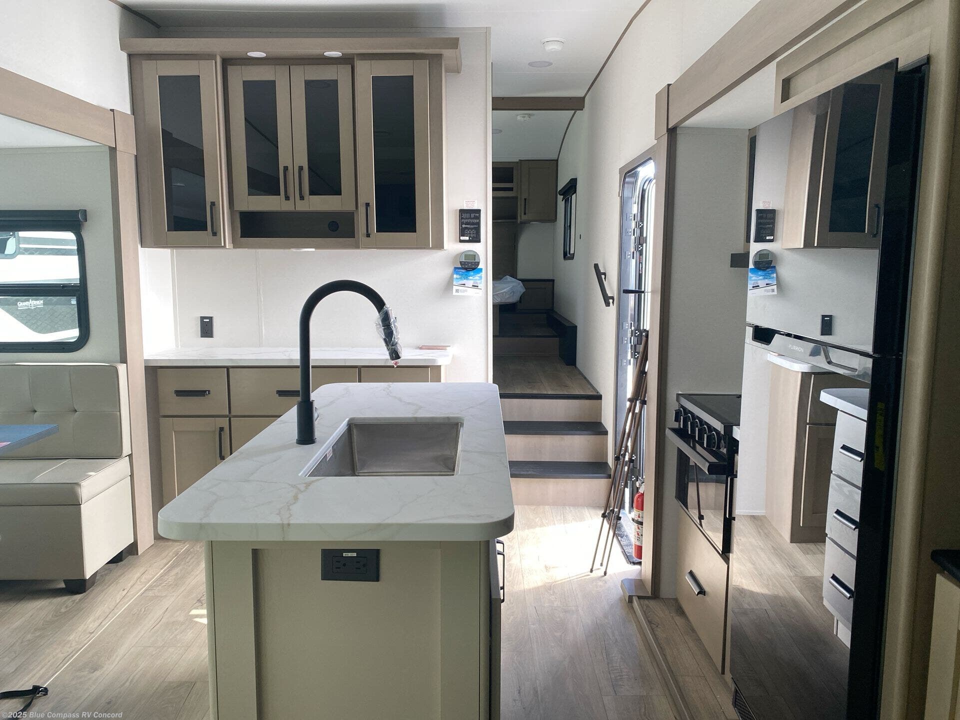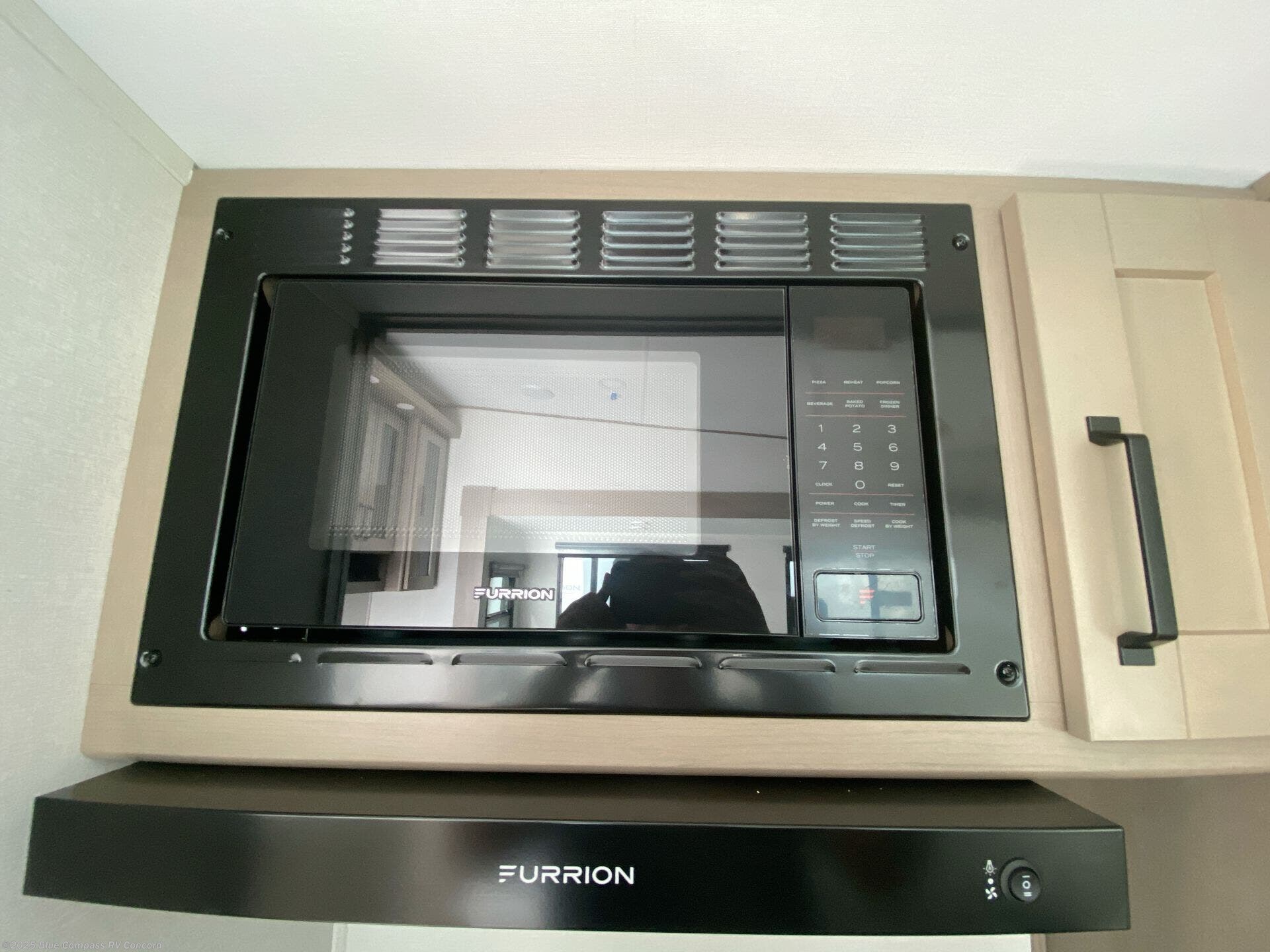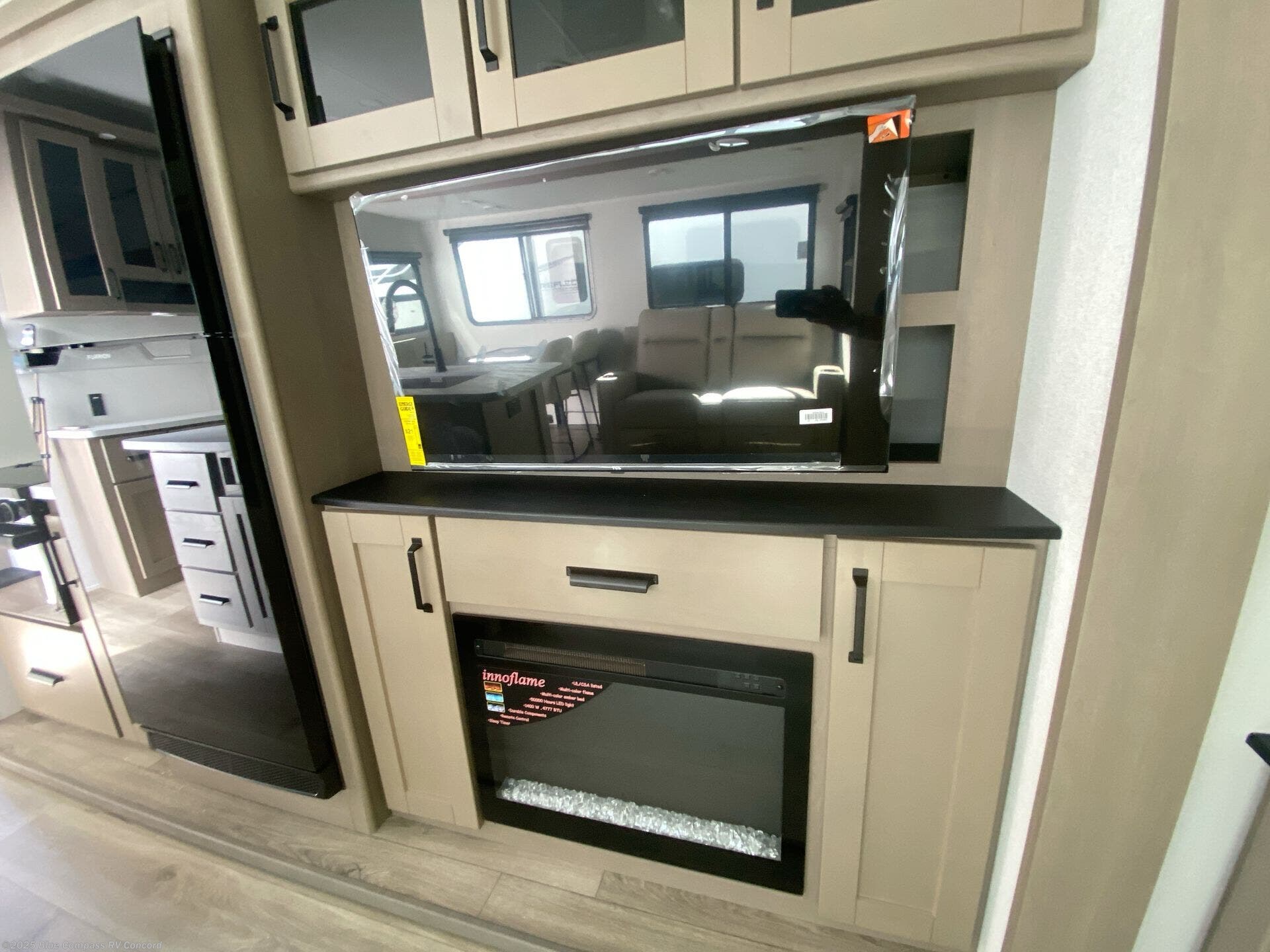You'll love the amount of space you have in this fifth wheel thanks to the dual opposing slides in the rear living area/kitchen. Your friends and family can relax on the tri-fold sofa or theater seating across from the high-definition 40" LED TV. There is also a booth dinette or you can choose the optional swivel dinette if you prefer that seating. The chef of your group will appreciate having a kitchen island that will provide more counter space, plus there is a hutch with overhead cabinets for nice dishes. A full bath onboard lets you clean up each day and the front private bedroom includes a queen bed just like at home. You'll also love spending time outdoors under the electric awning, and there is an unobstructed pass-thru storage for fishing poles, hiking gear, and camp chairs!