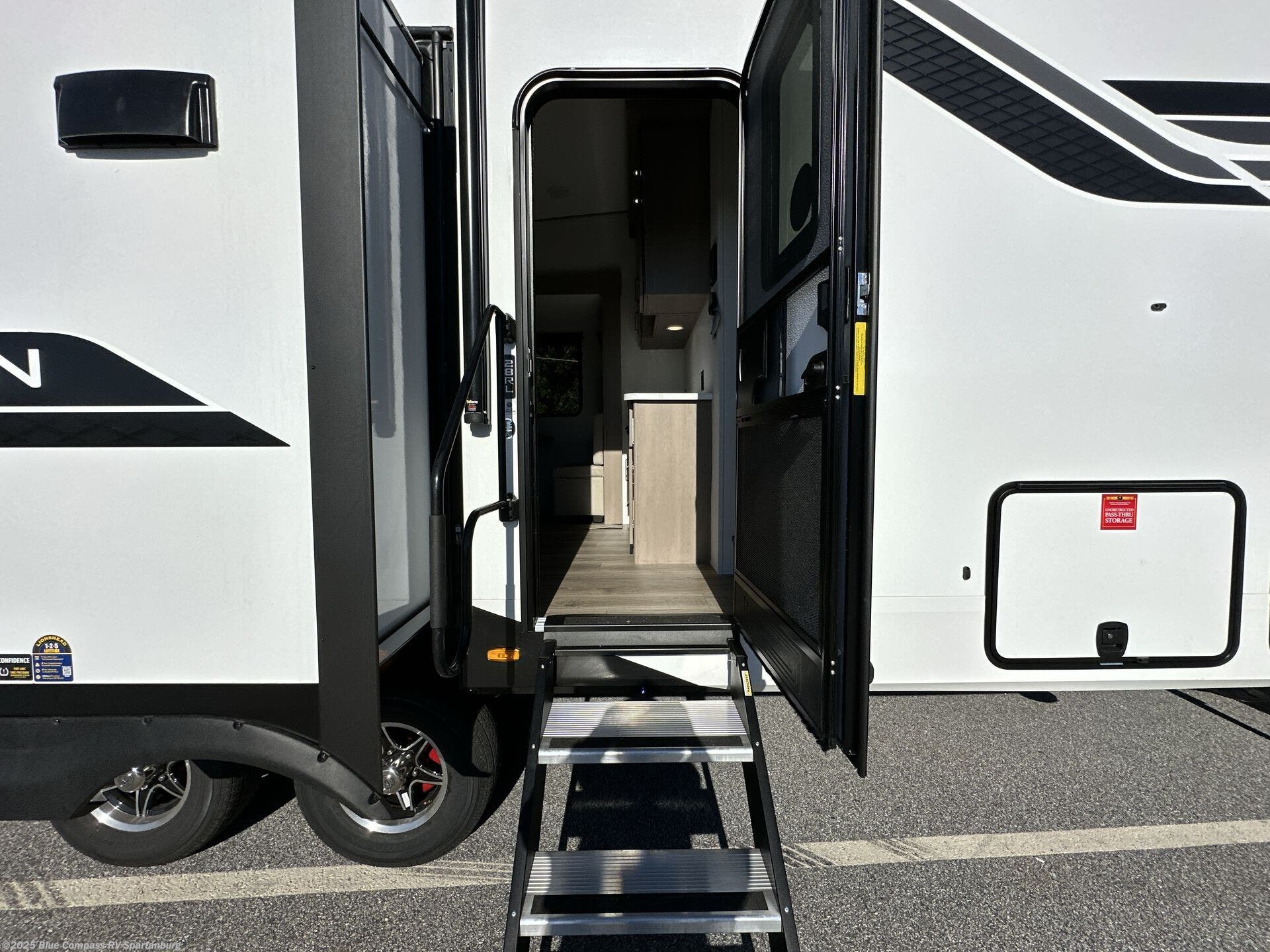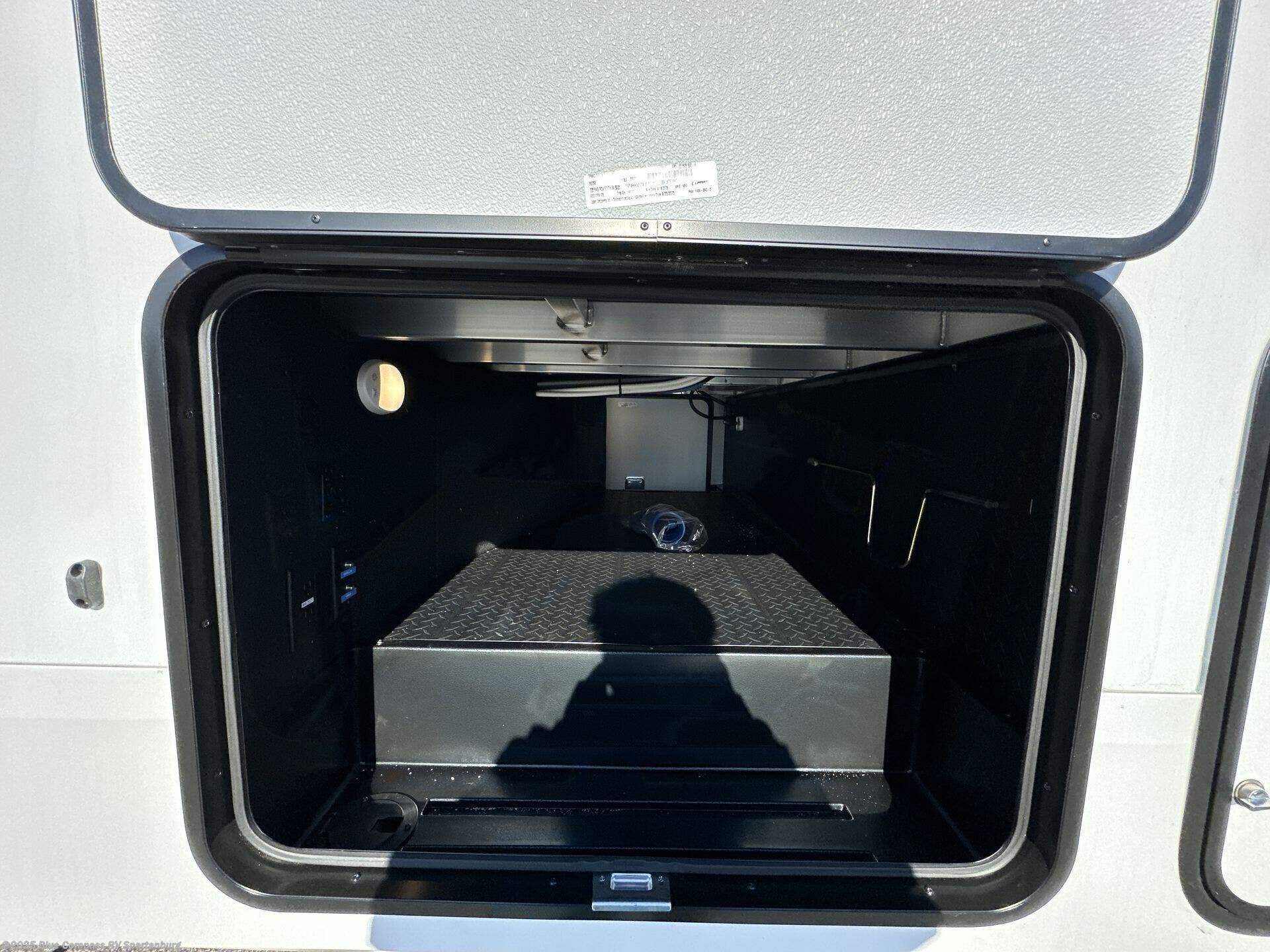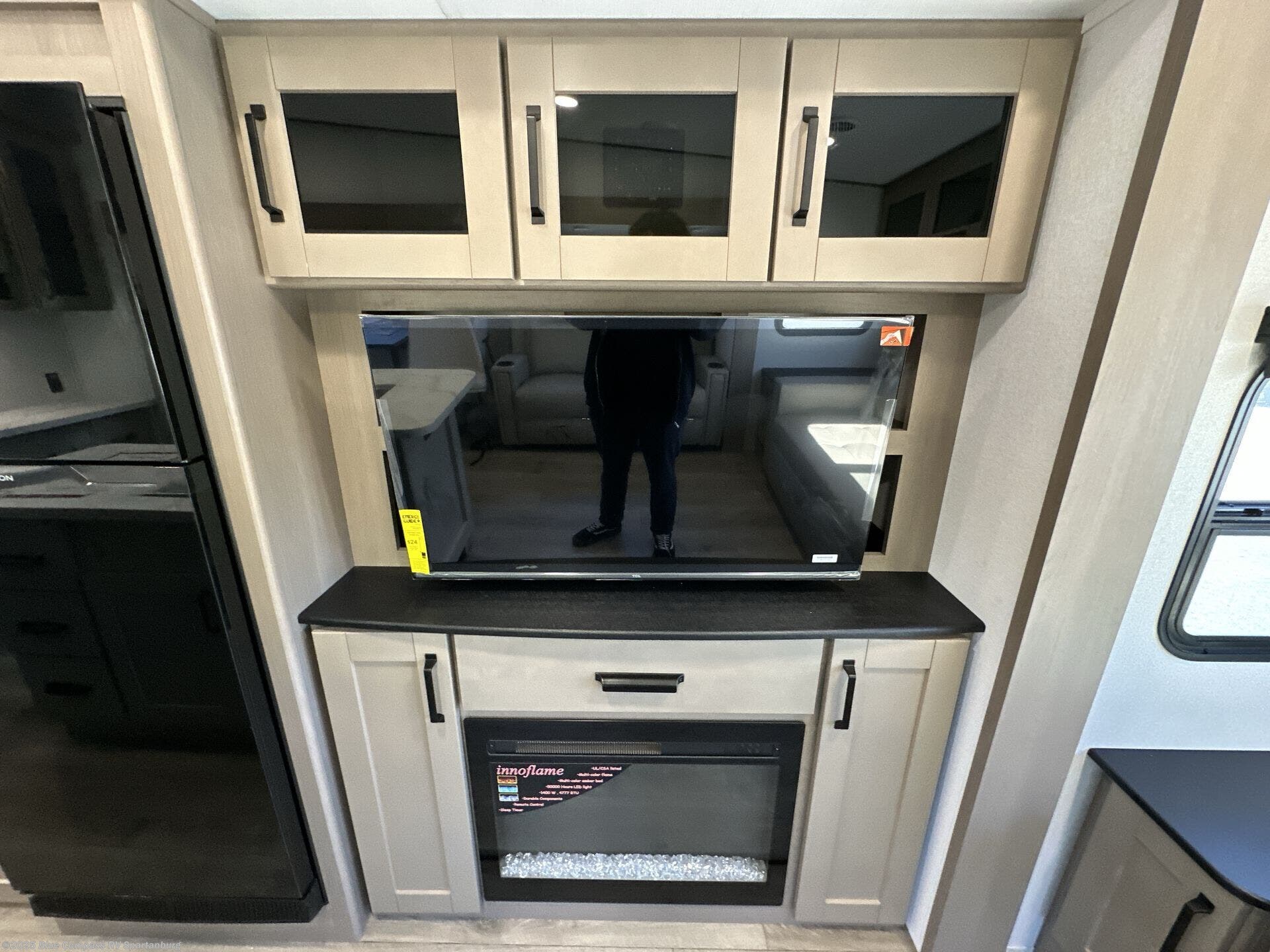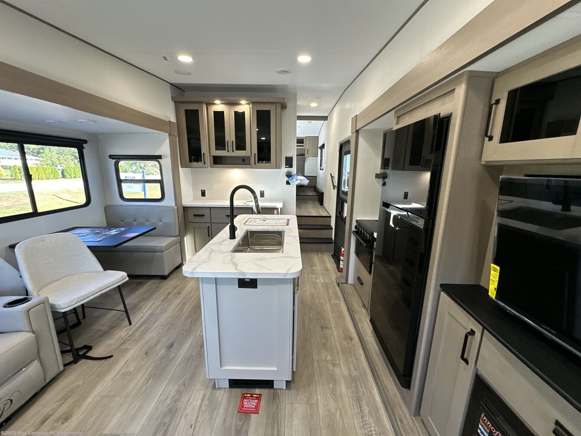 You'll love the amount of space you have in this fifth wheel thanks to the dual opposing slides in the rear living area/kitchen. Your friends and family can relax on the tri-fold sofa or theater seating across from the high-definition 40" LED TV. There is also a booth dinette or you can choose the optional swivel dinette if you prefer that seating. The chef of your group will appreciate having a kitchen island that will provide more counter space, plus there is a hutch with overhead cabinets for nice dishes. A full bath onboard lets you clean up each day and the front private bedroom includes a queen bed just like at home. You'll also love spending time outdoors under the electric awning, and there is an unobstructed pass-thru storage for fishing poles, hiking gear, and camp chairs!