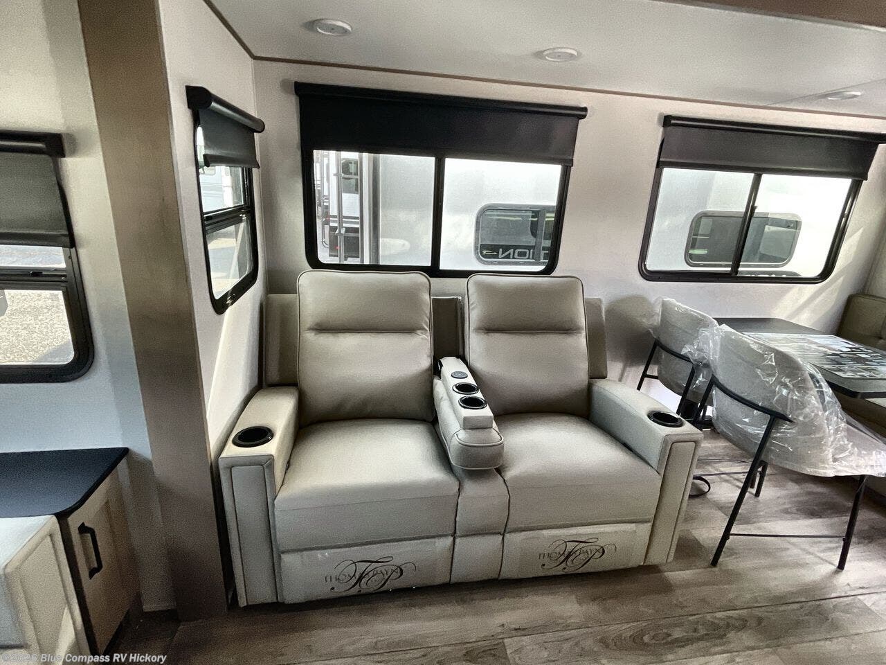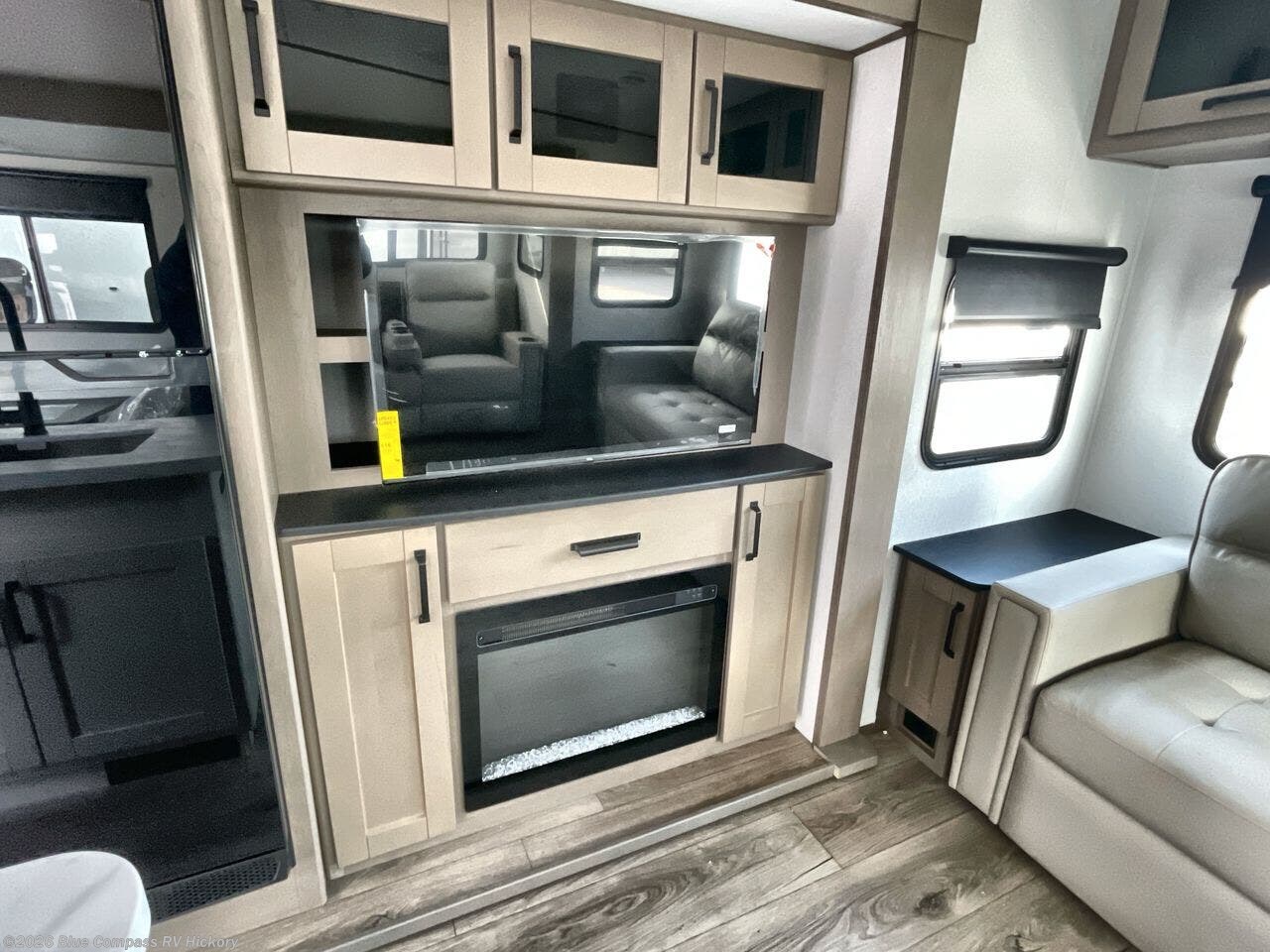 You'll love the amount of space you have in this fifth wheel thanks to the dual opposing slides in the rear living area/kitchen. Your friends and family can relax on the tri-fold sofa or theater seating across from the high-definition 40" LED TV. There is also a booth dinette or you can choose the optional swivel dinette if you prefer that seating. The chef of your group will appreciate having a kitchen island that will provide more counter space, plus there is a hutch with overhead cabinets for nice dishes. A full bath onboard lets you clean up each day and the front private bedroom includes a queen bed just like at home. You'll also love spending time outdoors under the electric awning, and there is an unobstructed pass-thru storage for fishing poles, hiking gear, and camp chairs!