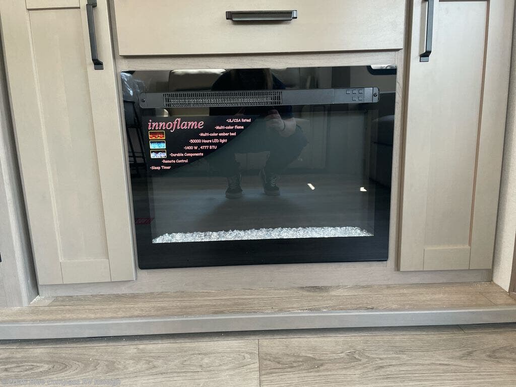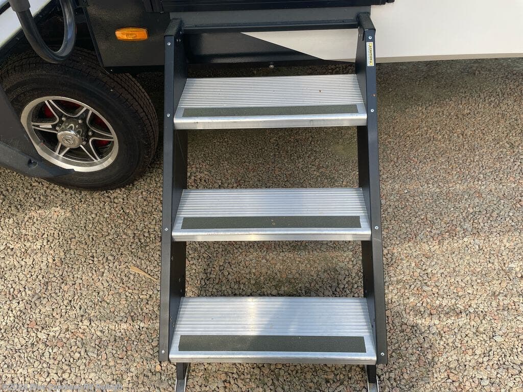 You'll love the amount of space you have in this fifth wheel thanks to the dual opposing slides in the rear living area/kitchen. Your friends and family can relax on the tri-fold sofa or theater seating across from the high-definition 40" LED TV. There is also a booth dinette or you can choose the optional swivel dinette if you prefer that seating. The chef of your group will appreciate having a kitchen island that will provide more counter space, plus there is a hutch with overhead cabinets for nice dishes. A full bath onboard lets you clean up each day and the front private bedroom includes a queen bed just like at home. You'll also love spending time outdoors under the electric awning, and there is an unobstructed pass-thru storage for fishing poles, hiking gear, and camp chairs!