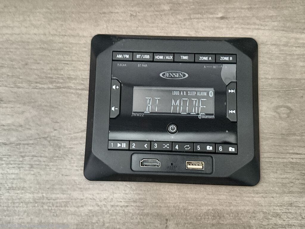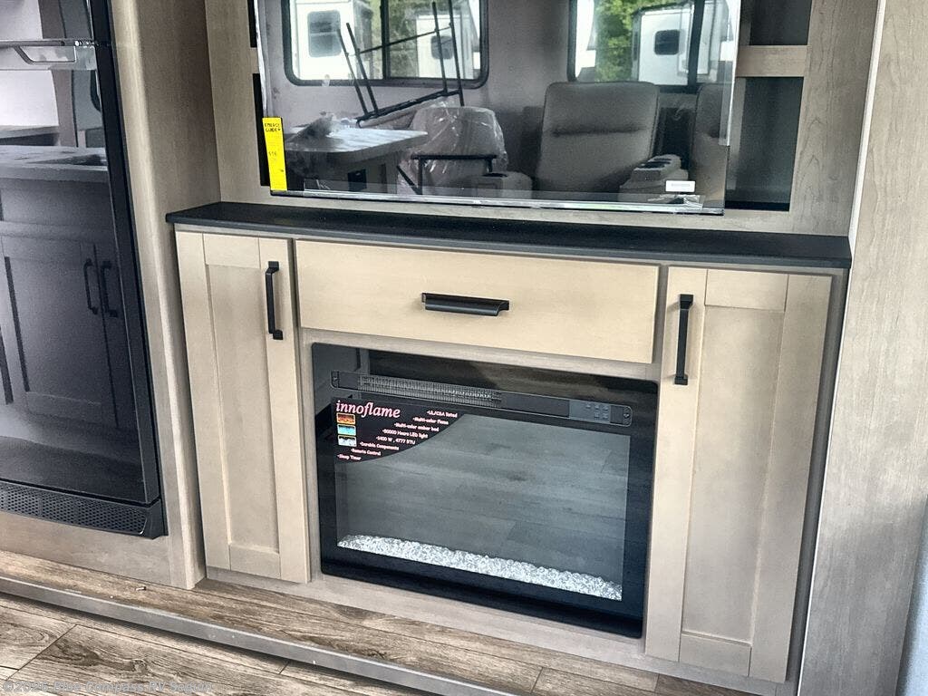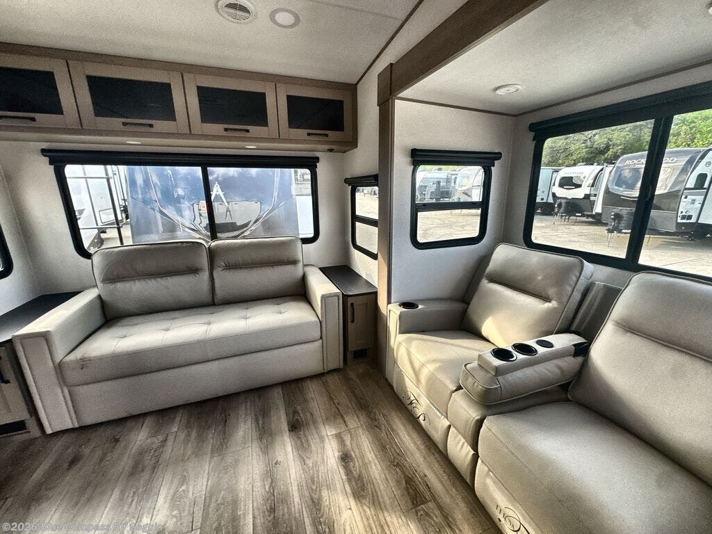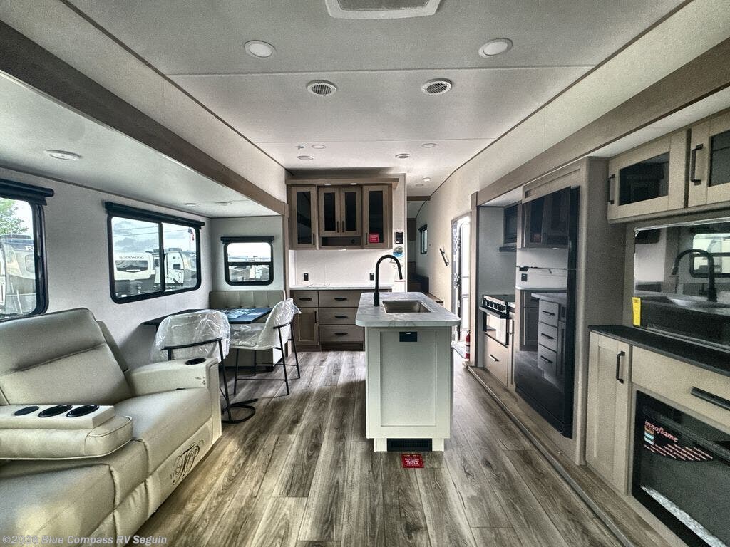 You'll love the amount of space you have in this fifth wheel thanks to the dual opposing slides in the rear living area/kitchen. Your friends and family can relax on the tri-fold sofa or theater seating across from the high-definition 40" LED TV. There is also a booth dinette or you can choose the optional swivel dinette if you prefer that seating. The chef of your group will appreciate having a kitchen island that will provide more counter space, plus there is a hutch with overhead cabinets for nice dishes. A full bath onboard lets you clean up each day and the front private bedroom includes a queen bed just like at home. You'll also love spending time outdoors under the electric awning, and there is an unobstructed pass-thru storage for fishing poles, hiking gear, and camp chairs!