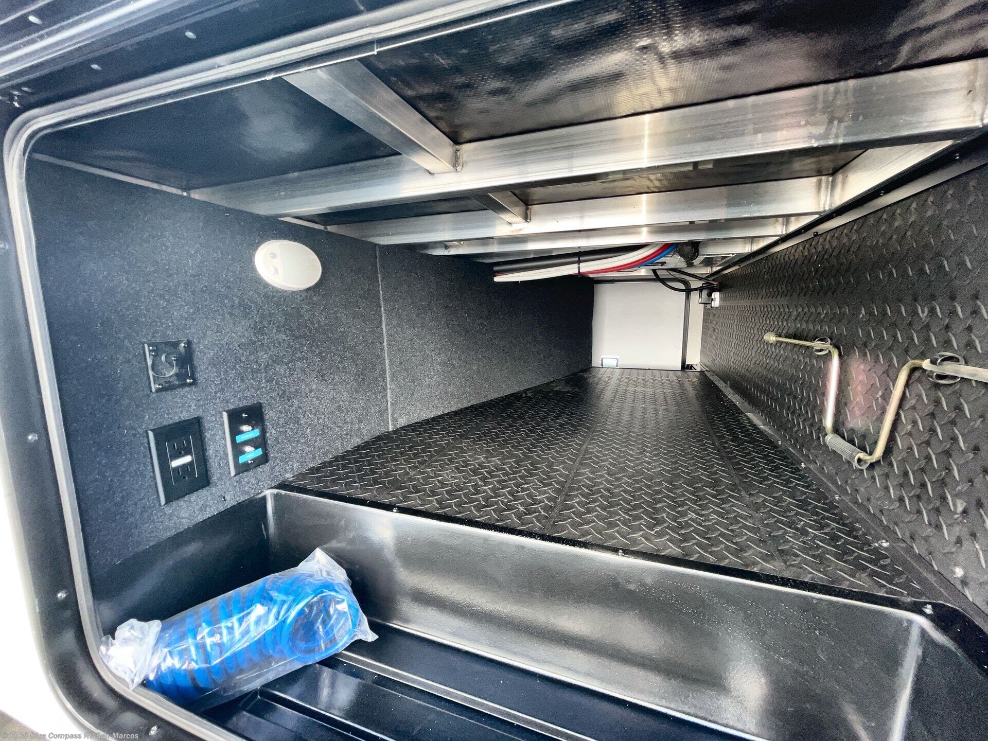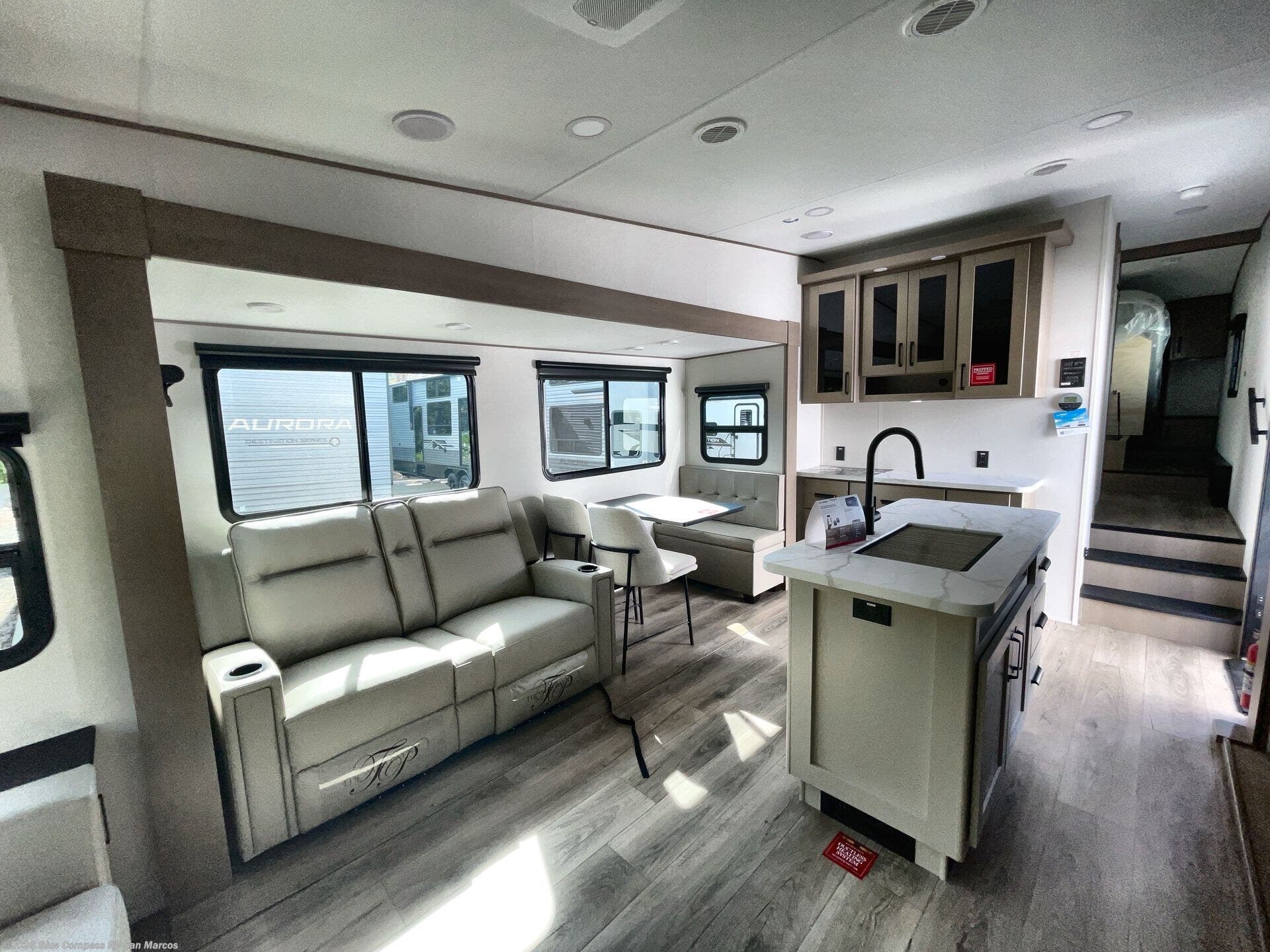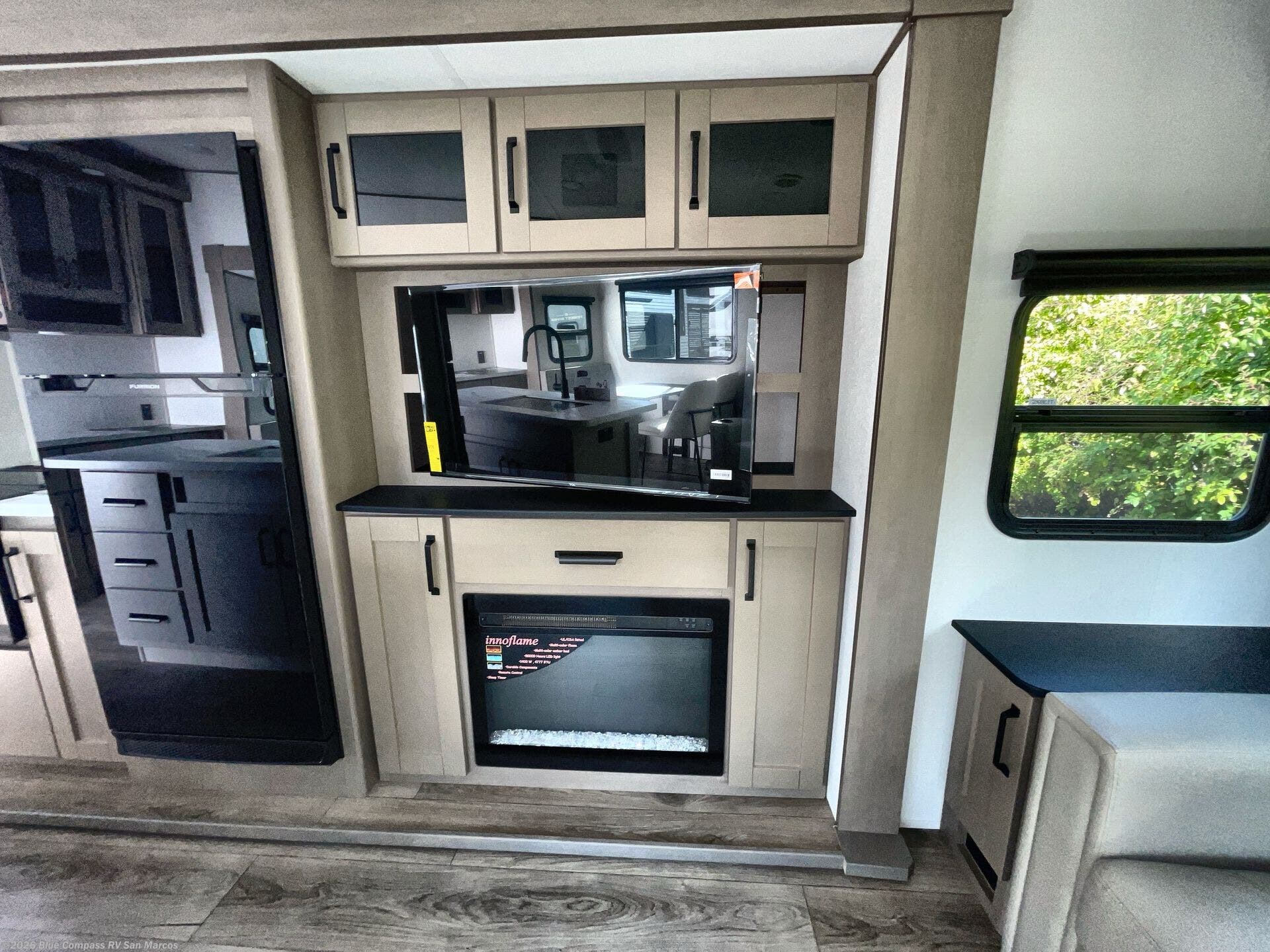 You'll love the amount of space you have in this fifth wheel thanks to the dual opposing slides in the rear living area/kitchen. Your friends and family can relax on the tri-fold sofa or theater seating across from the high-definition 40" LED TV. There is also a booth dinette or you can choose the optional swivel dinette if you prefer that seating. The chef of your group will appreciate having a kitchen island that will provide more counter space, plus there is a hutch with overhead cabinets for nice dishes. A full bath onboard lets you clean up each day and the front private bedroom includes a queen bed just like at home. You'll also love spending time outdoors under the electric awning, and there is an unobstructed pass-thru storage for fishing poles, hiking gear, and camp chairs!