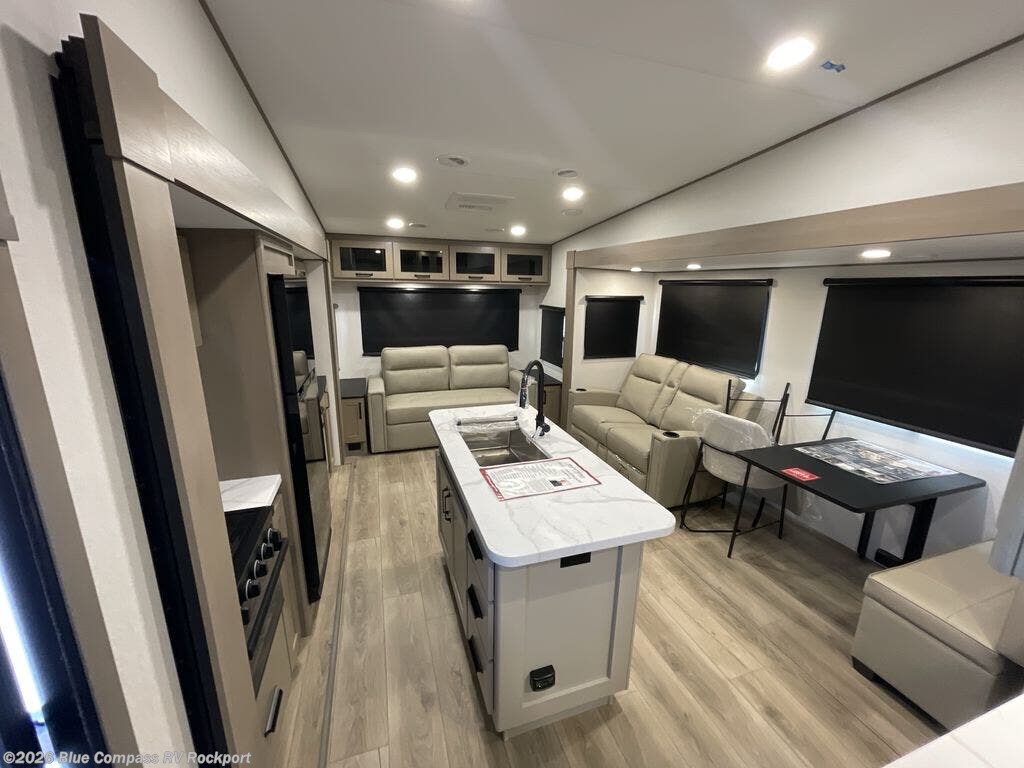 You'll love the amount of space you have in this fifth wheel thanks to the dual opposing slides in the rear living area/kitchen. Your friends and family can relax on the tri-fold sofa or theater seating across from the high-definition 40" LED TV. There is also a booth dinette or you can choose the optional swivel dinette if you prefer that seating. The chef of your group will appreciate having a kitchen island that will provide more counter space, plus there is a hutch with overhead cabinets for nice dishes. A full bath onboard lets you clean up each day and the front private bedroom includes a queen bed just like at home. You'll also love spending time outdoors under the electric awning, and there is an unobstructed pass-thru storage for fishing poles, hiking gear, and camp chairs!