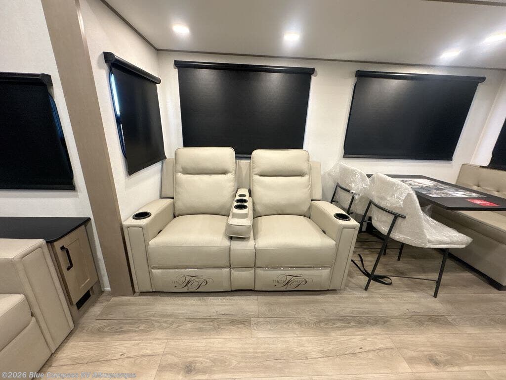 You'll love the amount of space you have in this fifth wheel thanks to the dual opposing slides in the rear living area/kitchen. Your friends and family can relax on the tri-fold sofa or theater seating across from the high-definition 40" LED TV. There is also a booth dinette or you can choose the optional swivel dinette if you prefer that seating. The chef of your group will appreciate having a kitchen island that will provide more counter space, plus there is a hutch with overhead cabinets for nice dishes. A full bath onboard lets you clean up each day and the front private bedroom includes a queen bed just like at home. You'll also love spending time outdoors under the electric awning, and there is an unobstructed pass-thru storage for fishing poles, hiking gear, and camp chairs!