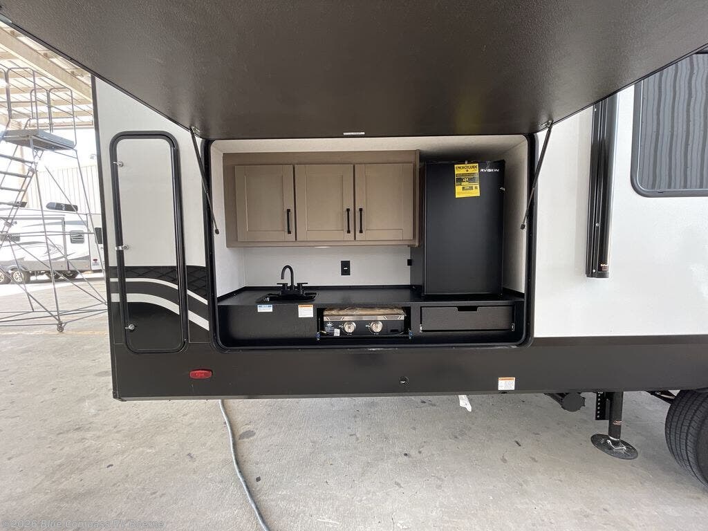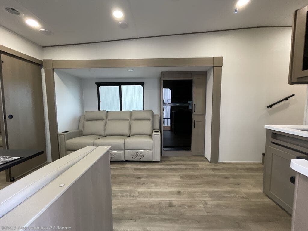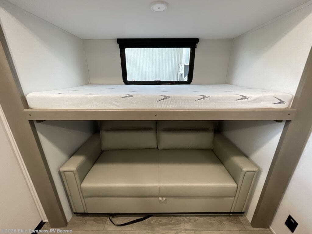 You will love this fifth wheel’s multiple sleeping spaces, such as the 36” flip top bunk offers flexible sleeping options for added capacity and comfort. A trundle bed provides an additional cozy sleeping space, ideal for guests or family members, and the 44” bunk bed with window features a comfortable sleeping area with natural light, ideal for kids or relaxation. Plus, the front bedroom boasts a queen bed, creating a peaceful retreat for rest and rejuvenation. In the living area, you will find a space that creates a warm and intimate spot for meals and conversation. The 40” TV delivers entertainment for relaxation and enjoyment, a theater seating provides immersive comfort for an exceptional viewing experience, and the well-appointed kitchen features a 10 cu ft refrigerator that ensures ample storage for fresh ingredients and beverages, a pantry, microwave, and a three-burner cooktop allows for versatile meal preparation. Finally, the full bathroom will complete the at-home experience, adding convenience to this model.
