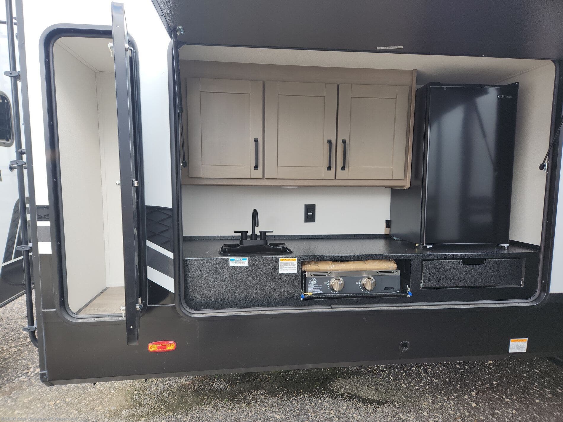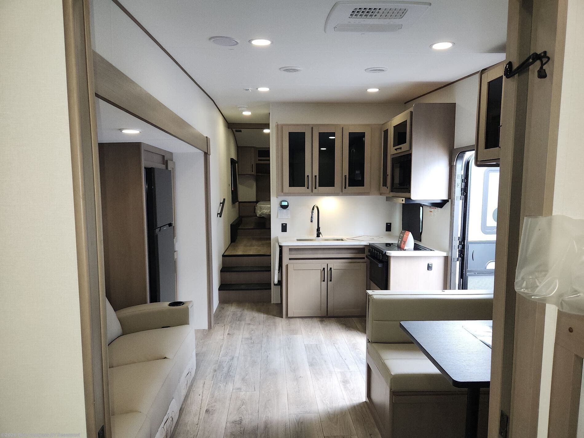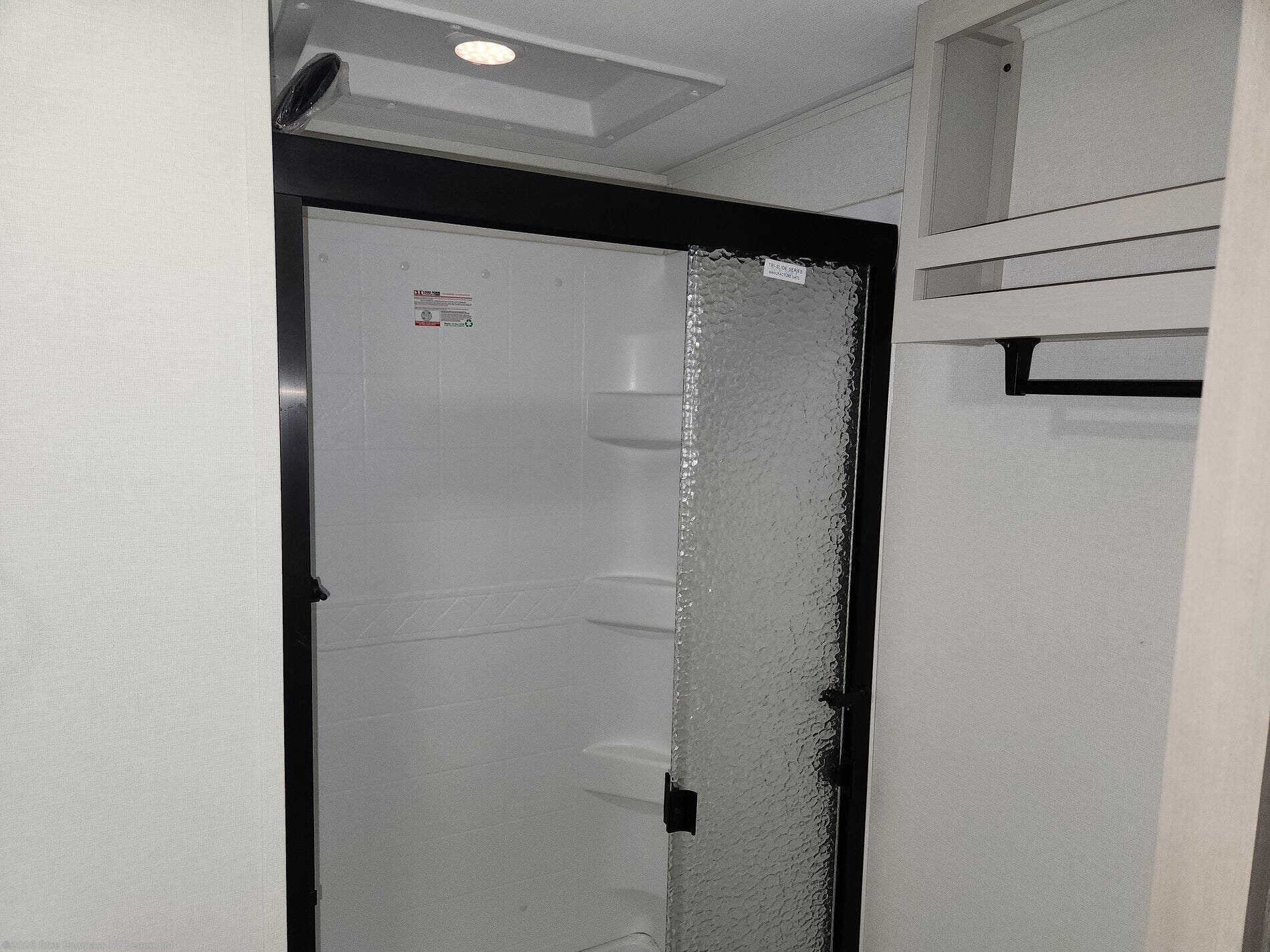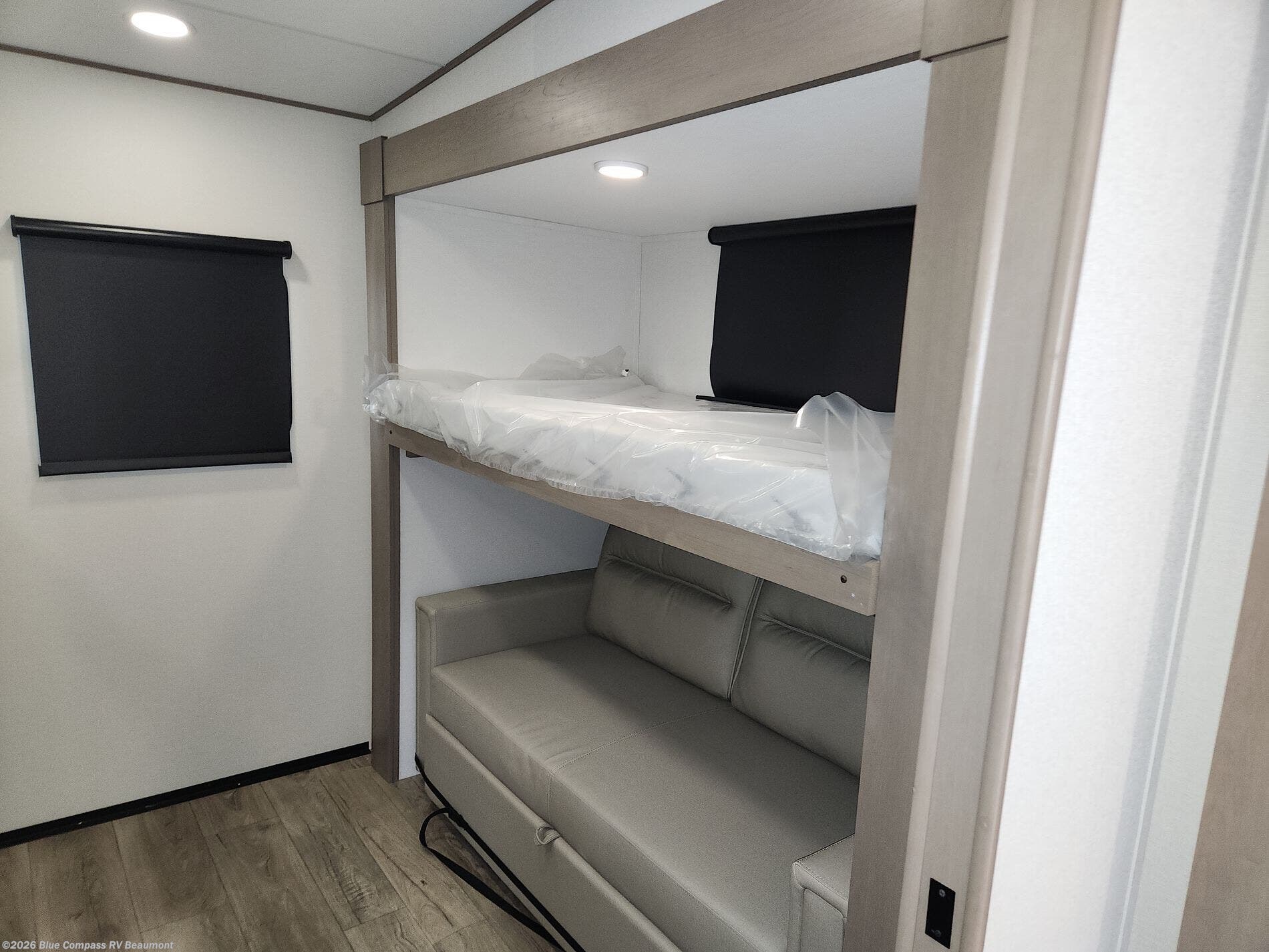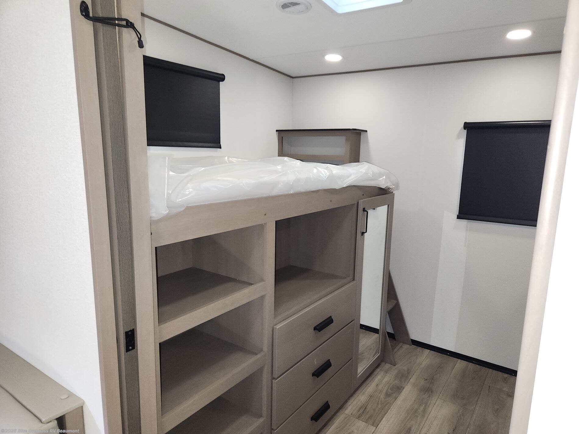 You will love this fifth wheel’s multiple sleeping spaces, such as the 36” flip top bunk offers flexible sleeping options for added capacity and comfort. A trundle bed provides an additional cozy sleeping space, ideal for guests or family members, and the 44” bunk bed with window features a comfortable sleeping area with natural light, ideal for kids or relaxation. Plus, the front bedroom boasts a queen bed, creating a peaceful retreat for rest and rejuvenation. In the living area, you will find a space that creates a warm and intimate spot for meals and conversation. The 40” TV delivers entertainment for relaxation and enjoyment, a theater seating provides immersive comfort for an exceptional viewing experience, and the well-appointed kitchen features a 10 cu ft refrigerator that ensures ample storage for fresh ingredients and beverages, a pantry, microwave, and a three-burner cooktop allows for versatile meal preparation. Finally, the full bathroom will complete the at-home experience, adding convenience to this model.