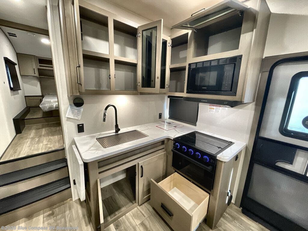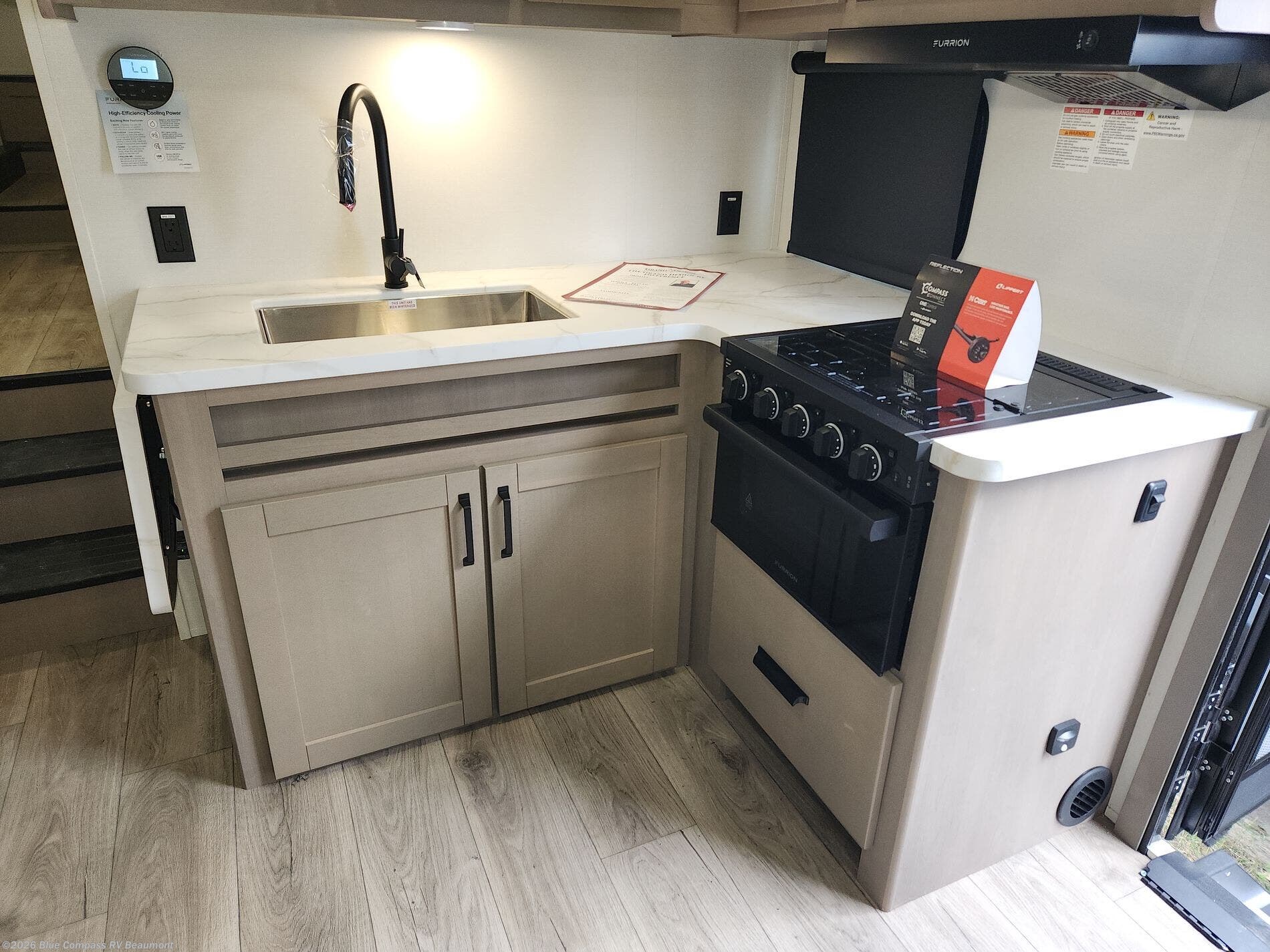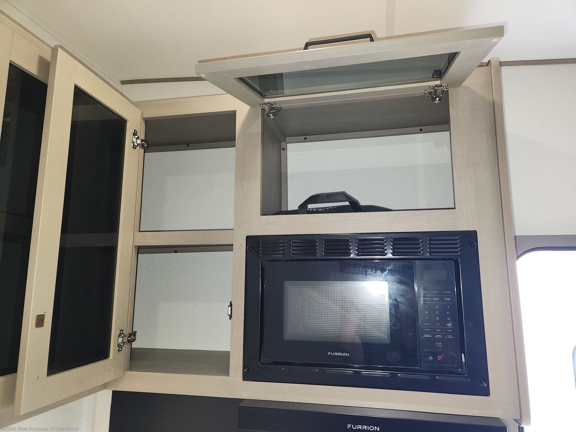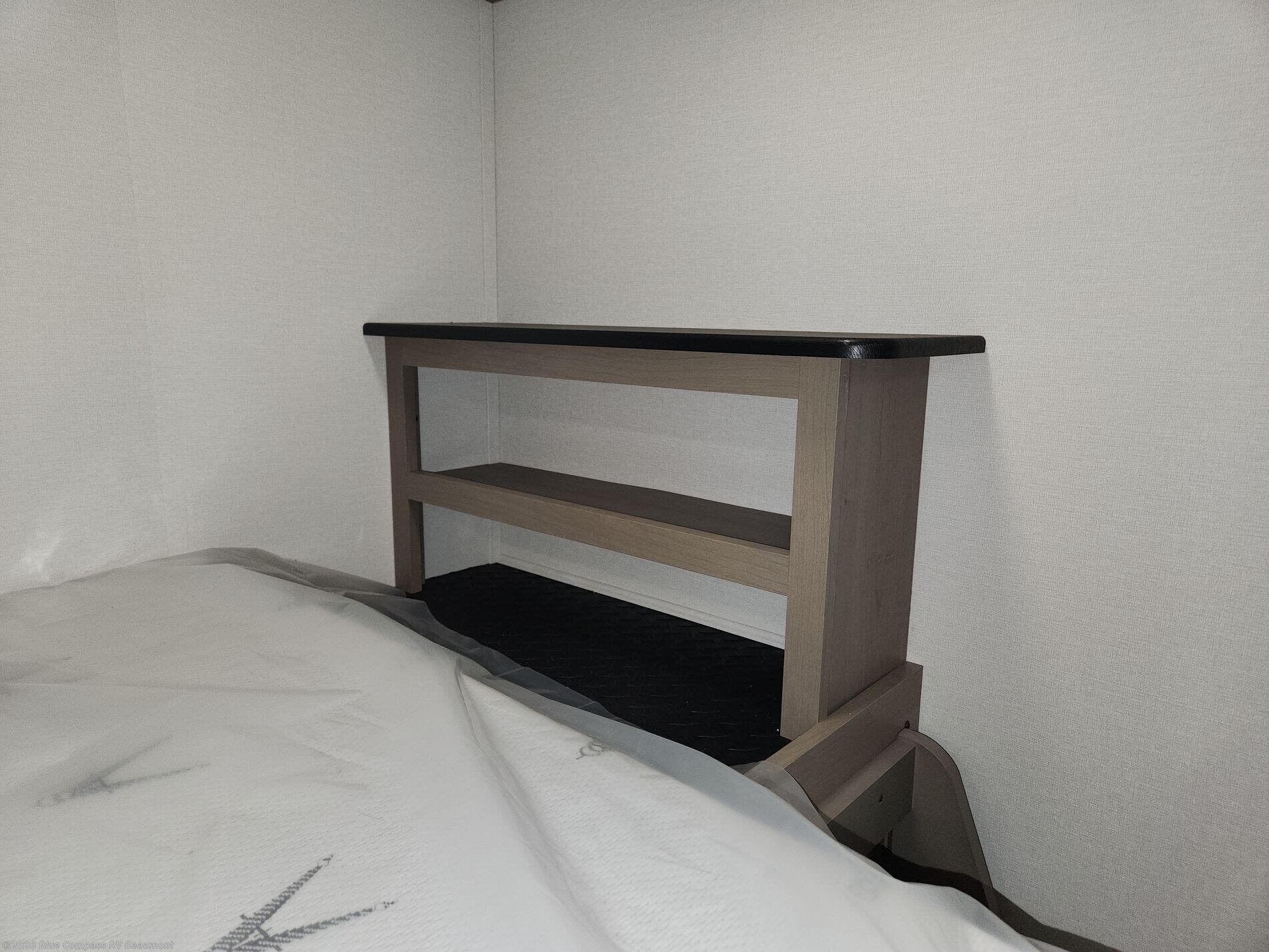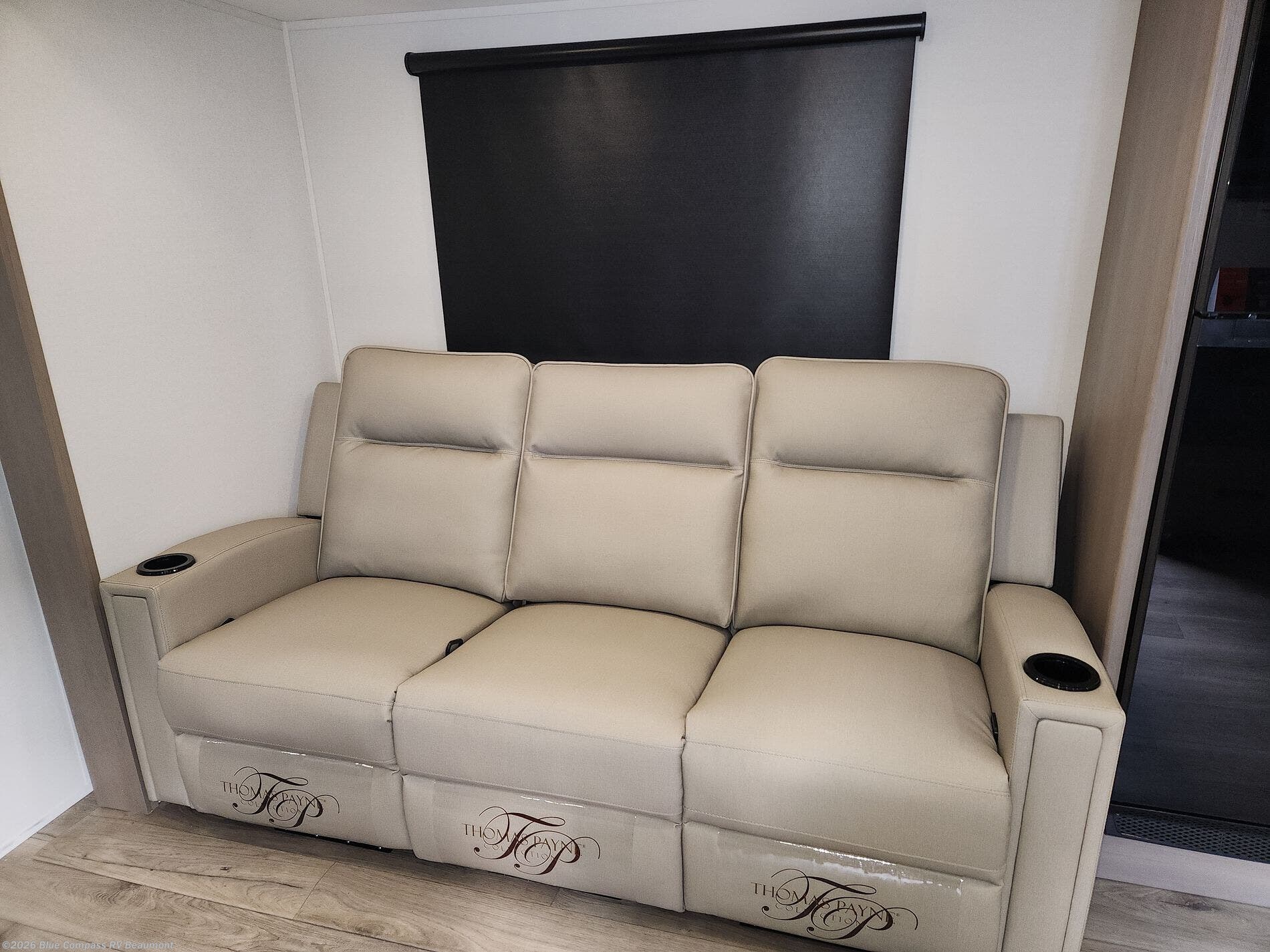 You will love this fifth wheel’s multiple sleeping spaces, such as the 36” flip top bunk offers flexible sleeping options for added capacity and comfort. A trundle bed provides an additional cozy sleeping space, ideal for guests or family members, and the 44” bunk bed with window features a comfortable sleeping area with natural light, ideal for kids or relaxation. Plus, the front bedroom boasts a queen bed, creating a peaceful retreat for rest and rejuvenation. In the living area, you will find a space that creates a warm and intimate spot for meals and conversation. The 40” TV delivers entertainment for relaxation and enjoyment, a theater seating provides immersive comfort for an exceptional viewing experience, and the well-appointed kitchen features a 10 cu ft refrigerator that ensures ample storage for fresh ingredients and beverages, a pantry, microwave, and a three-burner cooktop allows for versatile meal preparation. Finally, the full bathroom will complete the at-home experience, adding convenience to this model.