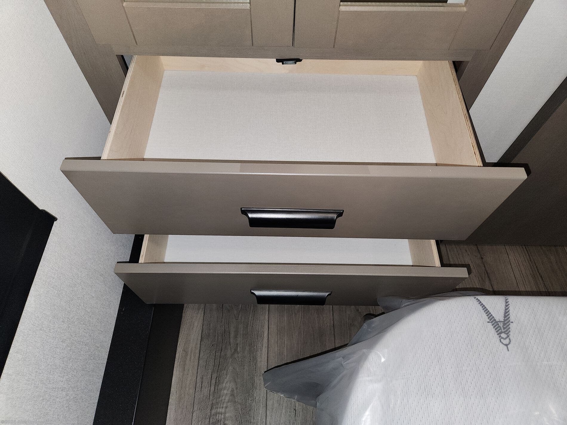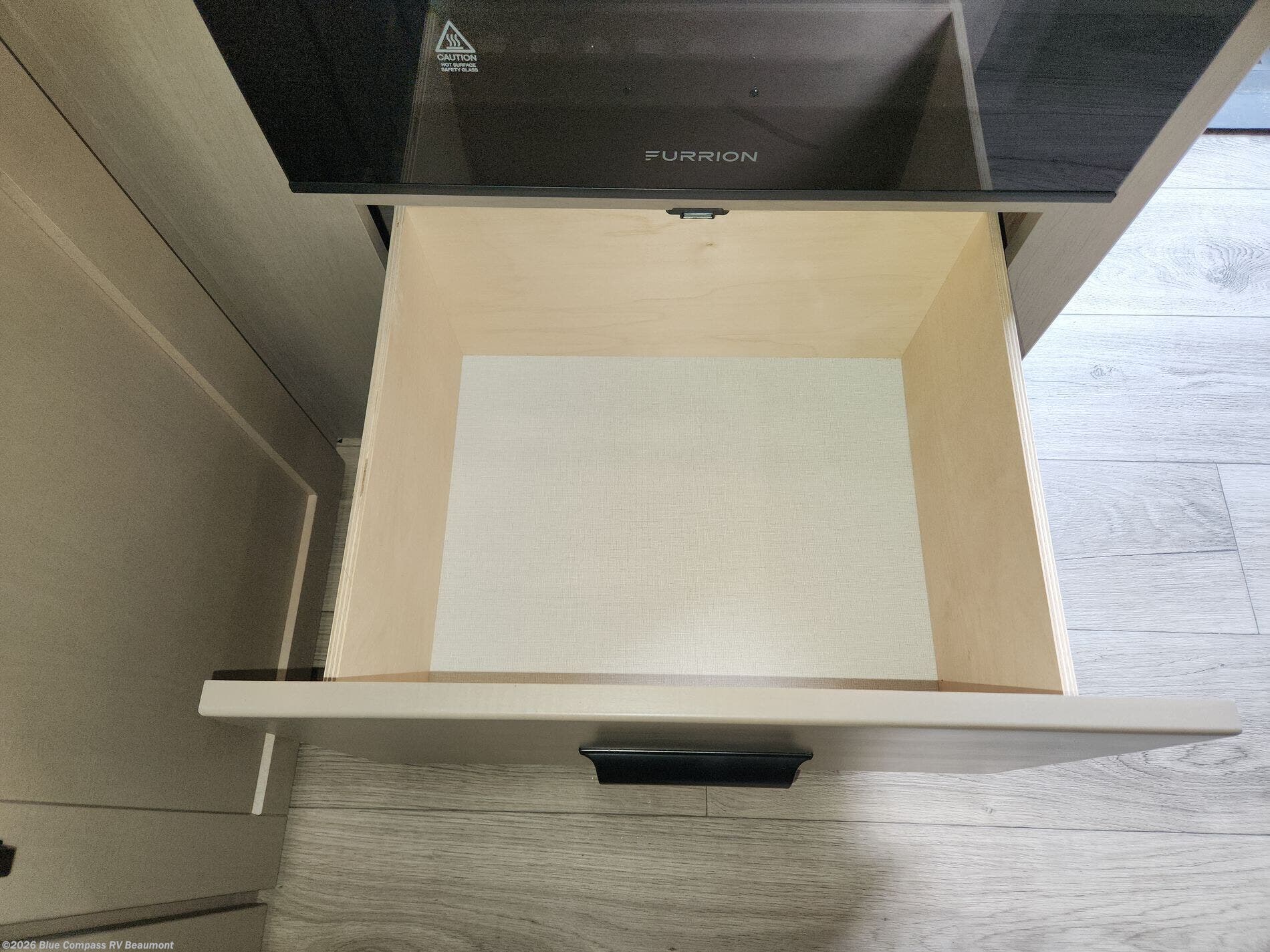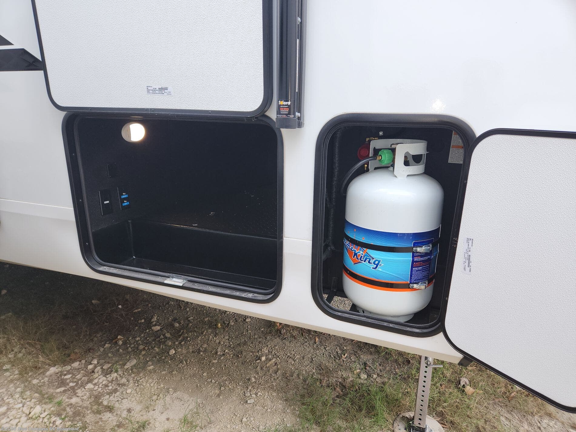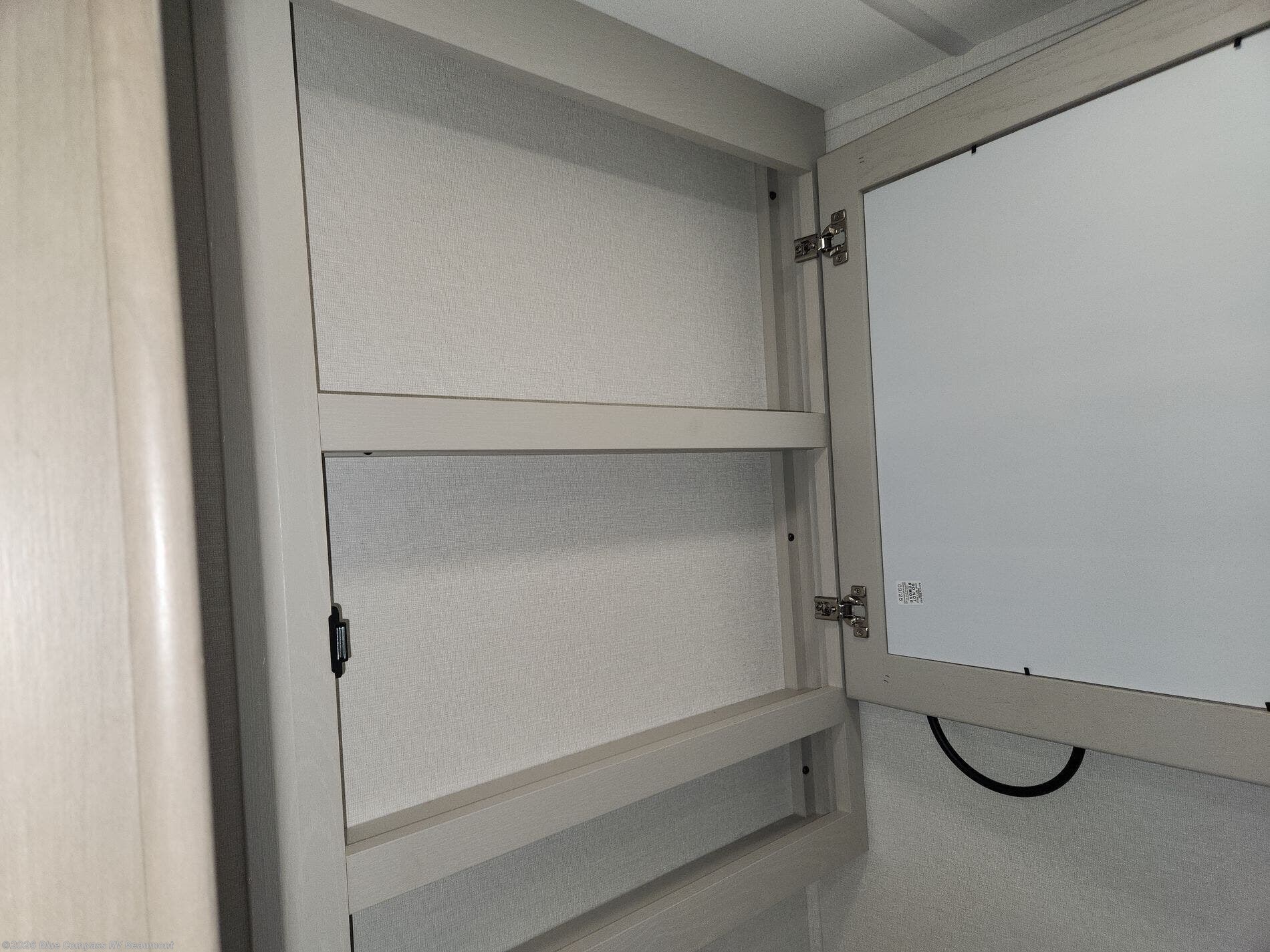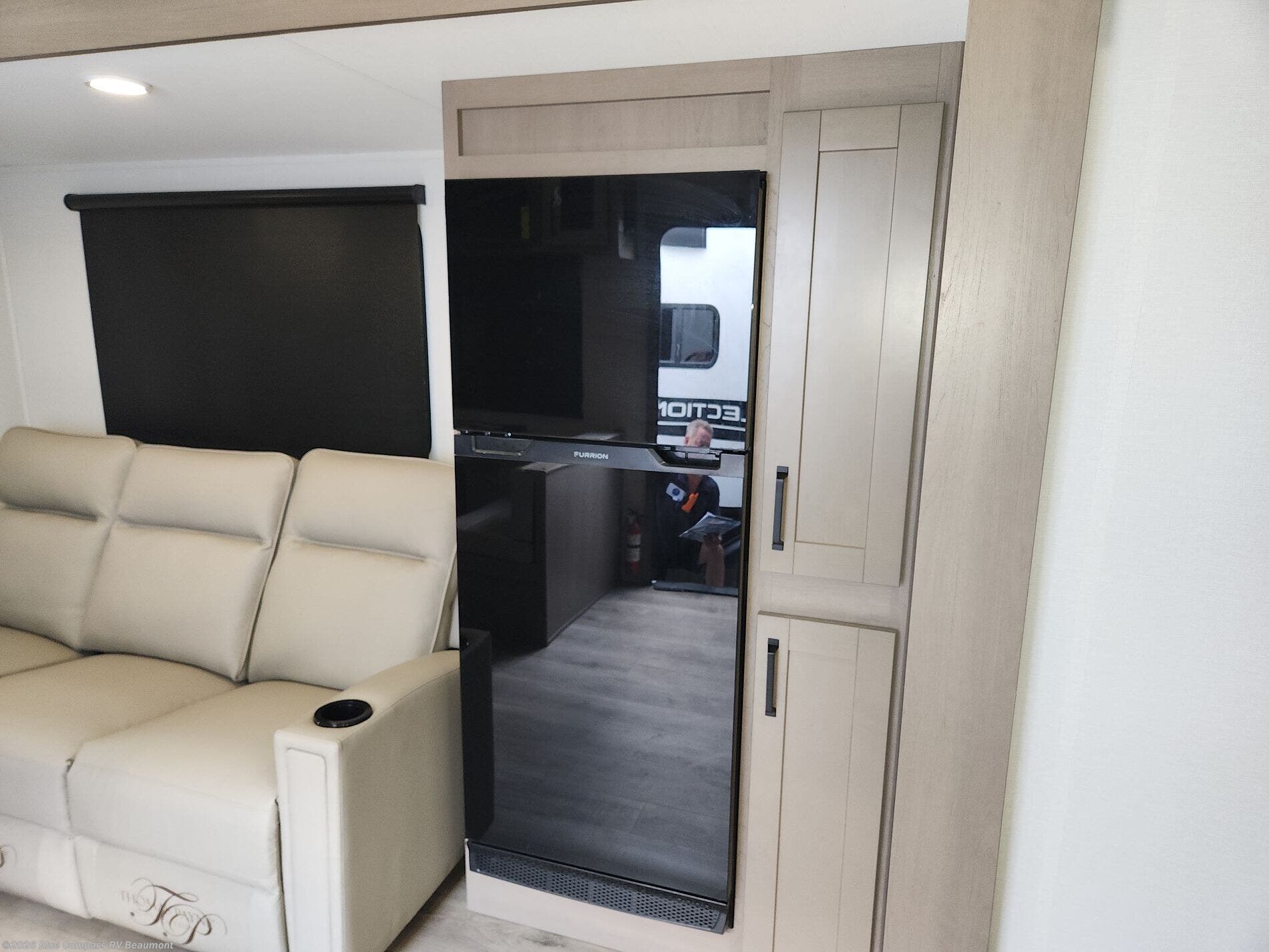 You will love this fifth wheel’s multiple sleeping spaces, such as the 36” flip top bunk offers flexible sleeping options for added capacity and comfort. A trundle bed provides an additional cozy sleeping space, ideal for guests or family members, and the 44” bunk bed with window features a comfortable sleeping area with natural light, ideal for kids or relaxation. Plus, the front bedroom boasts a queen bed, creating a peaceful retreat for rest and rejuvenation. In the living area, you will find a space that creates a warm and intimate spot for meals and conversation. The 40” TV delivers entertainment for relaxation and enjoyment, a theater seating provides immersive comfort for an exceptional viewing experience, and the well-appointed kitchen features a 10 cu ft refrigerator that ensures ample storage for fresh ingredients and beverages, a pantry, microwave, and a three-burner cooktop allows for versatile meal preparation. Finally, the full bathroom will complete the at-home experience, adding convenience to this model.