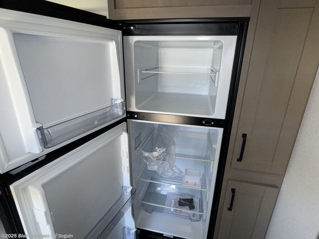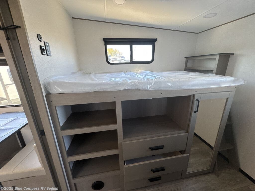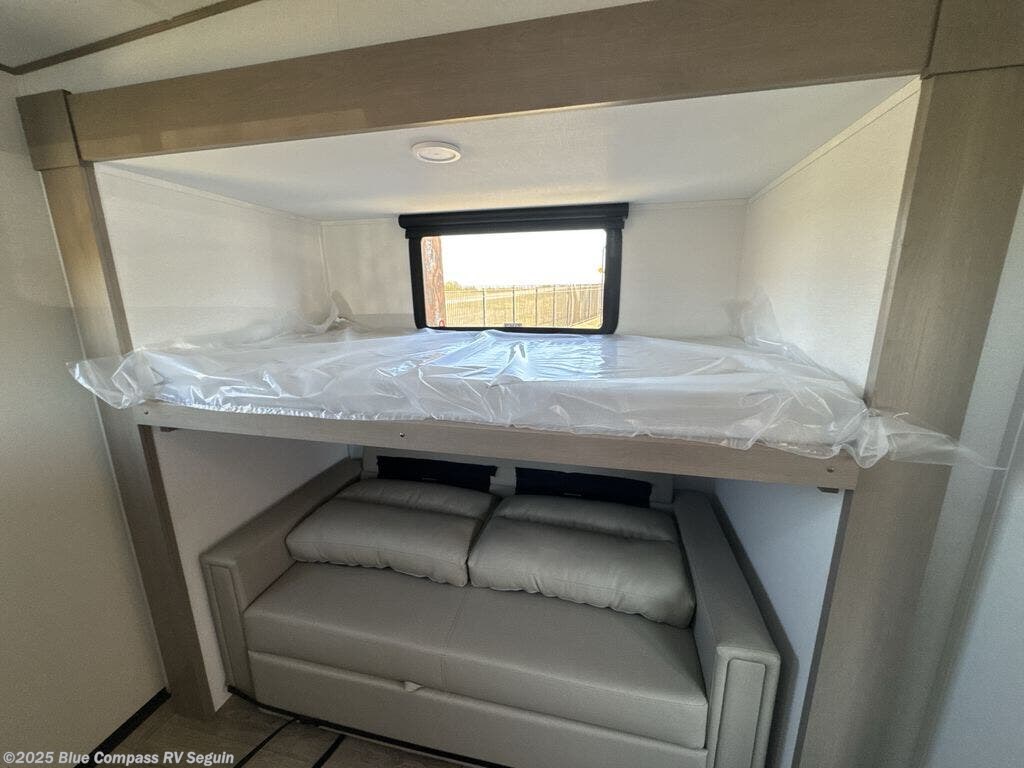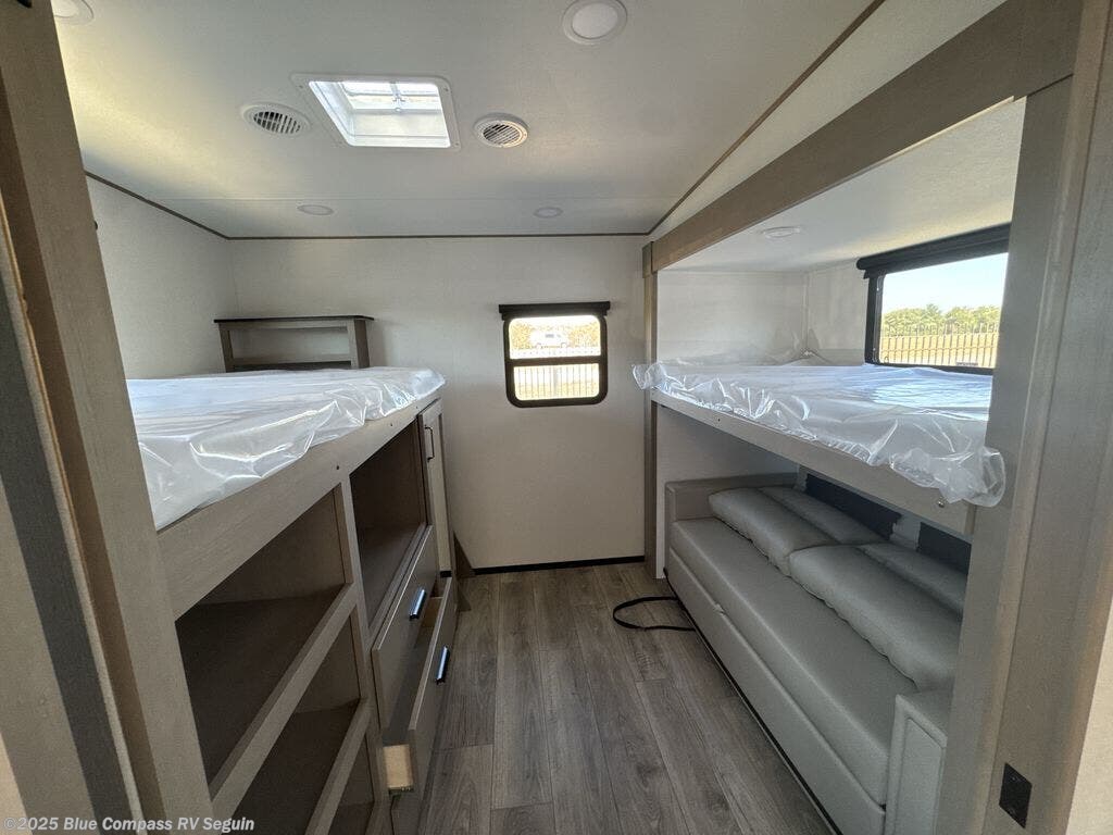 You will love this fifth wheel’s multiple sleeping spaces, such as the 36” flip top bunk offers flexible sleeping options for added capacity and comfort. A trundle bed provides an additional cozy sleeping space, ideal for guests or family members, and the 44” bunk bed with window features a comfortable sleeping area with natural light, ideal for kids or relaxation. Plus, the front bedroom boasts a queen bed, creating a peaceful retreat for rest and rejuvenation. In the living area, you will find a space that creates a warm and intimate spot for meals and conversation. The 40” TV delivers entertainment for relaxation and enjoyment, a theater seating provides immersive comfort for an exceptional viewing experience, and the well-appointed kitchen features a 10 cu ft refrigerator that ensures ample storage for fresh ingredients and beverages, a pantry, microwave, and a three-burner cooktop allows for versatile meal preparation. Finally, the full bathroom will complete the at-home experience, adding convenience to this model.