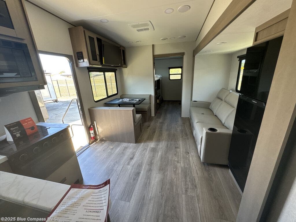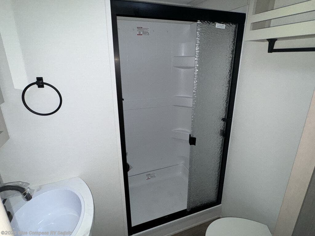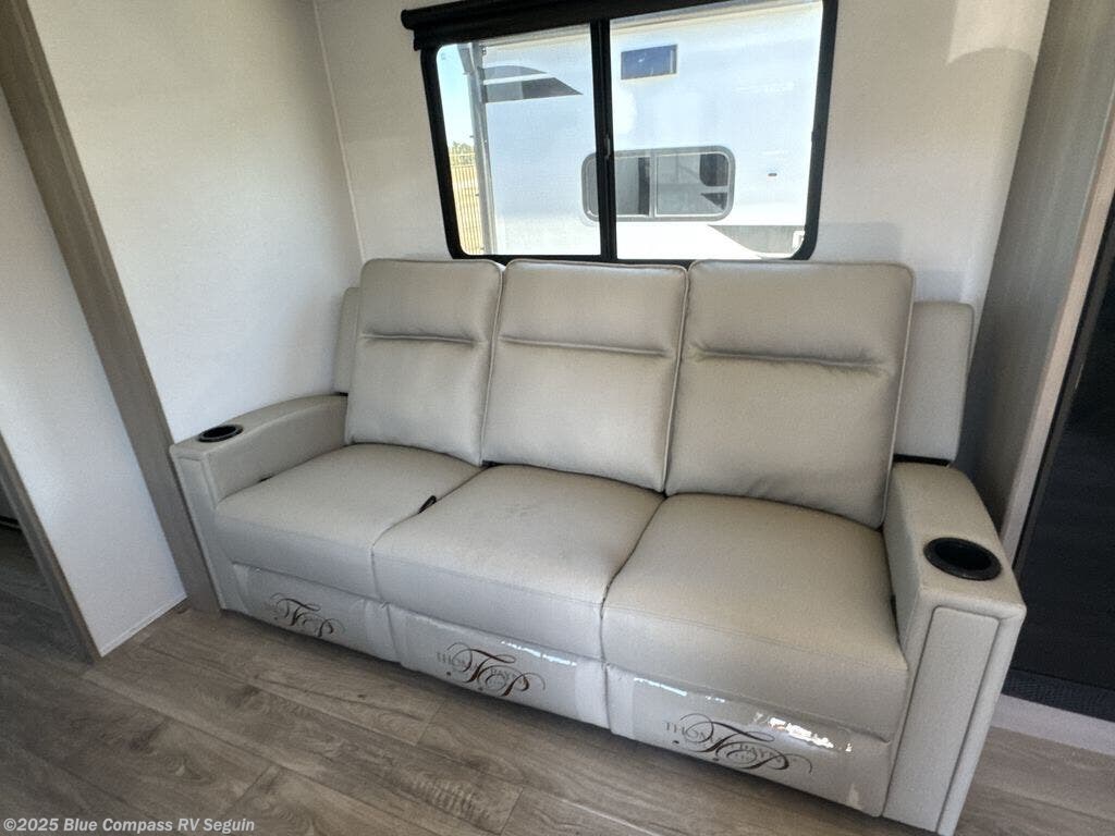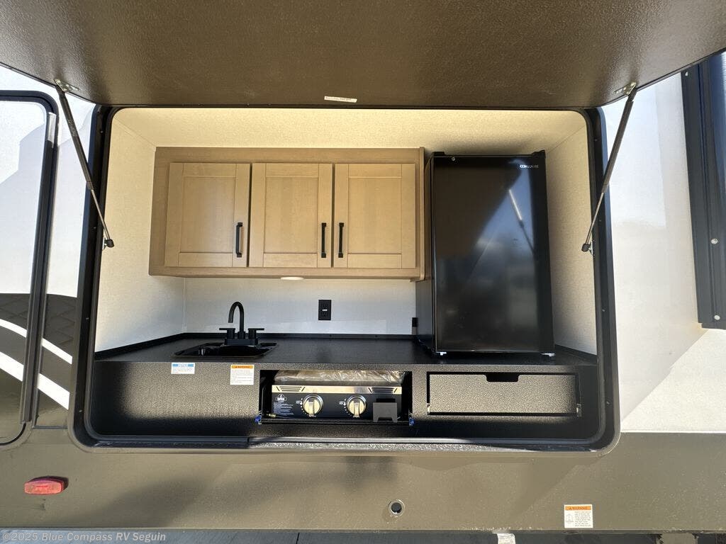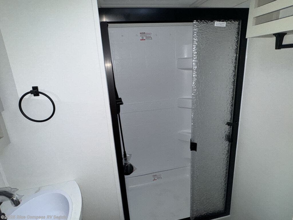 You will love this fifth wheel’s multiple sleeping spaces, such as the 36” flip top bunk offers flexible sleeping options for added capacity and comfort. A trundle bed provides an additional cozy sleeping space, ideal for guests or family members, and the 44” bunk bed with window features a comfortable sleeping area with natural light, ideal for kids or relaxation. Plus, the front bedroom boasts a queen bed, creating a peaceful retreat for rest and rejuvenation. In the living area, you will find a space that creates a warm and intimate spot for meals and conversation. The 40” TV delivers entertainment for relaxation and enjoyment, a theater seating provides immersive comfort for an exceptional viewing experience, and the well-appointed kitchen features a 10 cu ft refrigerator that ensures ample storage for fresh ingredients and beverages, a pantry, microwave, and a three-burner cooktop allows for versatile meal preparation. Finally, the full bathroom will complete the at-home experience, adding convenience to this model.