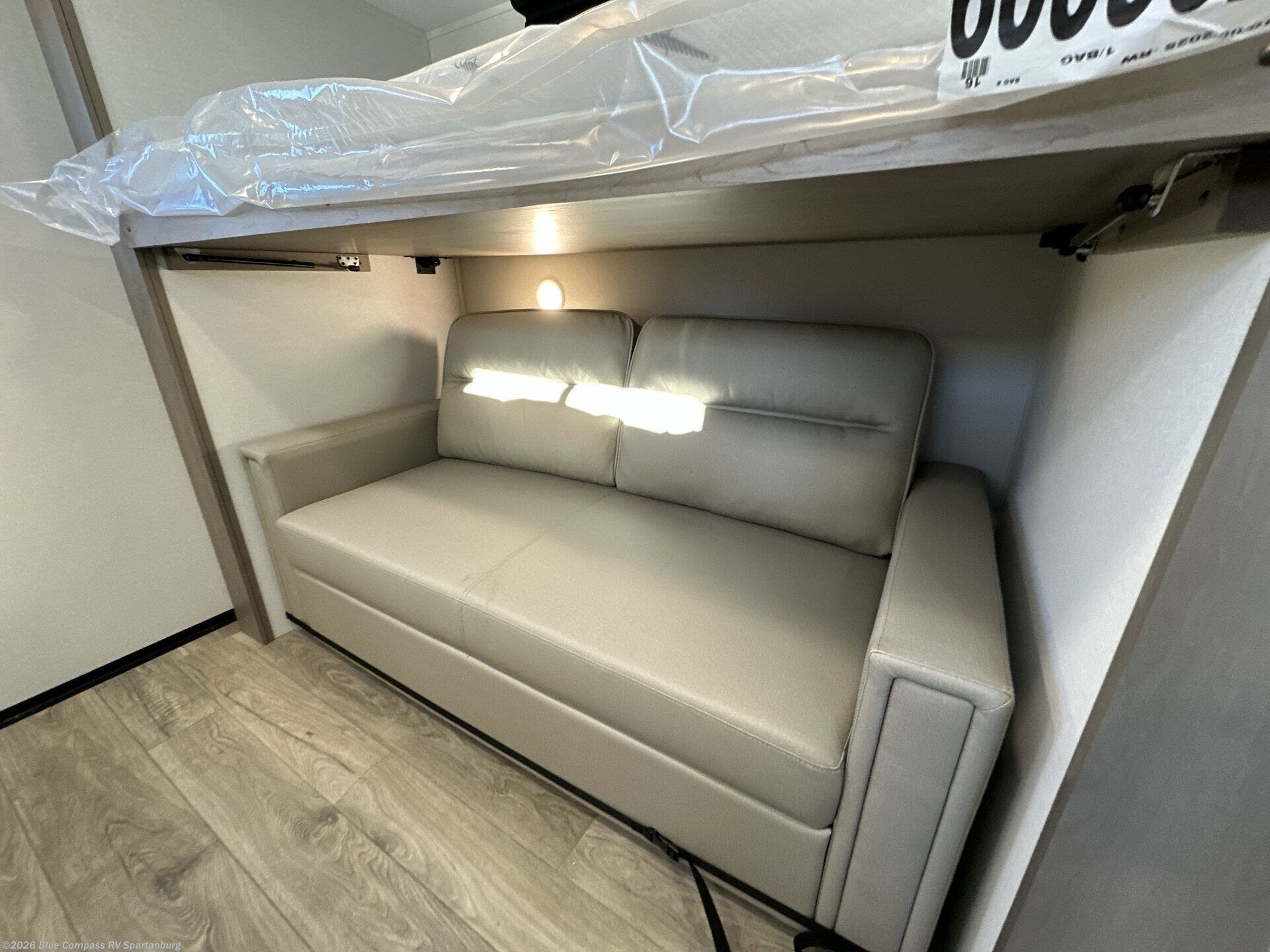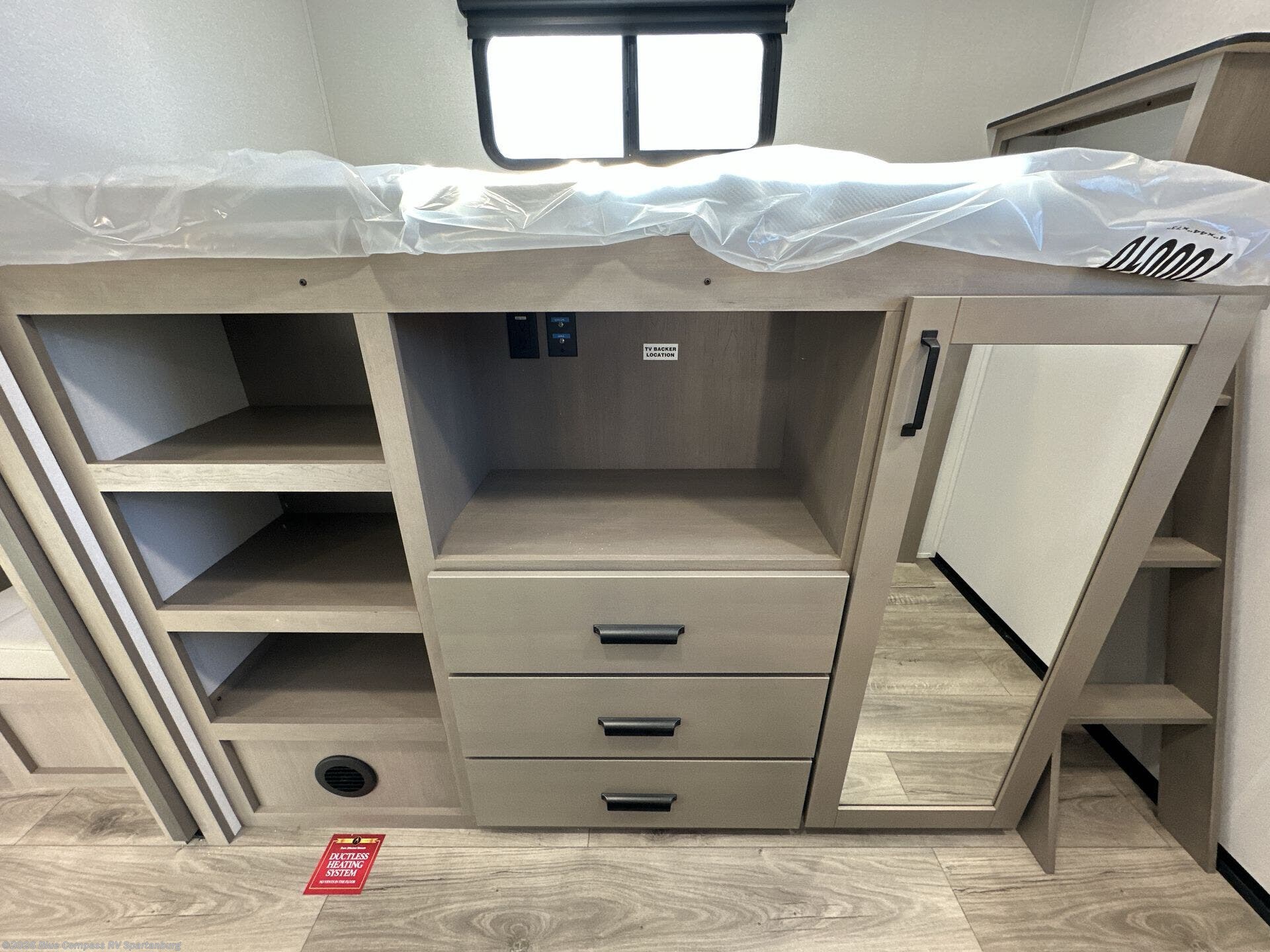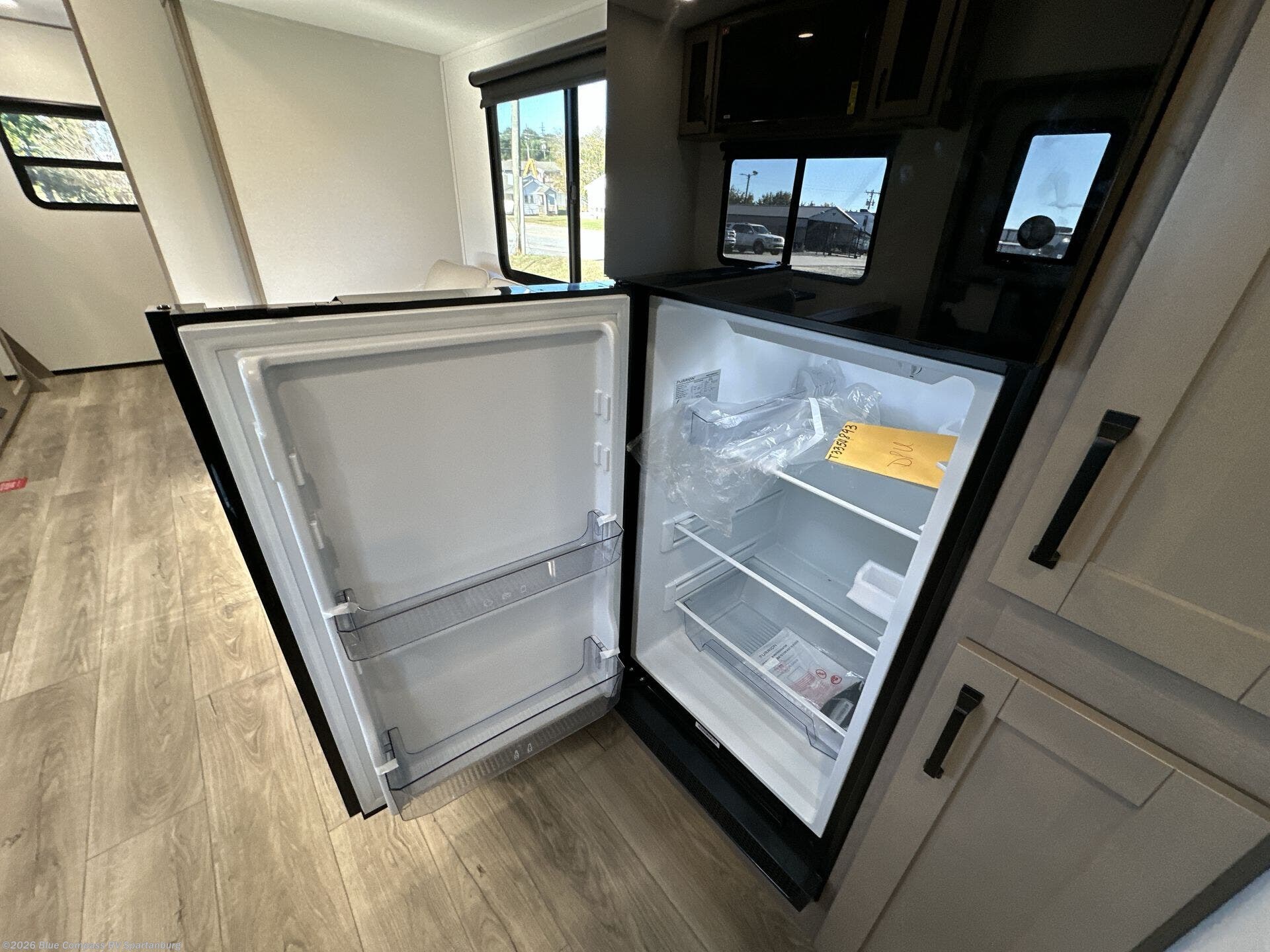 You will love this fifth wheel’s multiple sleeping spaces, such as the 36” flip top bunk offers flexible sleeping options for added capacity and comfort. A trundle bed provides an additional cozy sleeping space, ideal for guests or family members, and the 44” bunk bed with window features a comfortable sleeping area with natural light, ideal for kids or relaxation. Plus, the front bedroom boasts a queen bed, creating a peaceful retreat for rest and rejuvenation. In the living area, you will find a space that creates a warm and intimate spot for meals and conversation. The 40” TV delivers entertainment for relaxation and enjoyment, a theater seating provides immersive comfort for an exceptional viewing experience, and the well-appointed kitchen features a 10 cu ft refrigerator that ensures ample storage for fresh ingredients and beverages, a pantry, microwave, and a three-burner cooktop allows for versatile meal preparation. Finally, the full bathroom will complete the at-home experience, adding convenience to this model.