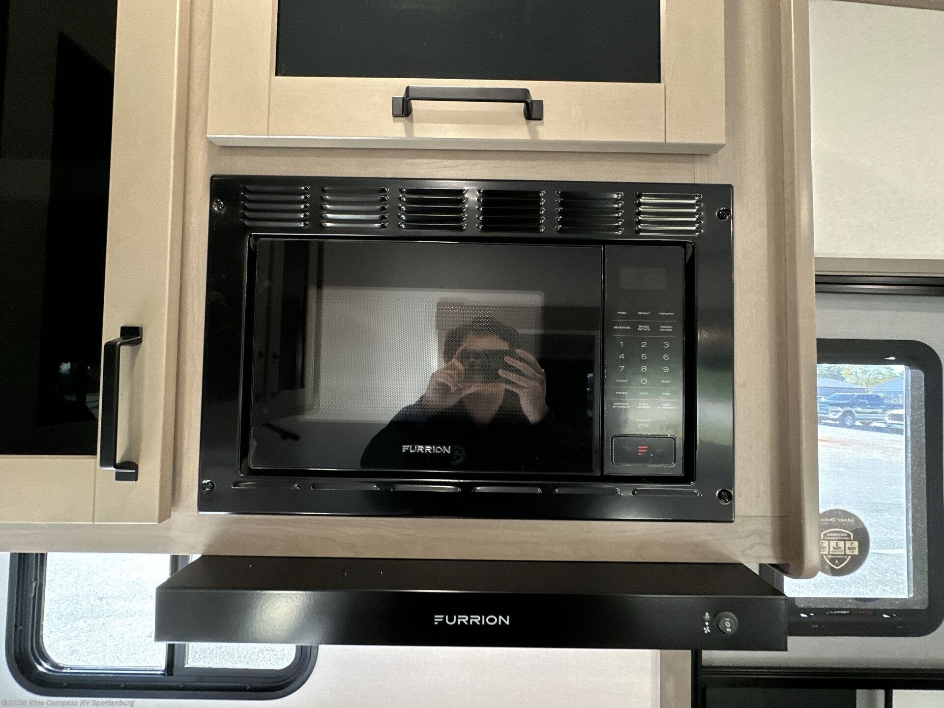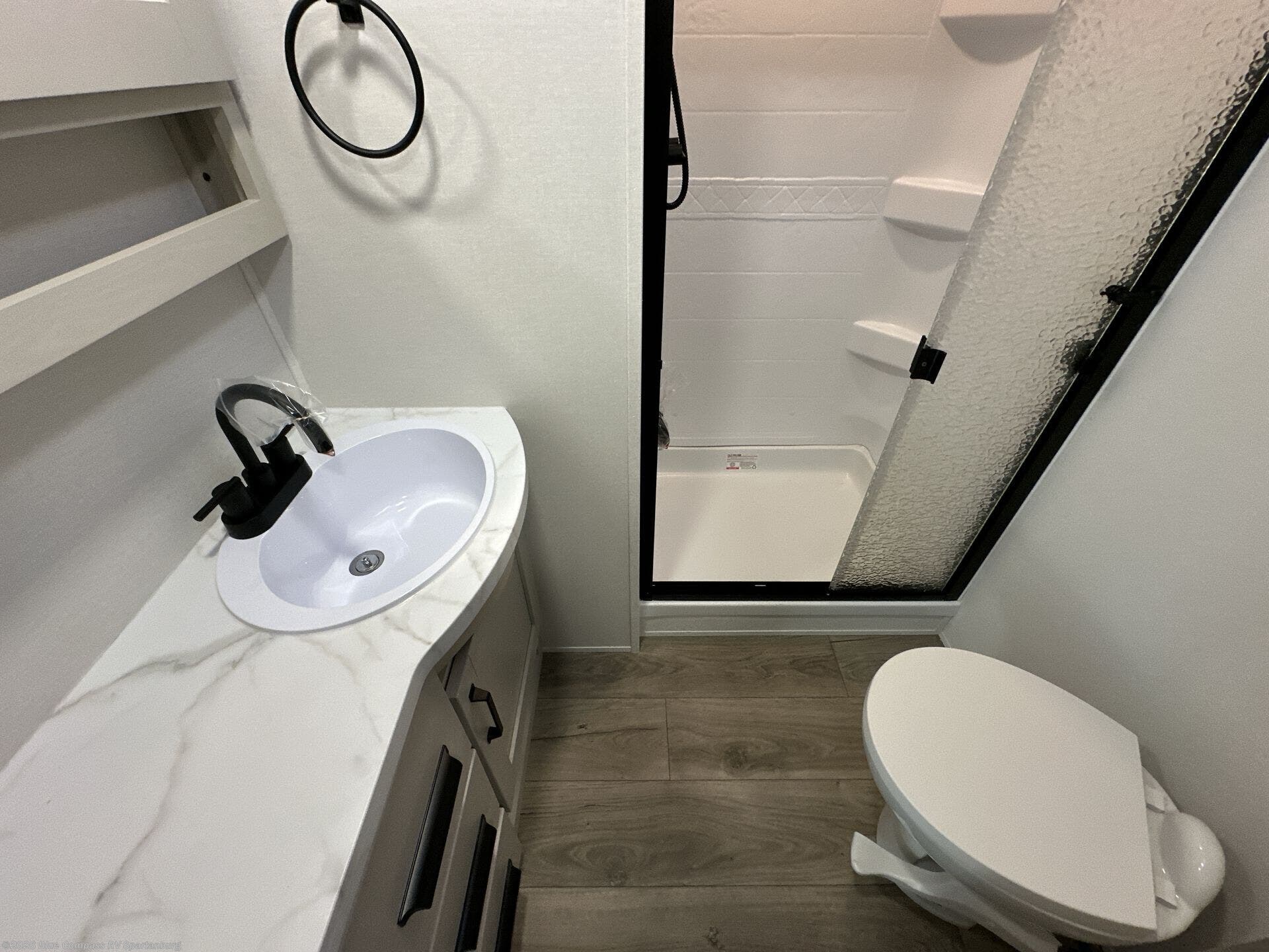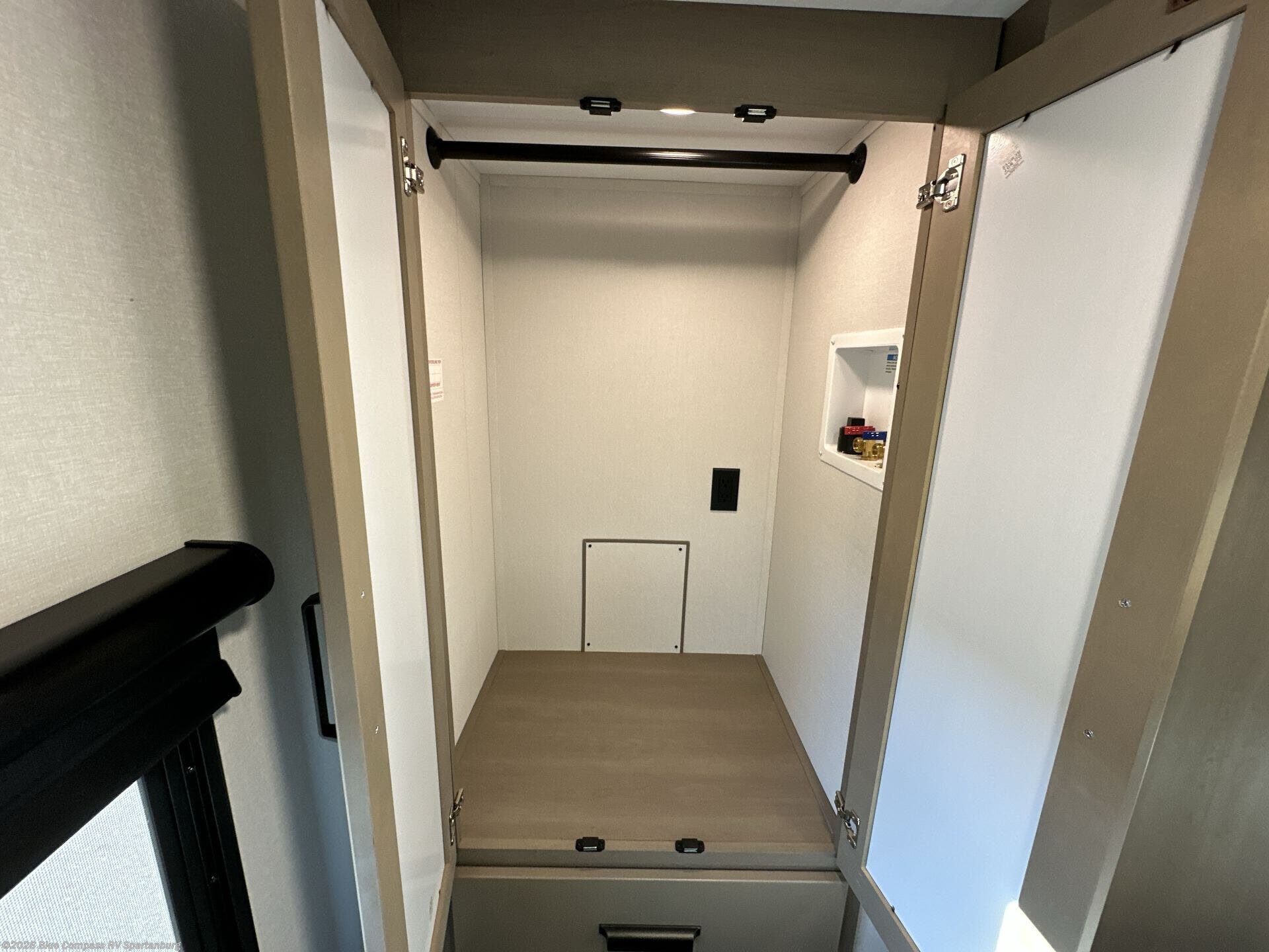 You will love this fifth wheel’s multiple sleeping spaces, such as the 36” flip top bunk offers flexible sleeping options for added capacity and comfort. A trundle bed provides an additional cozy sleeping space, ideal for guests or family members, and the 44” bunk bed with window features a comfortable sleeping area with natural light, ideal for kids or relaxation. Plus, the front bedroom boasts a queen bed, creating a peaceful retreat for rest and rejuvenation. In the living area, you will find a space that creates a warm and intimate spot for meals and conversation. The 40” TV delivers entertainment for relaxation and enjoyment, a theater seating provides immersive comfort for an exceptional viewing experience, and the well-appointed kitchen features a 10 cu ft refrigerator that ensures ample storage for fresh ingredients and beverages, a pantry, microwave, and a three-burner cooktop allows for versatile meal preparation. Finally, the full bathroom will complete the at-home experience, adding convenience to this model.
