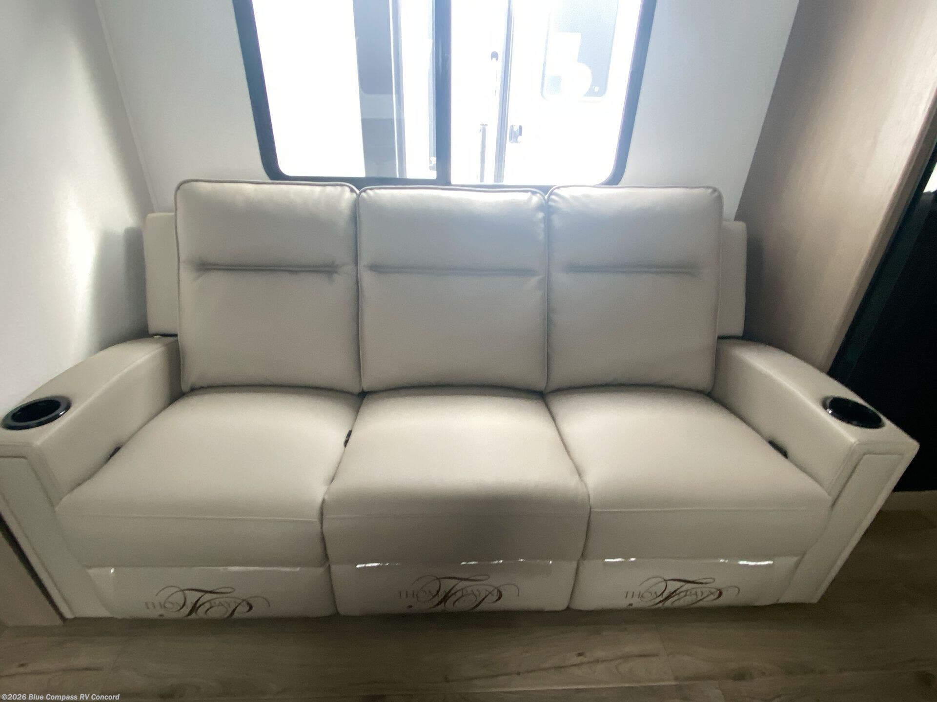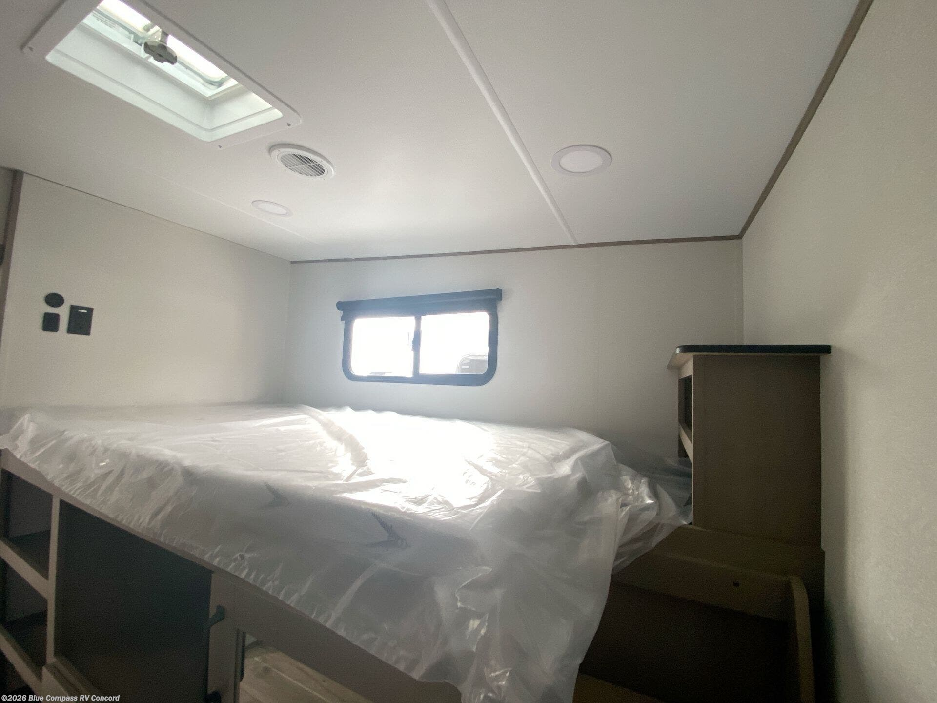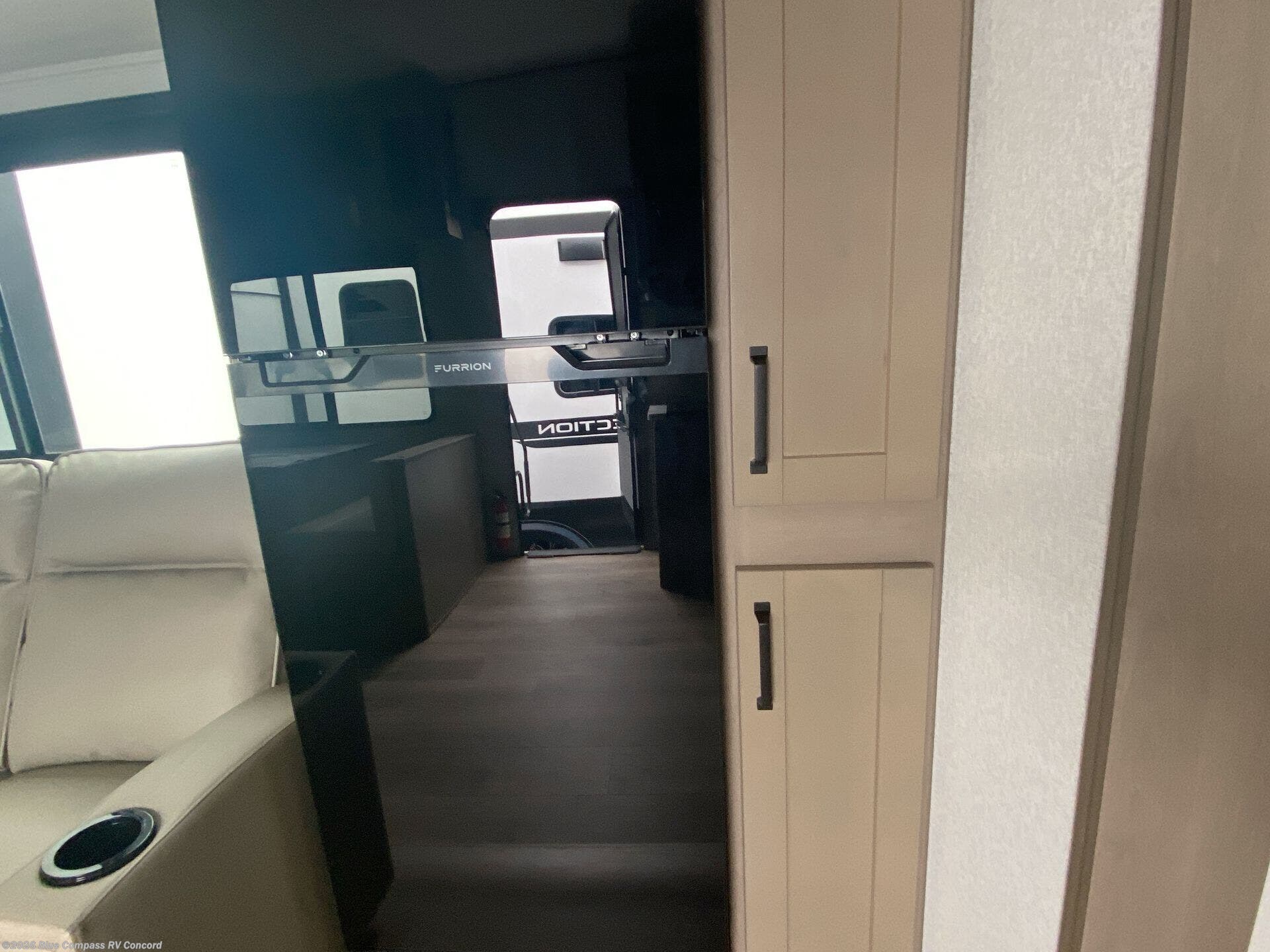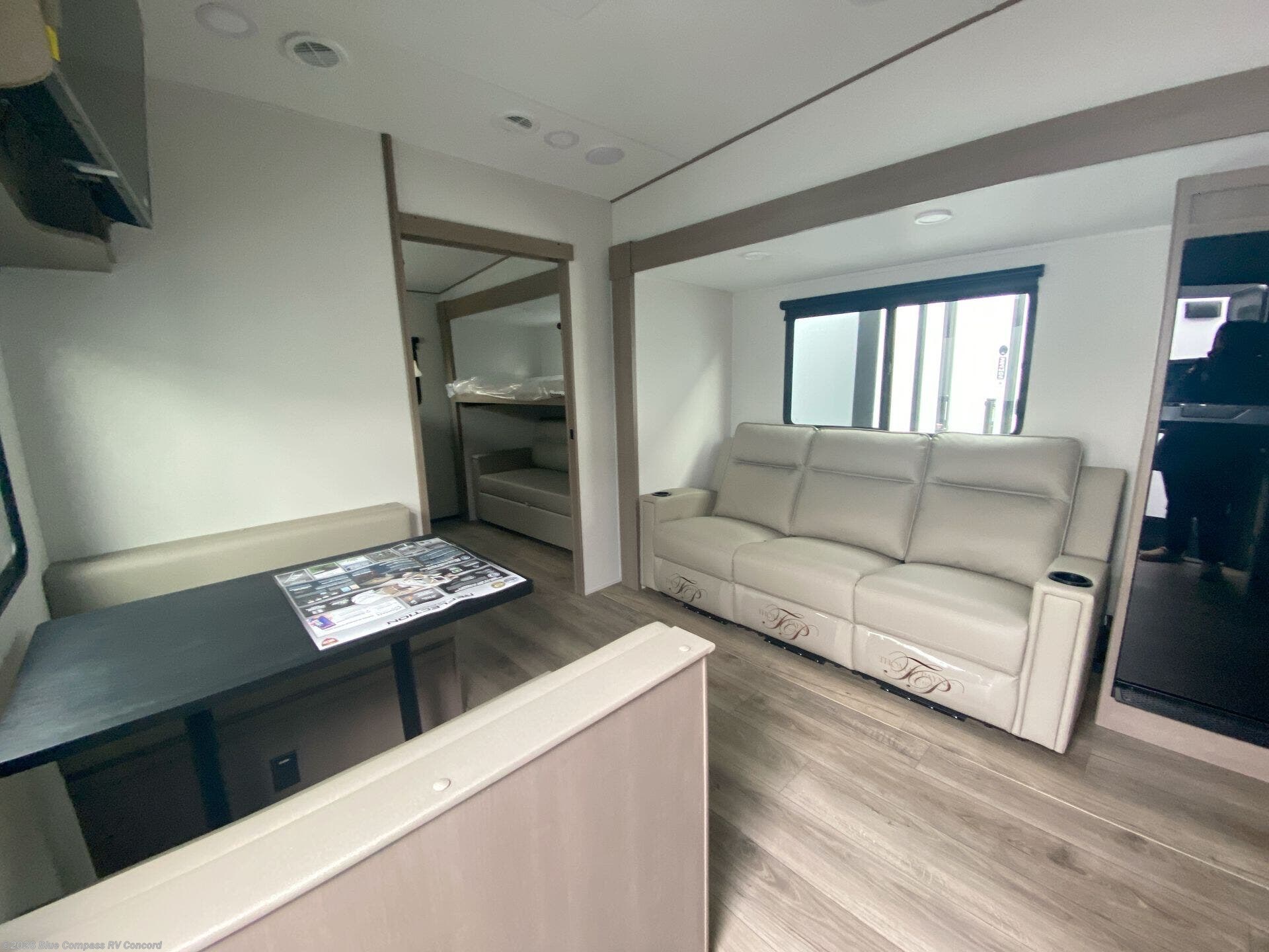 You will love this fifth wheel’s multiple sleeping spaces, such as the 36” flip top bunk offers flexible sleeping options for added capacity and comfort. A trundle bed provides an additional cozy sleeping space, ideal for guests or family members, and the 44” bunk bed with window features a comfortable sleeping area with natural light, ideal for kids or relaxation. Plus, the front bedroom boasts a queen bed, creating a peaceful retreat for rest and rejuvenation. In the living area, you will find a space that creates a warm and intimate spot for meals and conversation. The 40” TV delivers entertainment for relaxation and enjoyment, a theater seating provides immersive comfort for an exceptional viewing experience, and the well-appointed kitchen features a 10 cu ft refrigerator that ensures ample storage for fresh ingredients and beverages, a pantry, microwave, and a three-burner cooktop allows for versatile meal preparation. Finally, the full bathroom will complete the at-home experience, adding convenience to this model.
