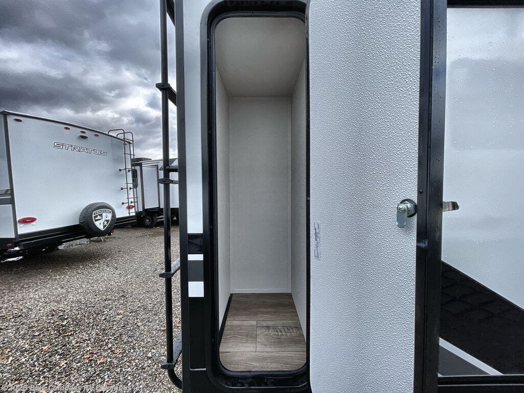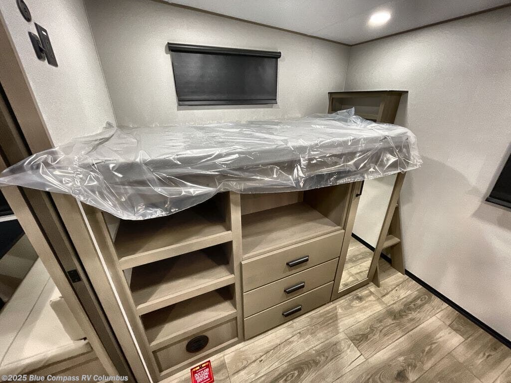 You will love this fifth wheel’s multiple sleeping spaces, such as the 36” flip top bunk offers flexible sleeping options for added capacity and comfort. A trundle bed provides an additional cozy sleeping space, ideal for guests or family members, and the 44” bunk bed with window features a comfortable sleeping area with natural light, ideal for kids or relaxation. Plus, the front bedroom boasts a queen bed, creating a peaceful retreat for rest and rejuvenation. In the living area, you will find a space that creates a warm and intimate spot for meals and conversation. The 40” TV delivers entertainment for relaxation and enjoyment, a theater seating provides immersive comfort for an exceptional viewing experience, and the well-appointed kitchen features a 10 cu ft refrigerator that ensures ample storage for fresh ingredients and beverages, a pantry, microwave, and a three-burner cooktop allows for versatile meal preparation. Finally, the full bathroom will complete the at-home experience, adding convenience to this model.