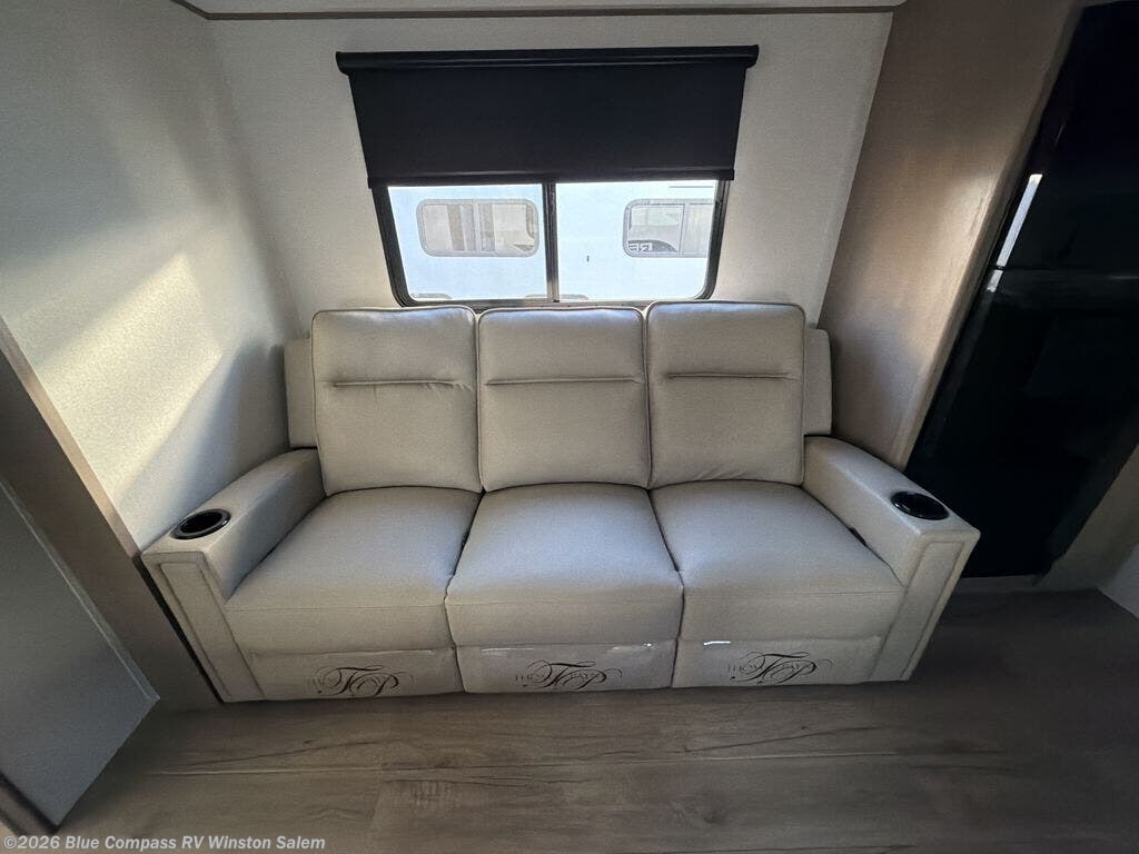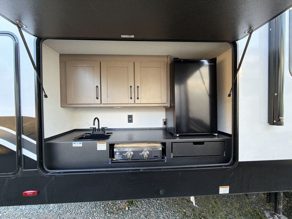 You will love this fifth wheel’s multiple sleeping spaces, such as the 36” flip top bunk offers flexible sleeping options for added capacity and comfort. A trundle bed provides an additional cozy sleeping space, ideal for guests or family members, and the 44” bunk bed with window features a comfortable sleeping area with natural light, ideal for kids or relaxation. Plus, the front bedroom boasts a queen bed, creating a peaceful retreat for rest and rejuvenation. In the living area, you will find a space that creates a warm and intimate spot for meals and conversation. The 40” TV delivers entertainment for relaxation and enjoyment, a theater seating provides immersive comfort for an exceptional viewing experience, and the well-appointed kitchen features a 10 cu ft refrigerator that ensures ample storage for fresh ingredients and beverages, a pantry, microwave, and a three-burner cooktop allows for versatile meal preparation. Finally, the full bathroom will complete the at-home experience, adding convenience to this model.