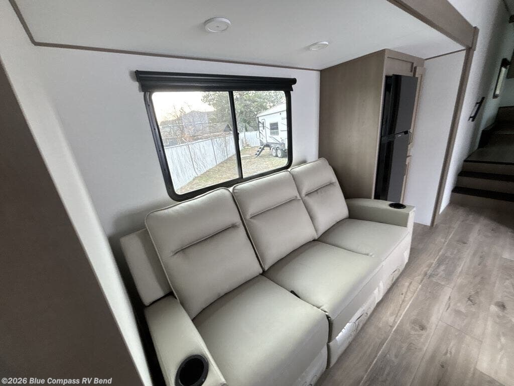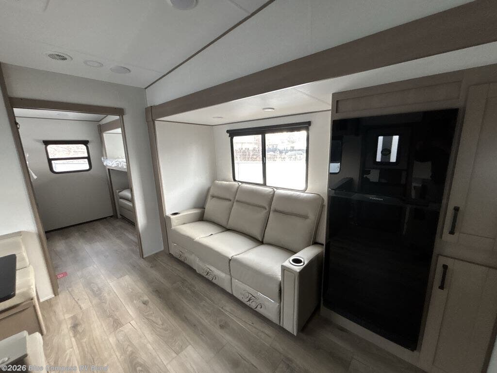 You will love this fifth wheel’s multiple sleeping spaces, such as the 36” flip top bunk offers flexible sleeping options for added capacity and comfort. A trundle bed provides an additional cozy sleeping space, ideal for guests or family members, and the 44” bunk bed with window features a comfortable sleeping area with natural light, ideal for kids or relaxation. Plus, the front bedroom boasts a queen bed, creating a peaceful retreat for rest and rejuvenation. In the living area, you will find a space that creates a warm and intimate spot for meals and conversation. The 40” TV delivers entertainment for relaxation and enjoyment, a theater seating provides immersive comfort for an exceptional viewing experience, and the well-appointed kitchen features a 10 cu ft refrigerator that ensures ample storage for fresh ingredients and beverages, a pantry, microwave, and a three-burner cooktop allows for versatile meal preparation. Finally, the full bathroom will complete the at-home experience, adding convenience to this model.