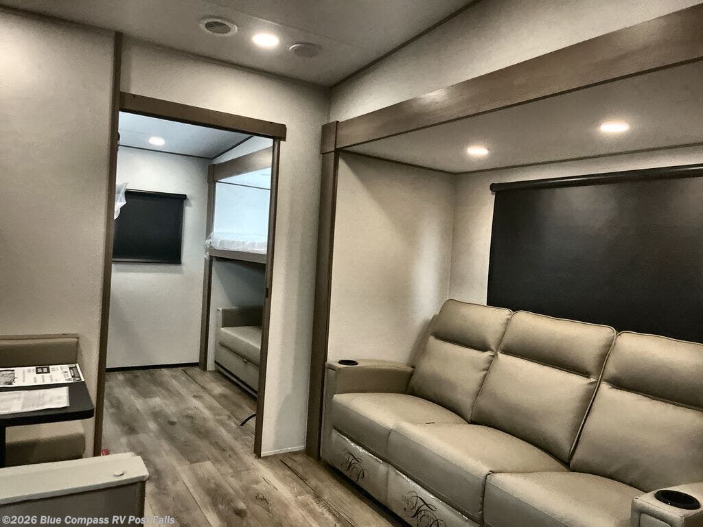 You will love this fifth wheel’s multiple sleeping spaces, such as the 36” flip top bunk offers flexible sleeping options for added capacity and comfort. A trundle bed provides an additional cozy sleeping space, ideal for guests or family members, and the 44” bunk bed with window features a comfortable sleeping area with natural light, ideal for kids or relaxation. Plus, the front bedroom boasts a queen bed, creating a peaceful retreat for rest and rejuvenation. In the living area, you will find a space that creates a warm and intimate spot for meals and conversation. The 40” TV delivers entertainment for relaxation and enjoyment, a theater seating provides immersive comfort for an exceptional viewing experience, and the well-appointed kitchen features a 10 cu ft refrigerator that ensures ample storage for fresh ingredients and beverages, a pantry, microwave, and a three-burner cooktop allows for versatile meal preparation. Finally, the full bathroom will complete the at-home experience, adding convenience to this model.