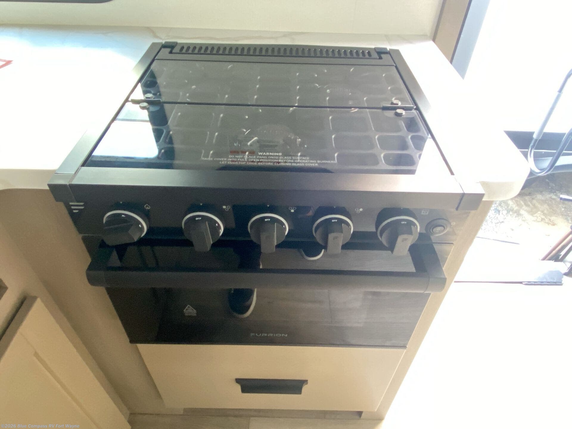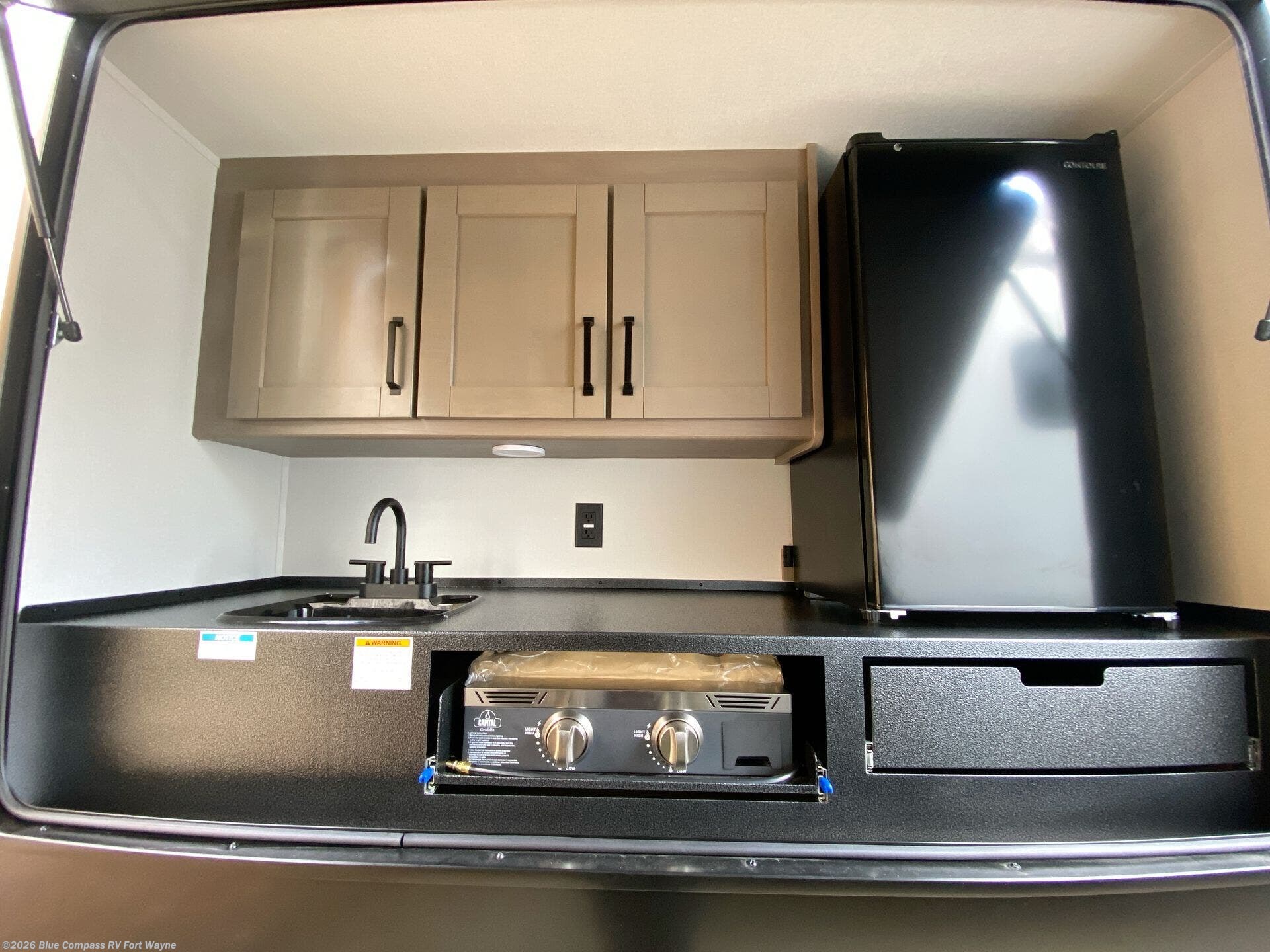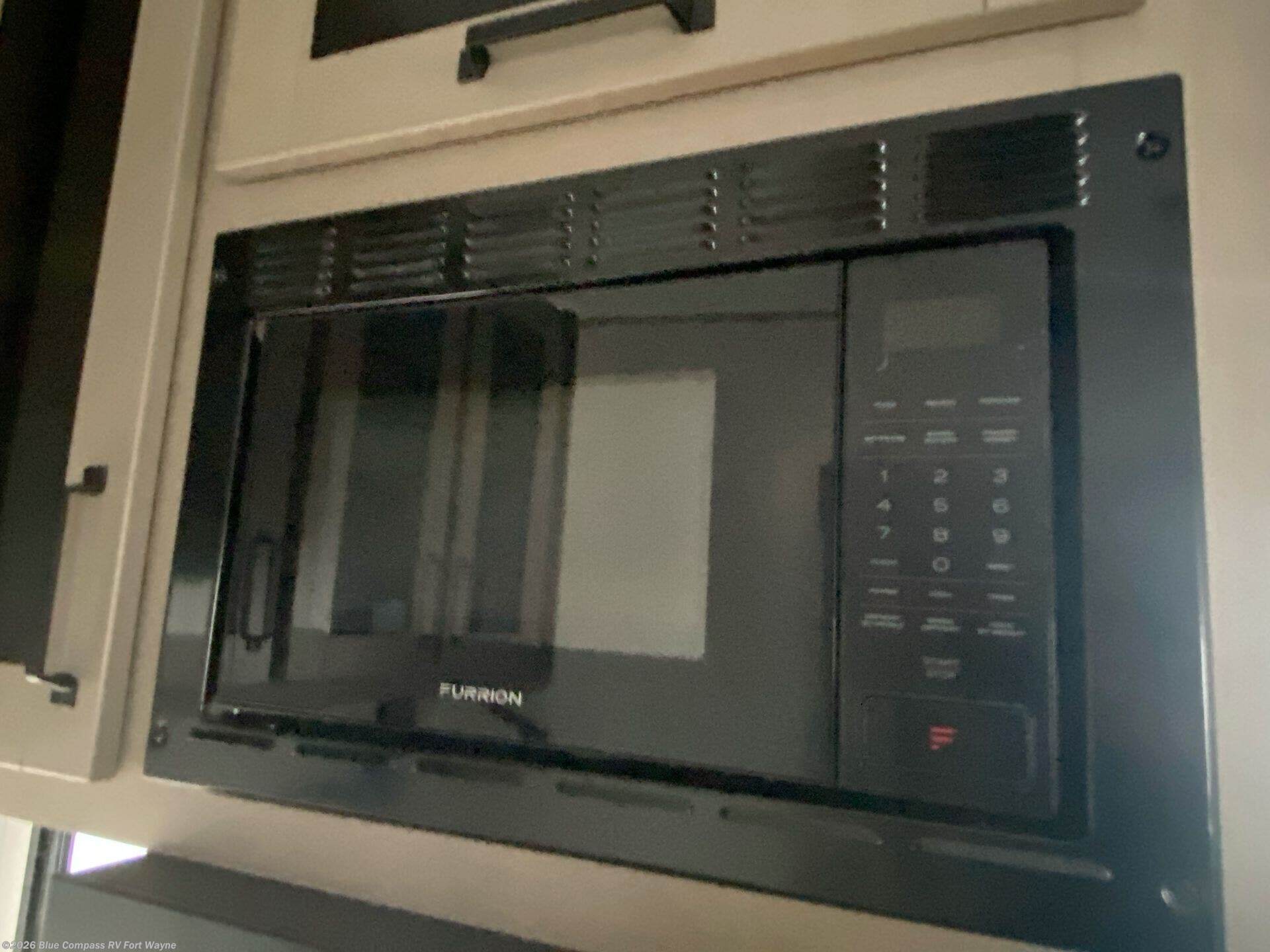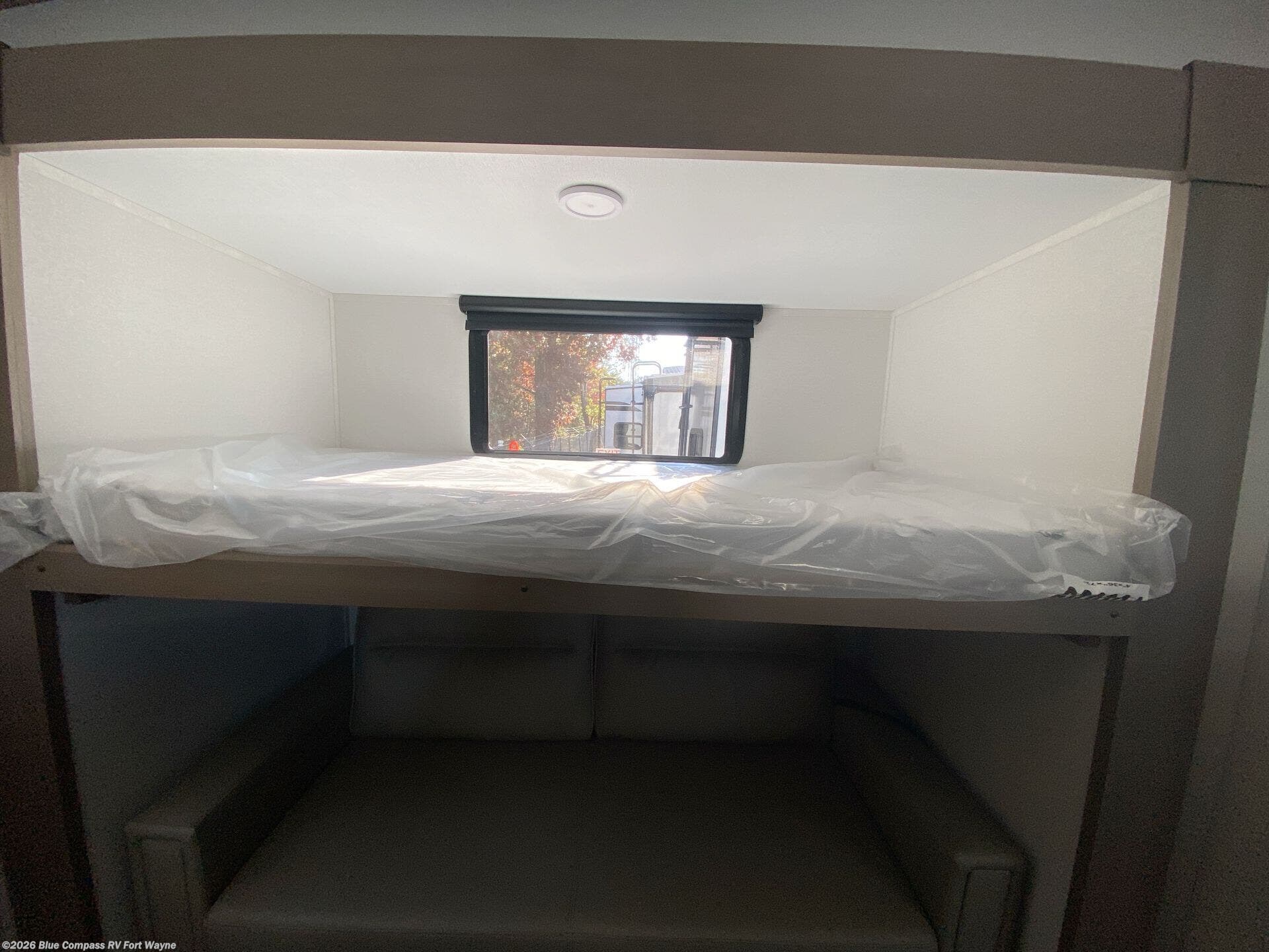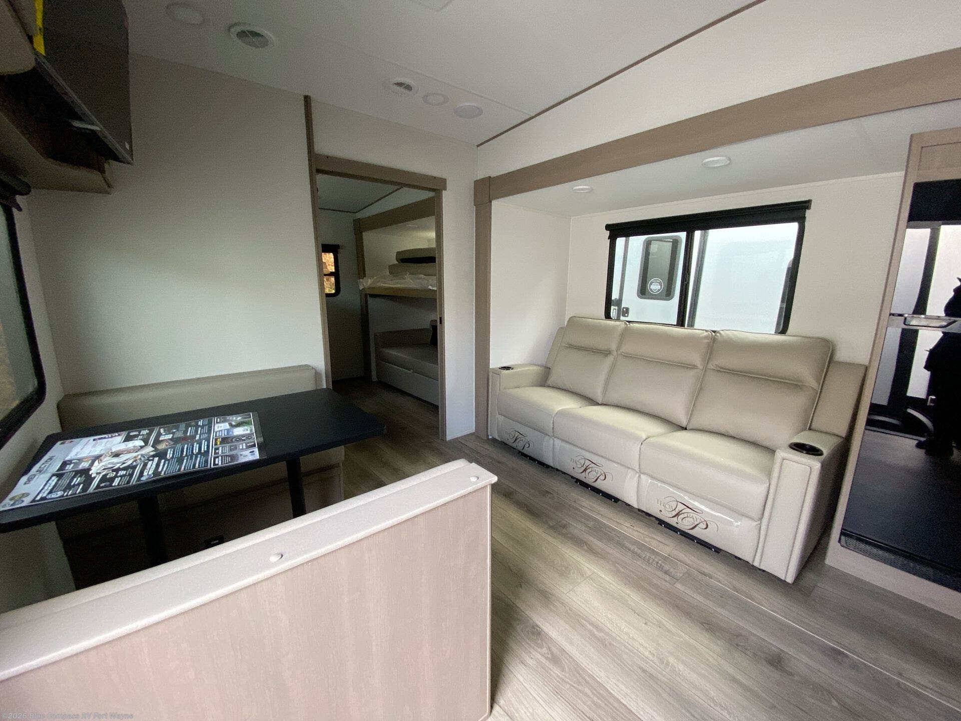 You will love this fifth wheel’s multiple sleeping spaces, such as the 36” flip top bunk offers flexible sleeping options for added capacity and comfort. A trundle bed provides an additional cozy sleeping space, ideal for guests or family members, and the 44” bunk bed with window features a comfortable sleeping area with natural light, ideal for kids or relaxation. Plus, the front bedroom boasts a queen bed, creating a peaceful retreat for rest and rejuvenation. In the living area, you will find a space that creates a warm and intimate spot for meals and conversation. The 40” TV delivers entertainment for relaxation and enjoyment, a theater seating provides immersive comfort for an exceptional viewing experience, and the well-appointed kitchen features a 10 cu ft refrigerator that ensures ample storage for fresh ingredients and beverages, a pantry, microwave, and a three-burner cooktop allows for versatile meal preparation. Finally, the full bathroom will complete the at-home experience, adding convenience to this model.
