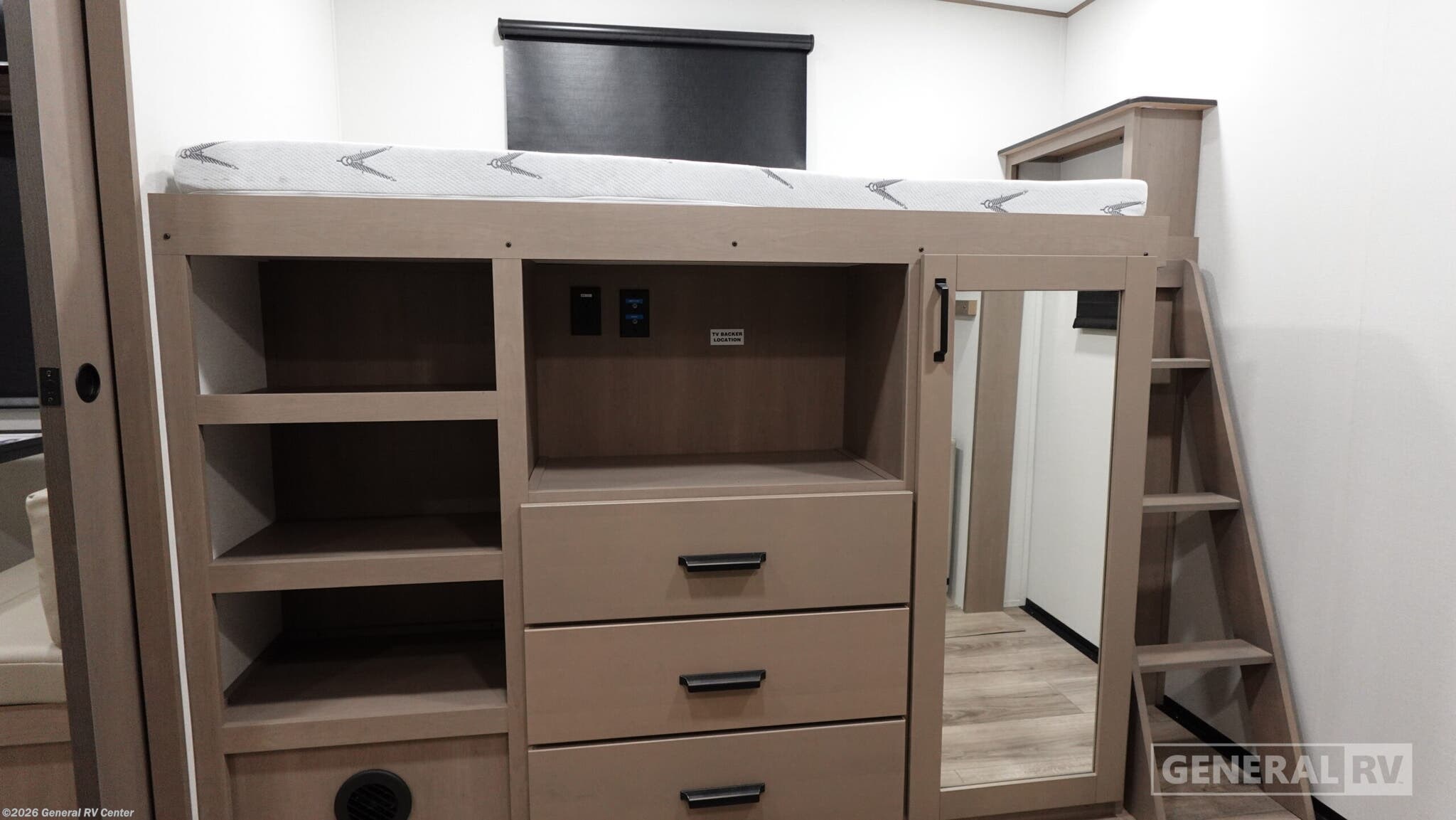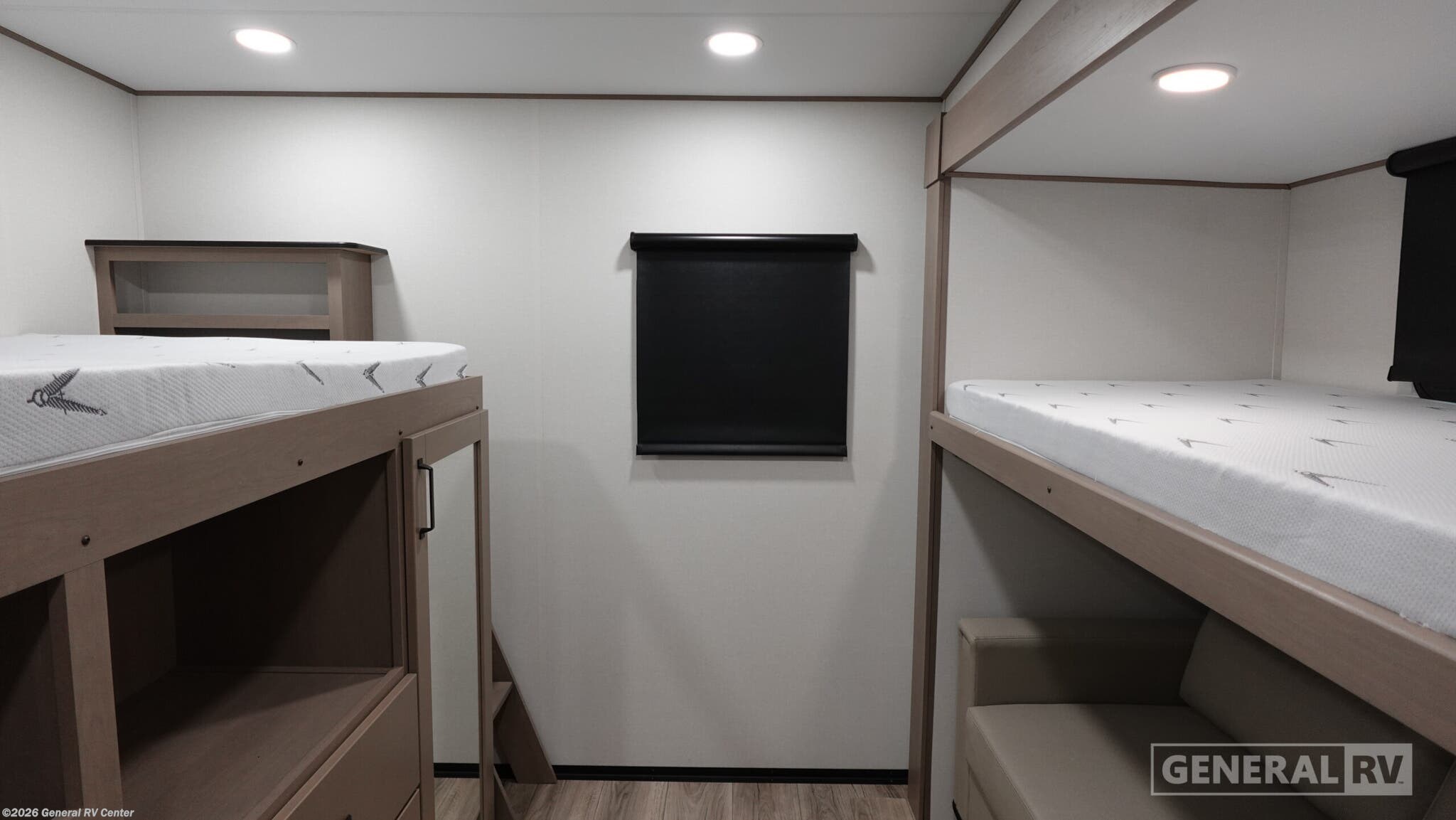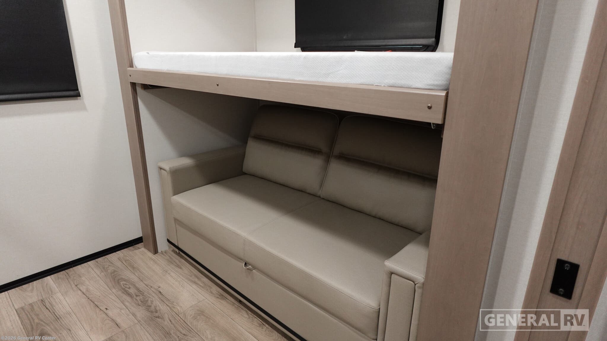 **Grand Design Reflection 100 Series fifth wheel 32BH highlights:** - Bunkhouse - Queen Bed - 19' "One Touch" Electric Awning - Full Bath - Front Private Bedroom - Outside Kitchen You will love this fifth wheel’s multiple sleeping spaces, such as the 36” flip top bunk offers flexible sleeping options for added capacity and comfort. A trundle bed provides an additional cozy sleeping space, ideal for guests or family members, and the 44” bunk bed with window features a comfortable sleeping area with natural light, ideal for kids or relaxation. Plus, the front bedroom boasts a queen bed, creating a peaceful retreat for rest and rejuvenation. In the living area, you will find a space that creates a warm and intimate spot for meals and conversation. The 40” TV delivers entertainment for relaxation and enjoyment, a theater seating provides immersive comfort for an exceptional viewing experience, and the well-appointed kitchen features a 10 cu ft refrigerator that ensures ample storage for fresh ingredients and beverages, a pantry, microwave, and a three-burner cooktop allows for versatile meal preparation. Finally, the full bathroom will complete the at-home experience, adding convenience to this model. Each Reflection 100 Series fifth wheel by Grand Design is affordable and packed with luxury for unforgettable camping memories! The MorRyde CRE3000 suspension system and Goodyear Endurance tires will provide smooth towing from home to campground. And the solar package with a 180W solar panel, 60 Amp charge controller and 12V refrigerator will allow you to camp for longer periods of time and in more locations! A heated and enclosed underbelly with circulating heat is included in the Arctic 4-Seasons Protection Package, along with a double insulated roof and front cap, and thermofoil insulation under the holding tanks so you can camp all year long if you choose. You will appreciate having an on-demand water heater for hot showers after exploring, and the universal all-in-one docking station will let you monitor your RVs tanks levels and functions with ease. These models also include many luxurious interior features, such as premium Congoleum flooring, pleated shades, residential cabinetry, and matte black fixtures and hardware. Don't let the Reflection 100 Series fifth wheels pass you by!