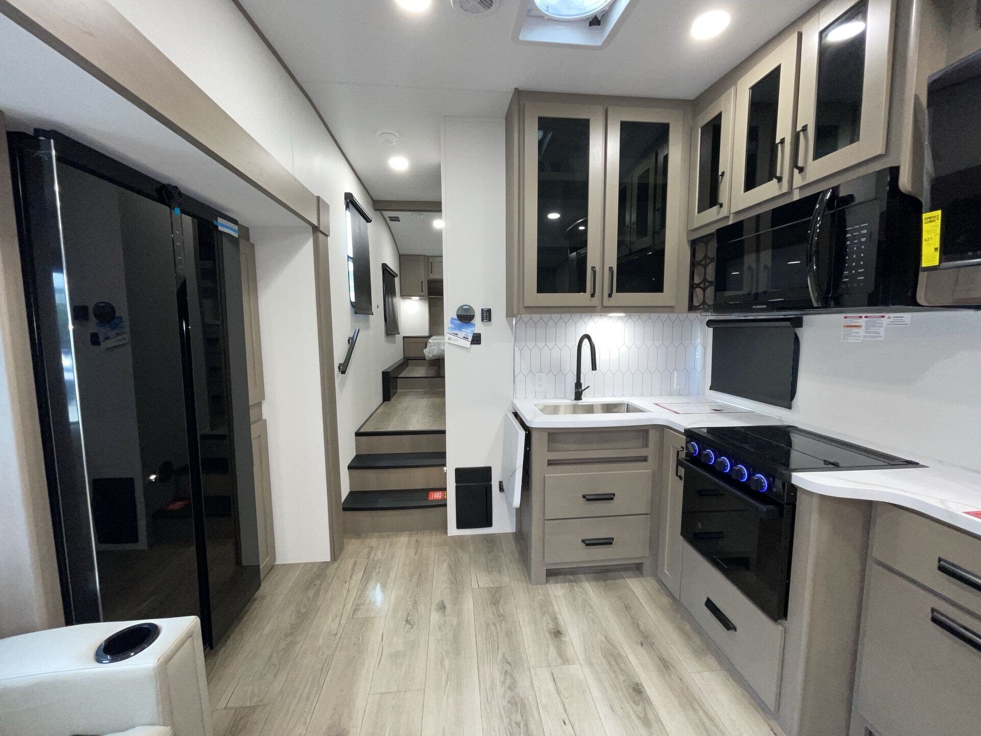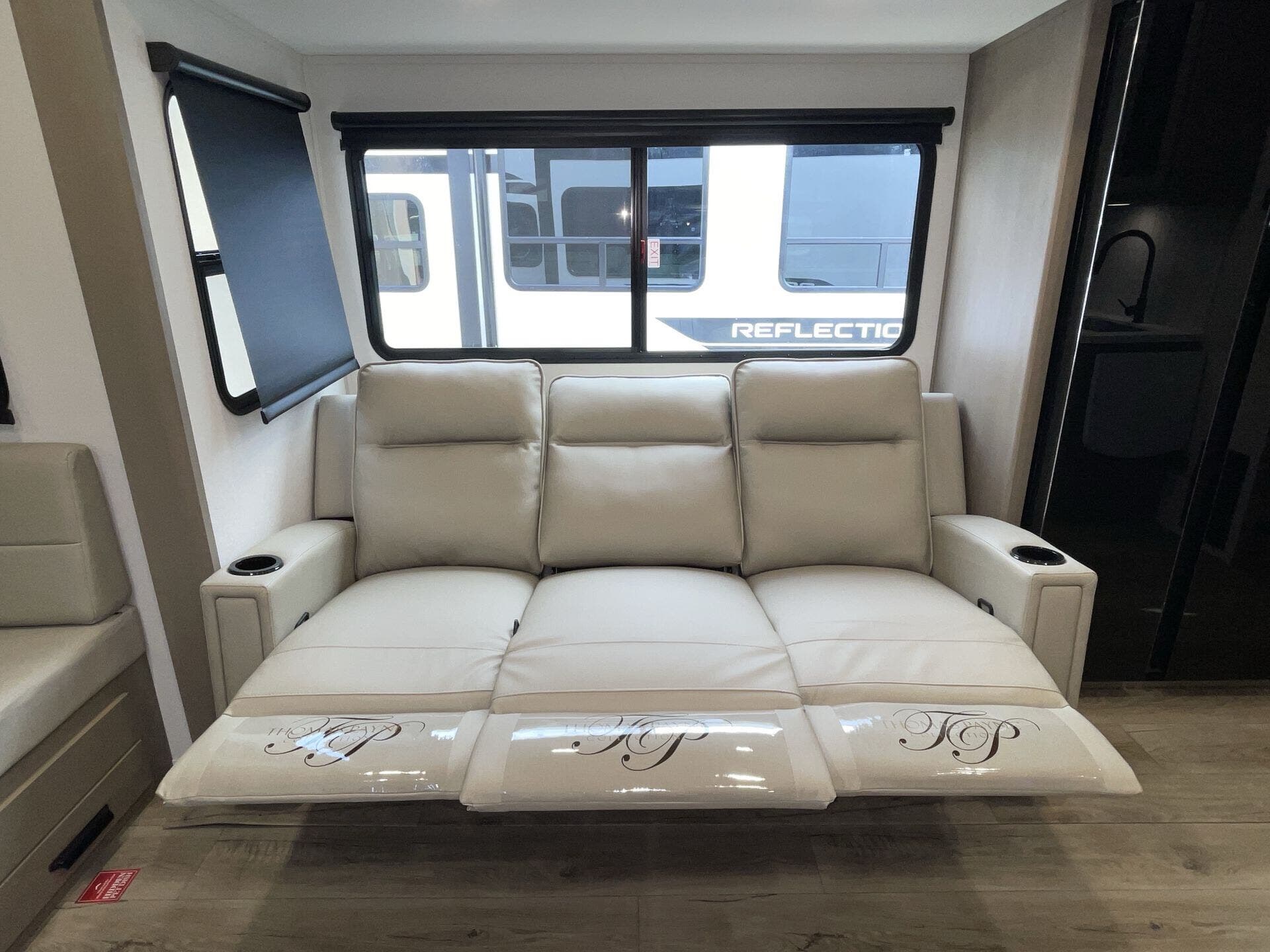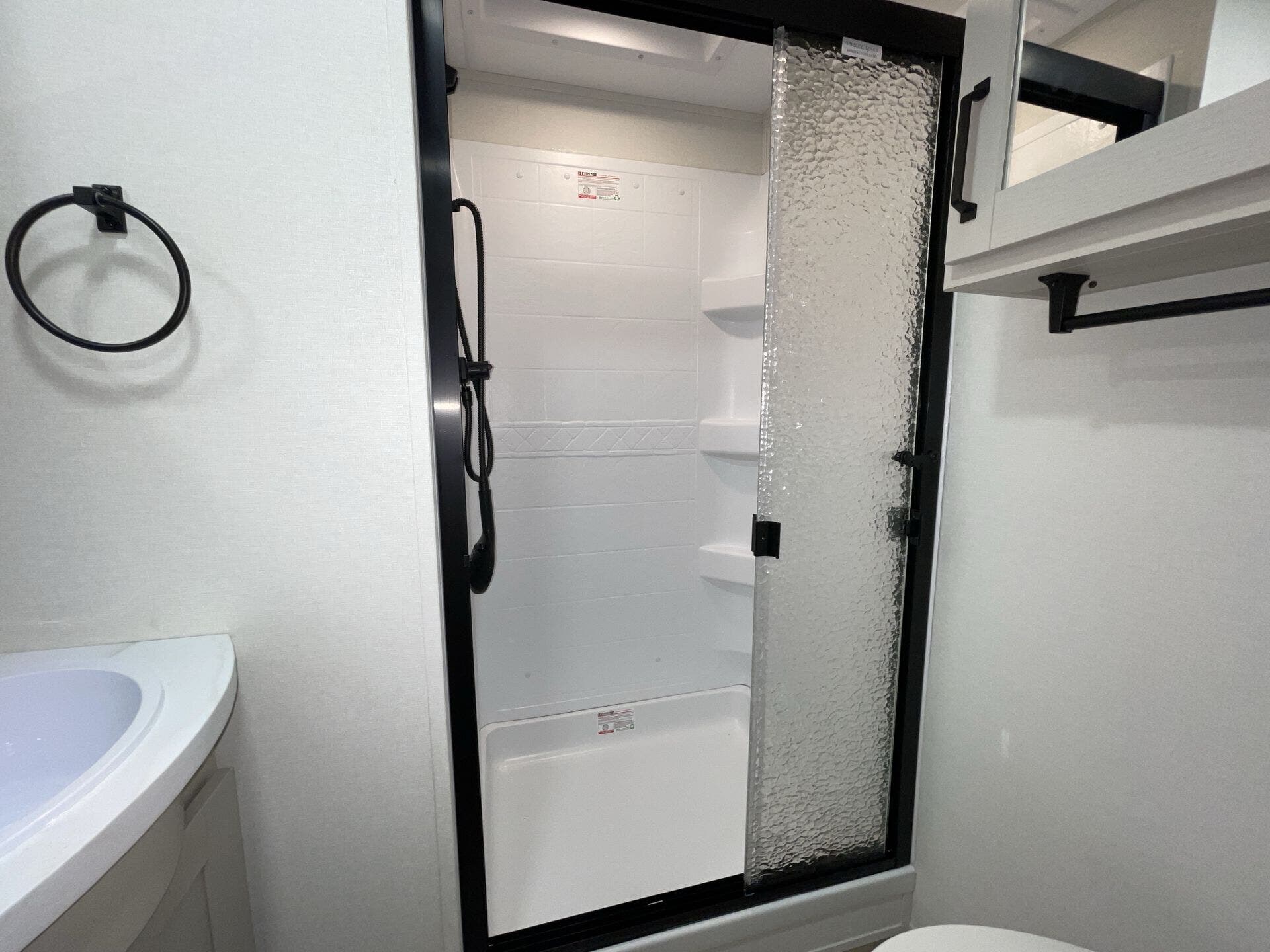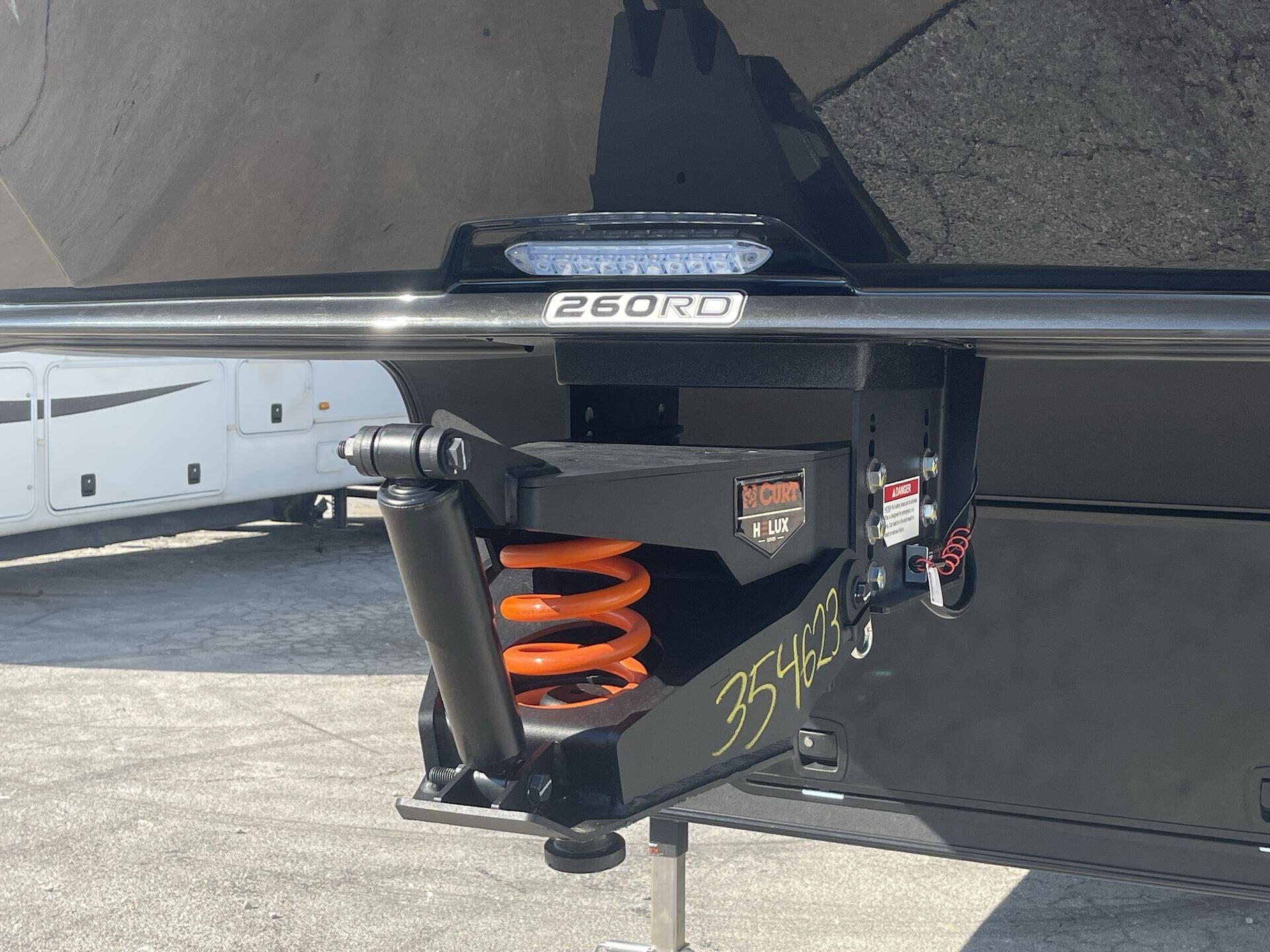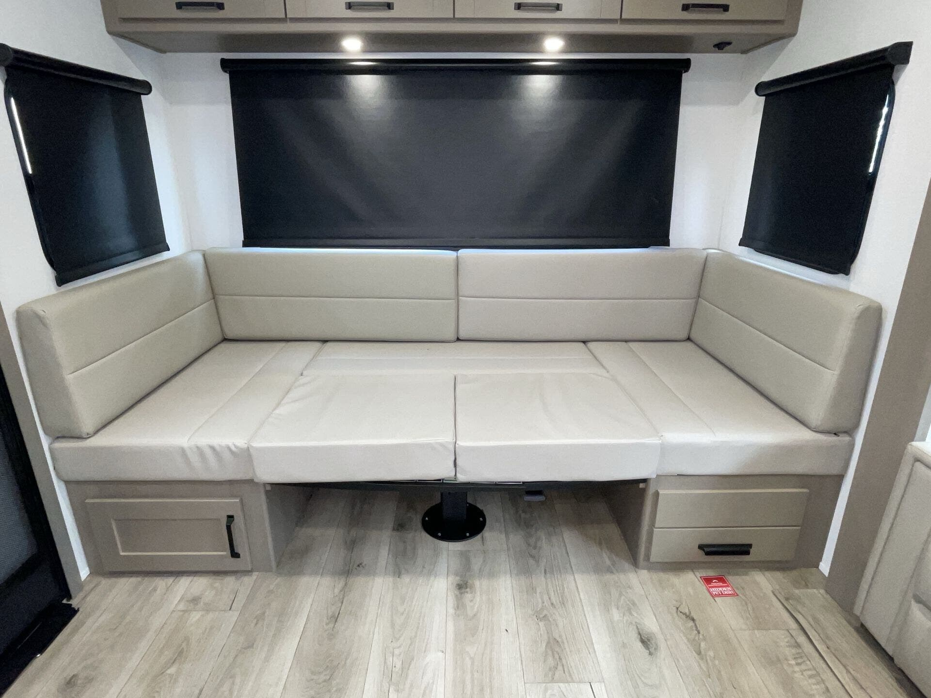 The 2026 Grand Design Reflection 150 260RD is a versatile half-ton towable fifth wheel designed to deliver premium comfort and convenience in a compact, easy-to-tow package. Measuring under 30 feet, this model combines Grand Design’s signature residential feel with innovative features that maximize space and livability. At the rear, the 260RD features a spacious dinette surrounded by large panoramic windows, offering abundant natural light and scenic views while providing a comfortable area for dining, working, or relaxing. The kitchen is thoughtfully arranged with stainless steel appliances, a residential microwave, ample counter space, and abundant storage for extended adventures. A theater seating option enhances the living area, while modern décor and LED lighting create a warm, welcoming atmosphere. Up front, the private master suite includes a walk-around queen bed, generous storage solutions, and direct access to the full bath, complete with a large shower and skylight.