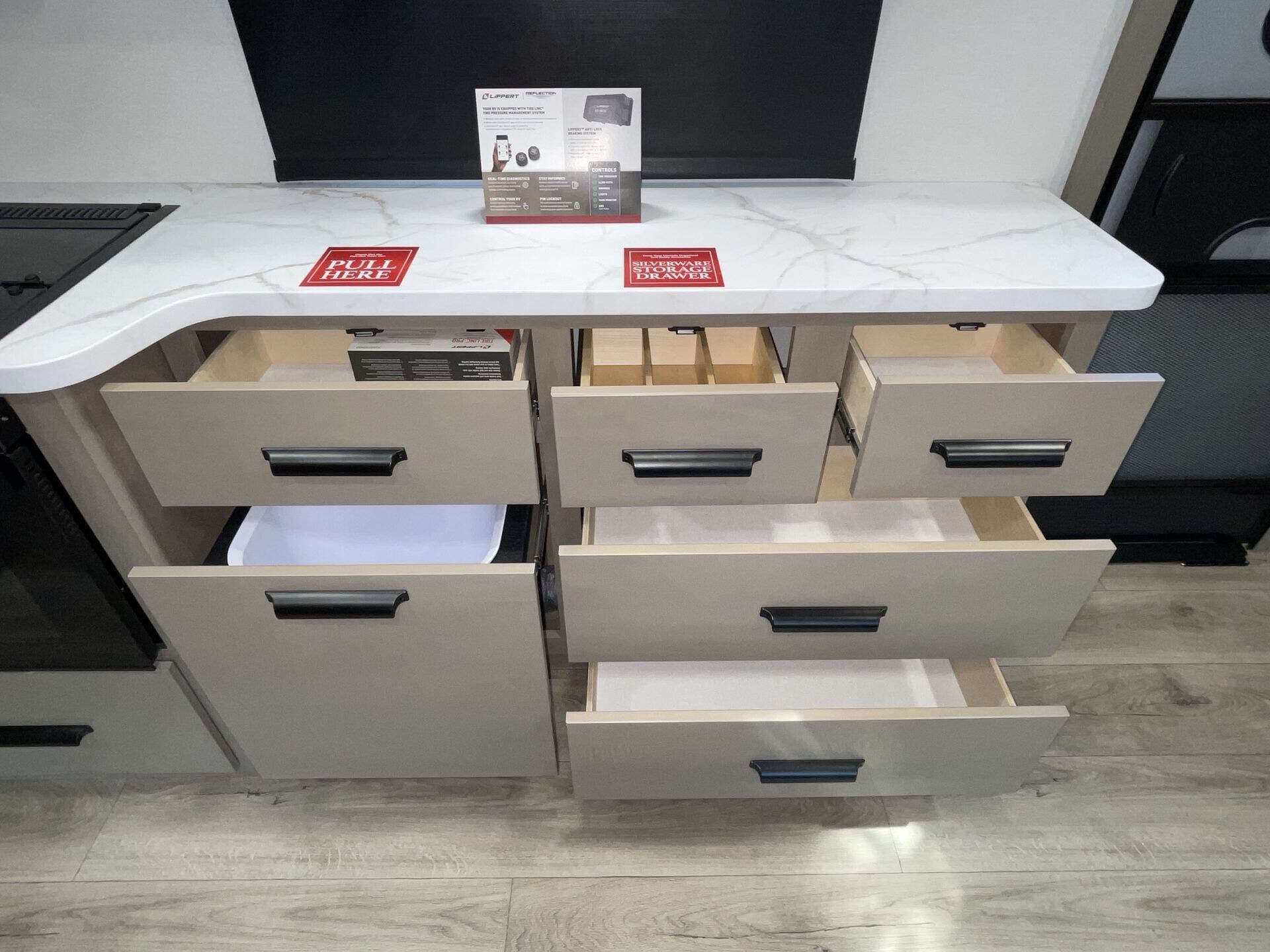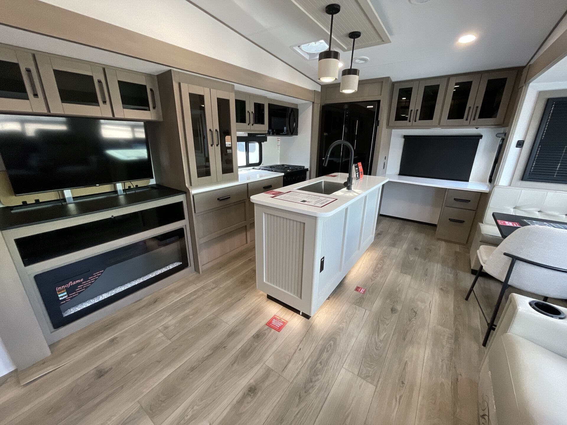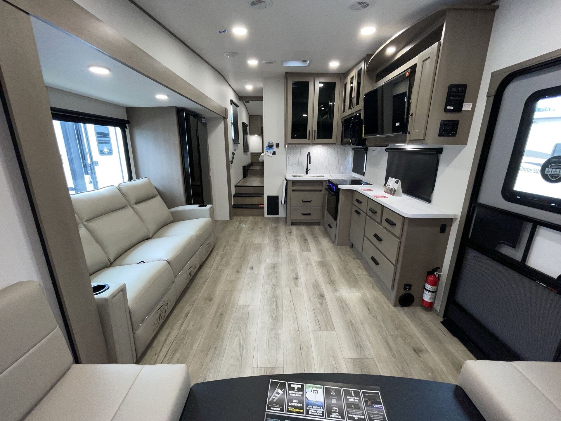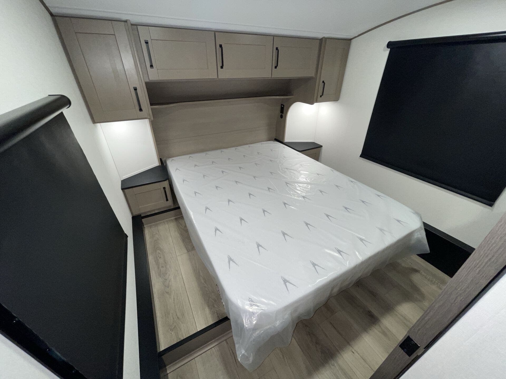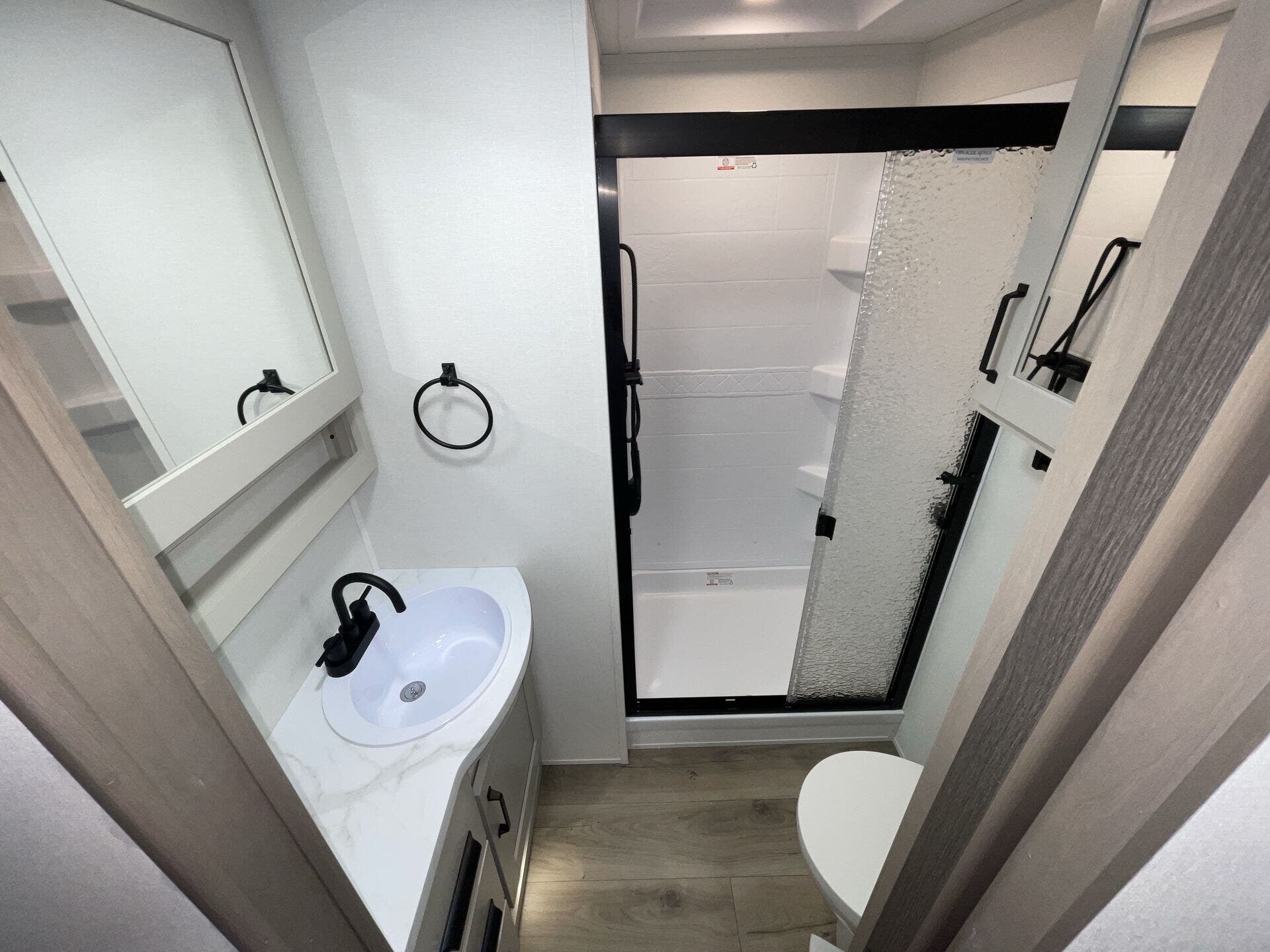 The 2026 Grand Design Reflection 150 260RD is a versatile half-ton towable fifth wheel designed to deliver premium comfort and convenience in a compact, easy-to-tow package. Measuring under 30 feet, this model combines Grand Design’s signature residential feel with innovative features that maximize space and livability. At the rear, the 260RD features a spacious dinette surrounded by large panoramic windows, offering abundant natural light and scenic views while providing a comfortable area for dining, working, or relaxing. The kitchen is thoughtfully arranged with stainless steel appliances, a residential microwave, ample counter space, and abundant storage for extended adventures. A theater seating option enhances the living area, while modern décor and LED lighting create a warm, welcoming atmosphere. Up front, the private master suite includes a walk-around queen bed, generous storage solutions, and direct access to the full bath, complete with a large shower and skylight.