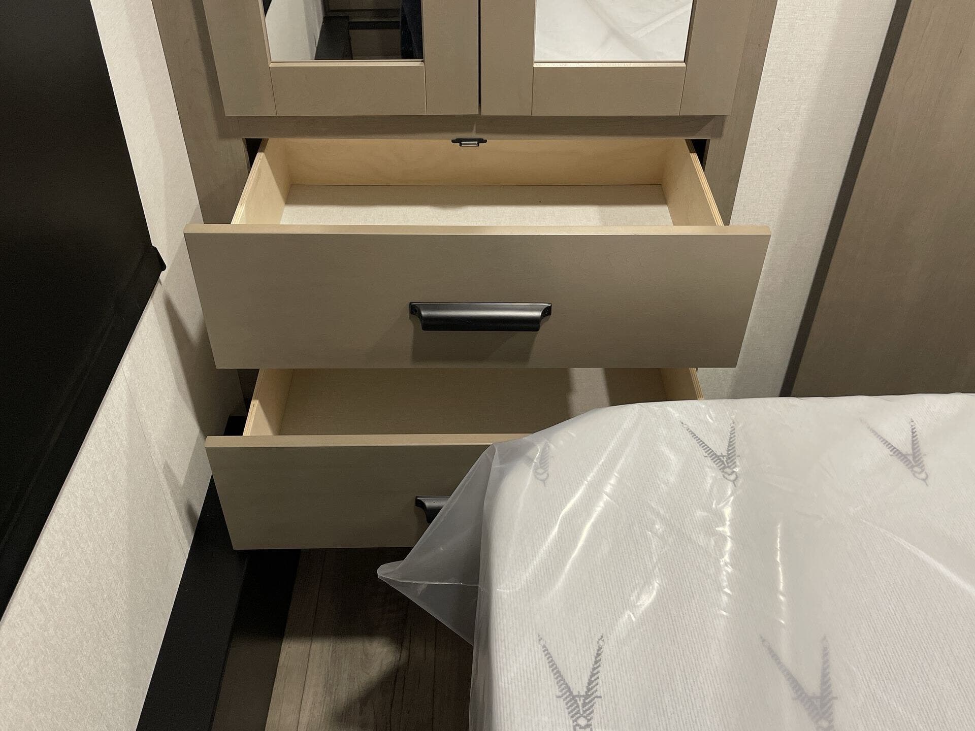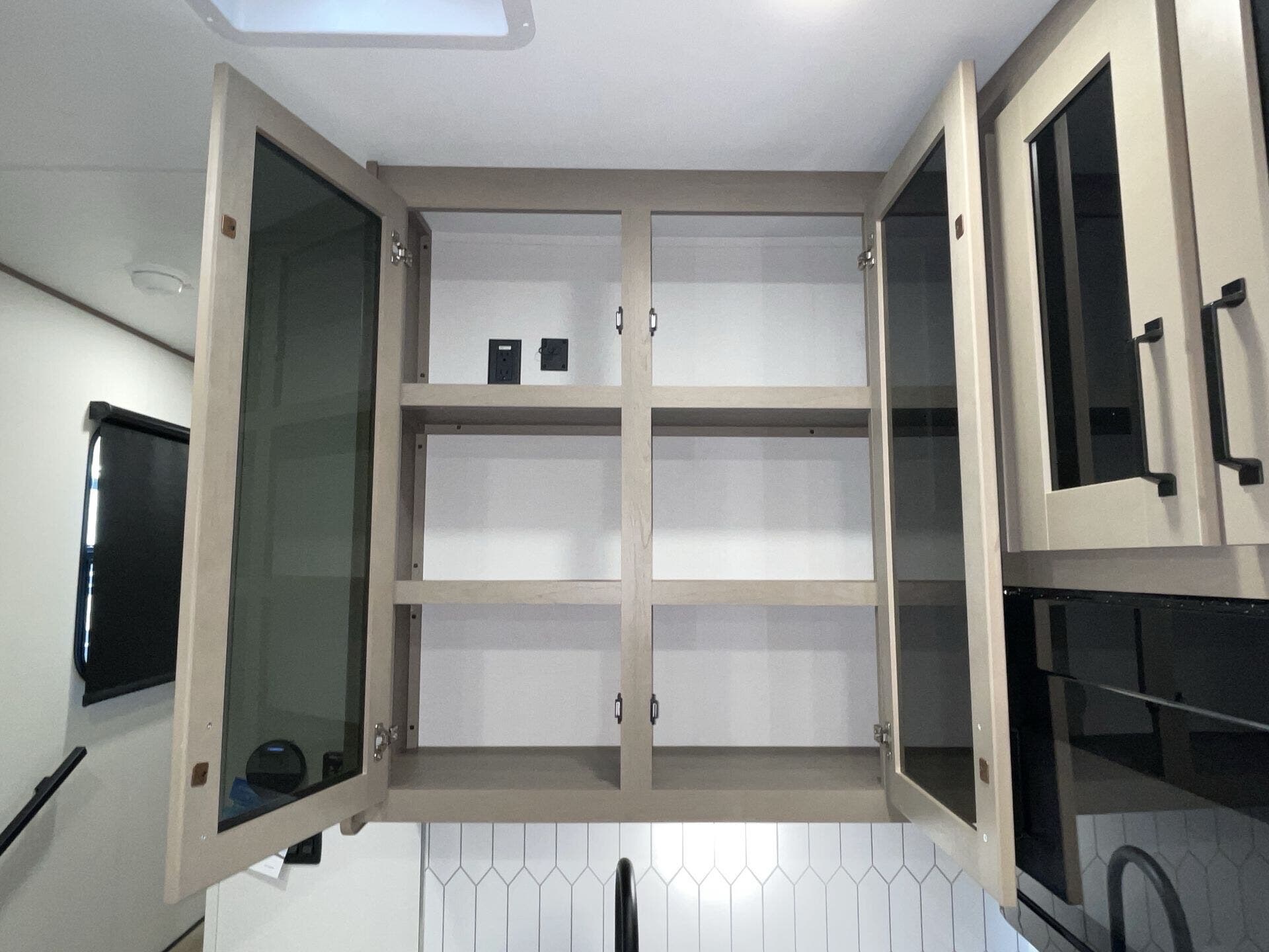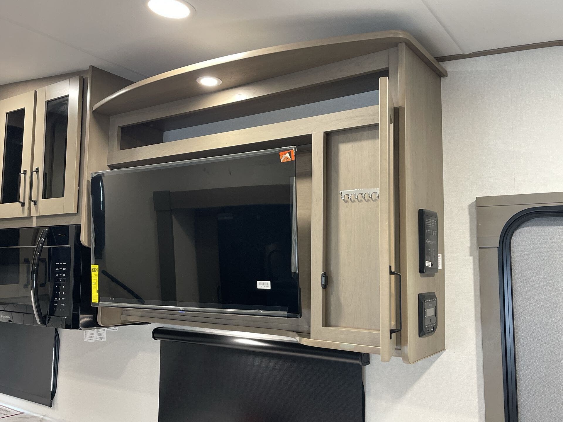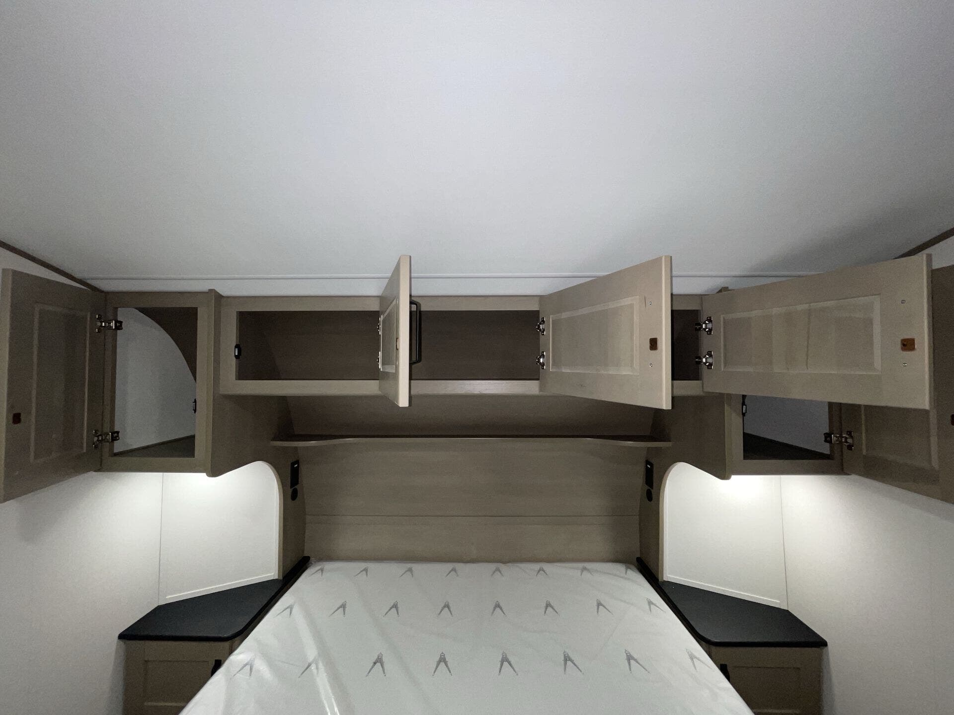 Booth Dinette, Day/Night Shades, Kitchen Sink, Medicine Cabinet, Overhead Cabinetry, Pantry, Queen Bed, Roof Vents, Shower, Theater Seating, Toilet, U-Shaped Dinette, Wardrobe(s)
