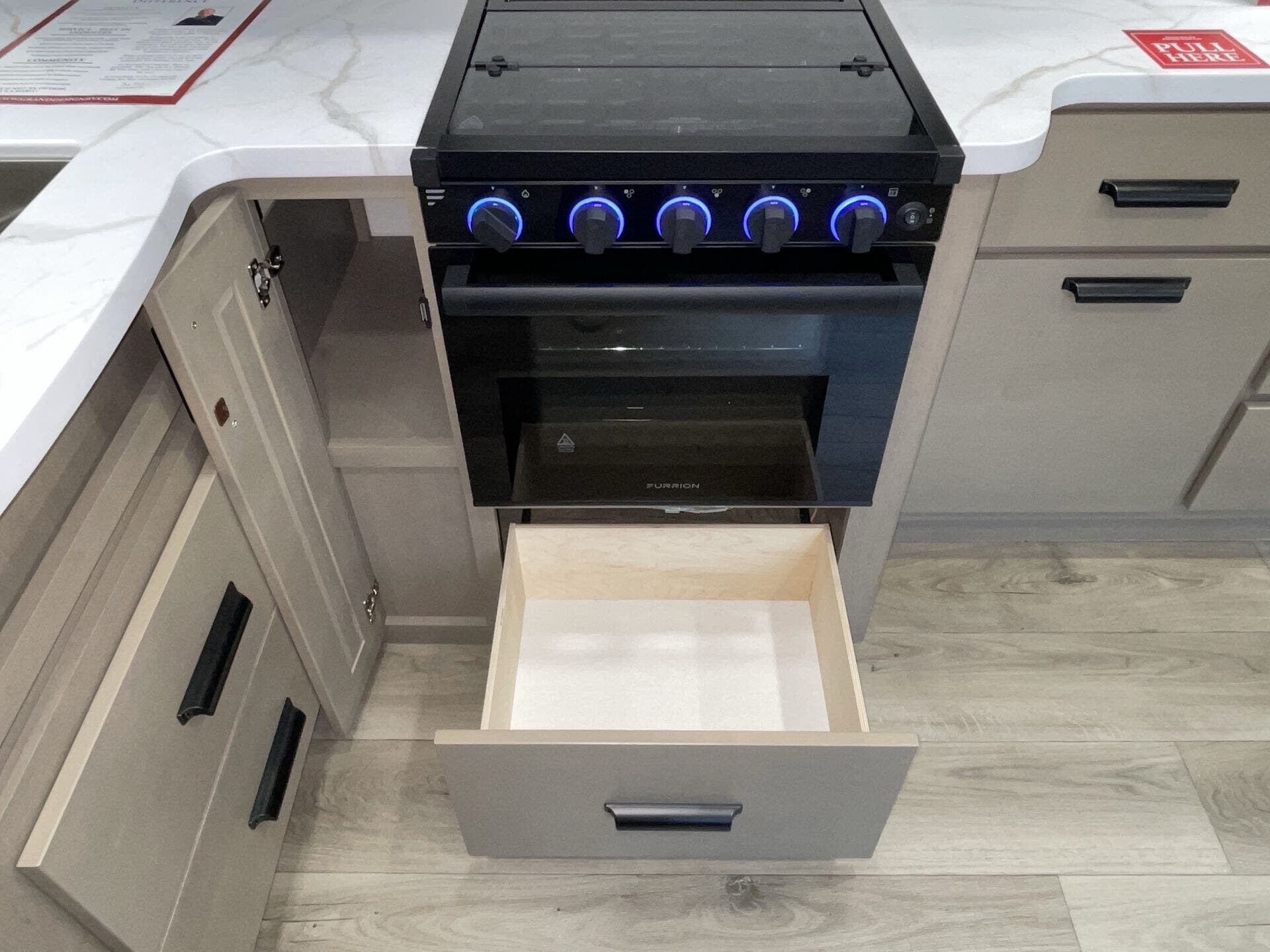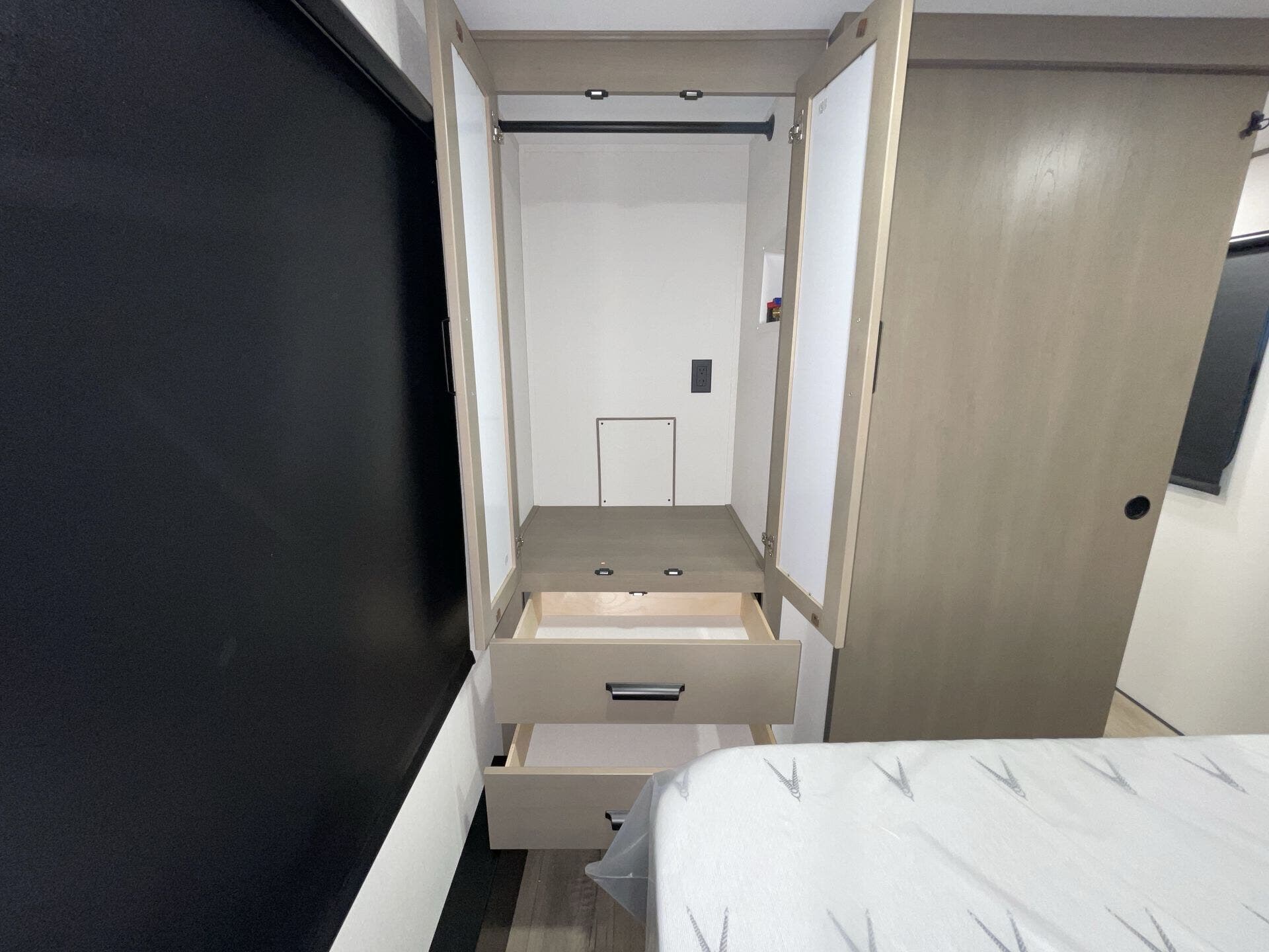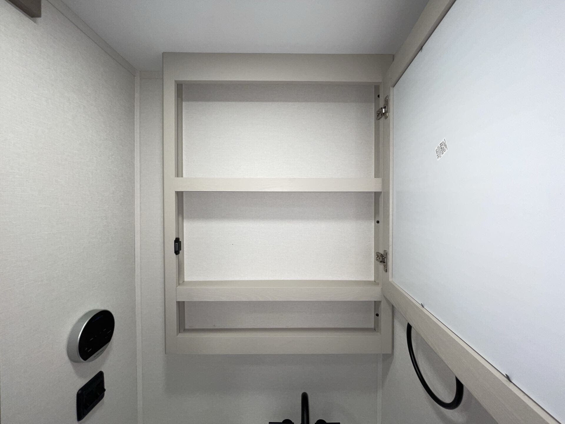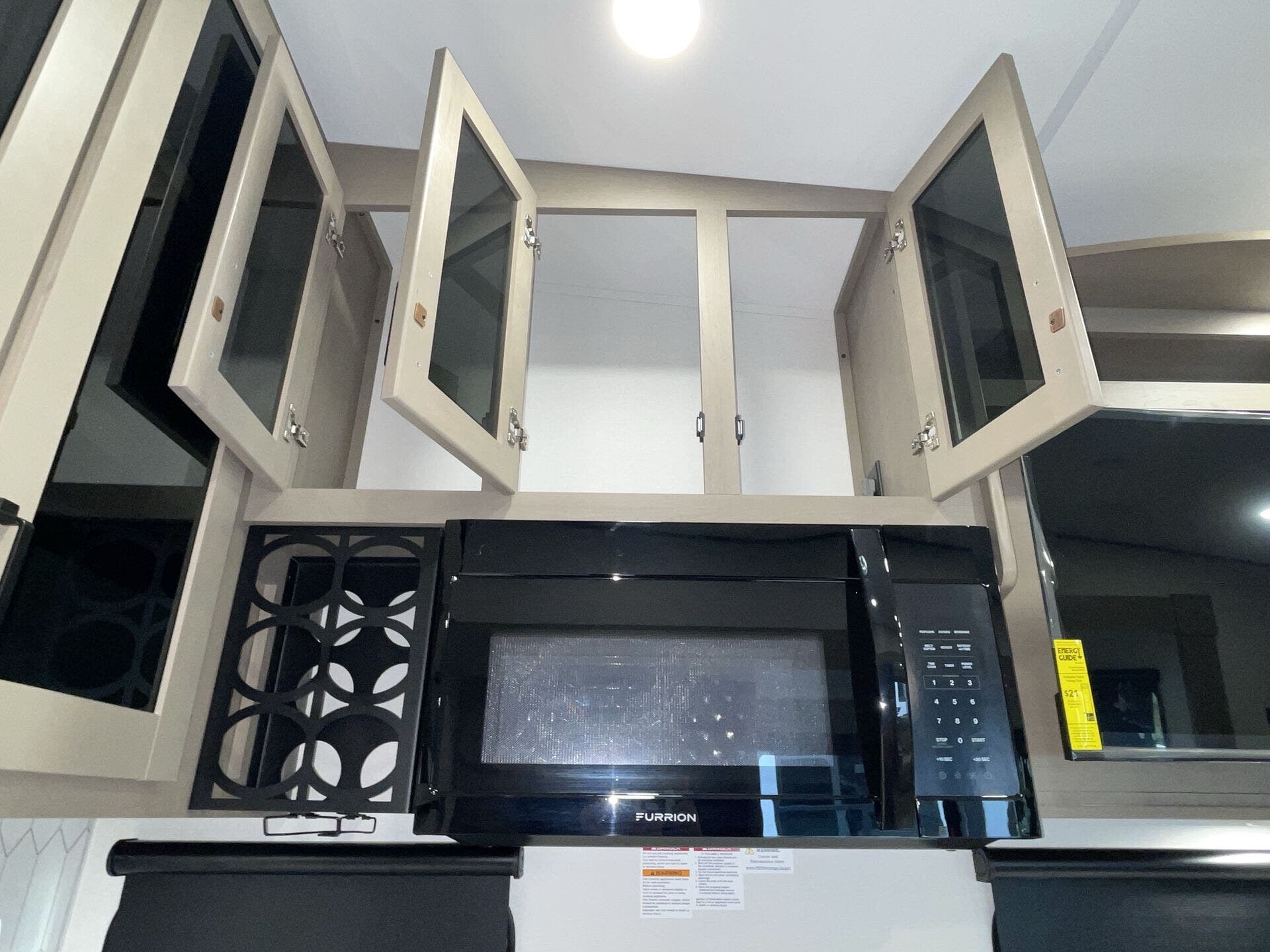 Booth Dinette, Day/Night Shades, Kitchen Sink, Medicine Cabinet, Overhead Cabinetry, Pantry, Queen Bed, Roof Vents, Shower, Theater Seating, Toilet, U-Shaped Dinette, Wardrobe(s)