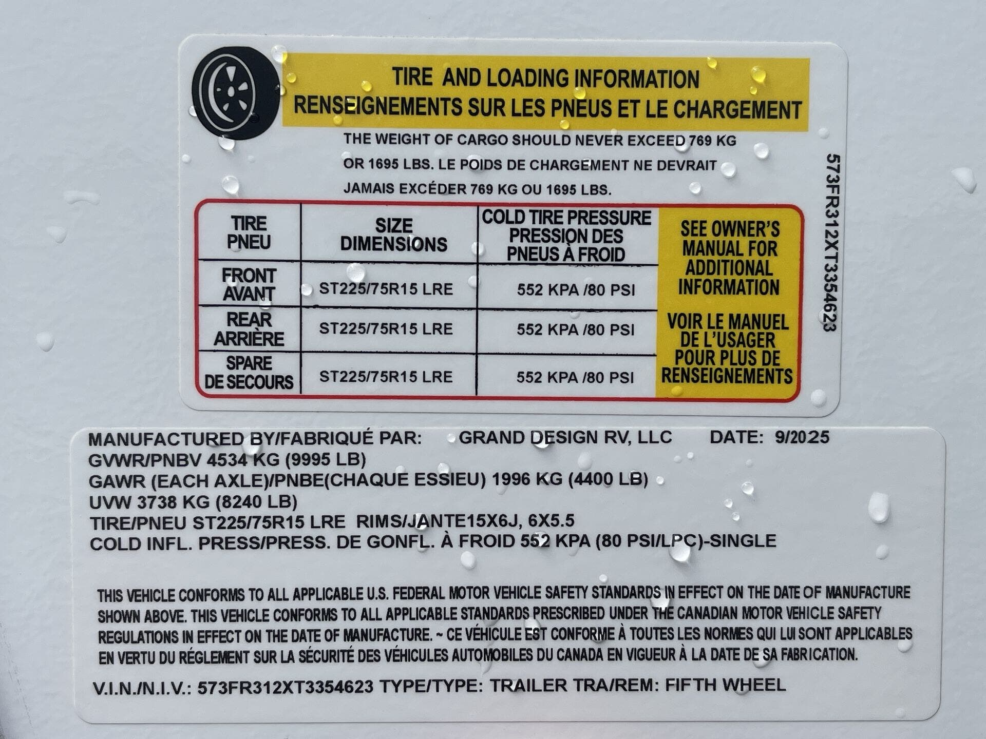 Awning, Black Tank Flush, Detachable Power Cord, Hitch, Leveling Jacks, Pass Thru Storage, Power Awning, Roof Vent, Second Roof A/C, Slideout, Spare Tire Kit -