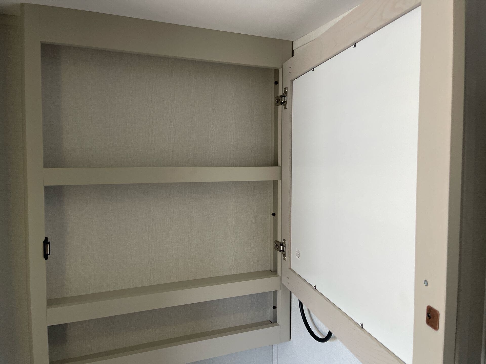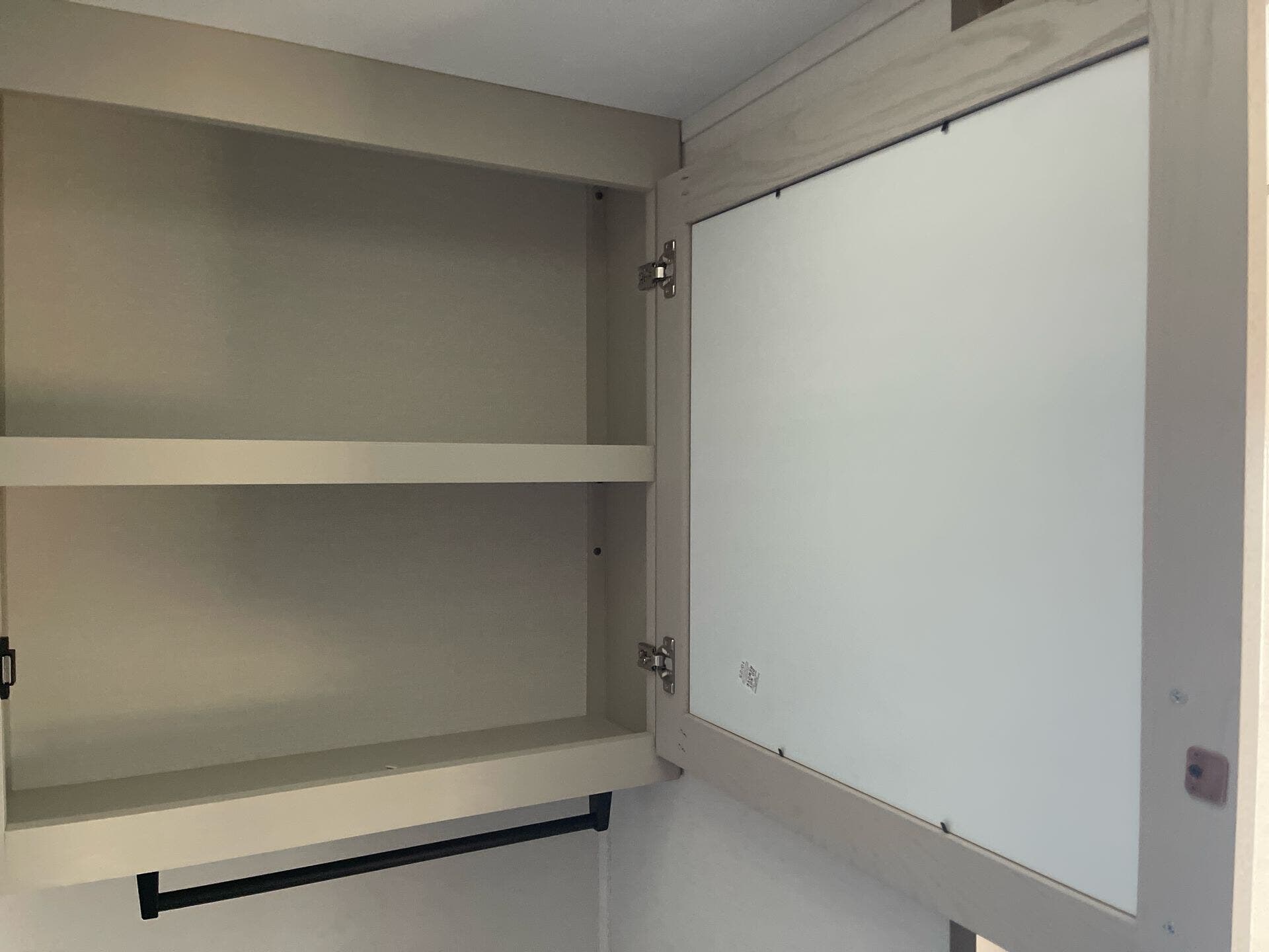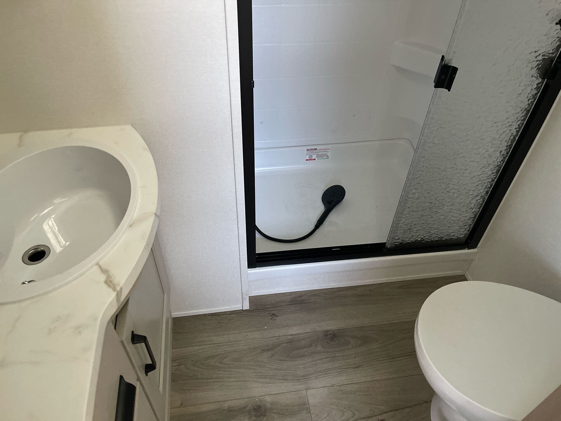 - Well-equipped kitchenette and bath with a medicine cabinet, shower, and vanity