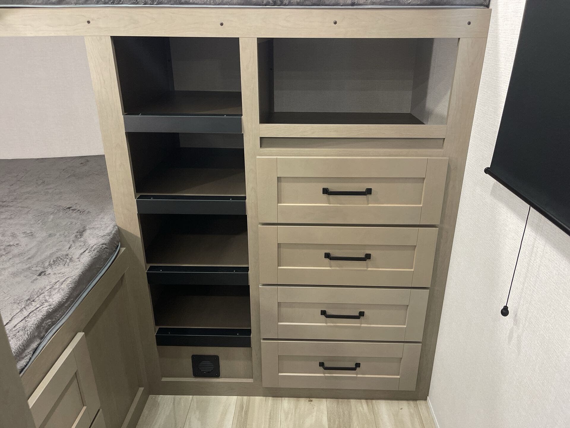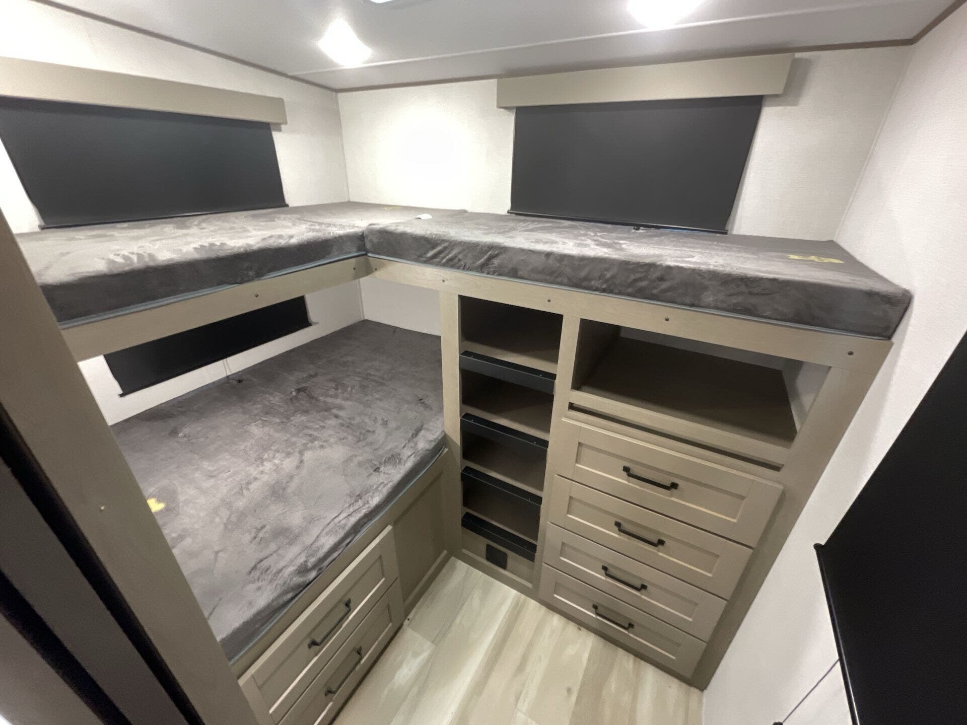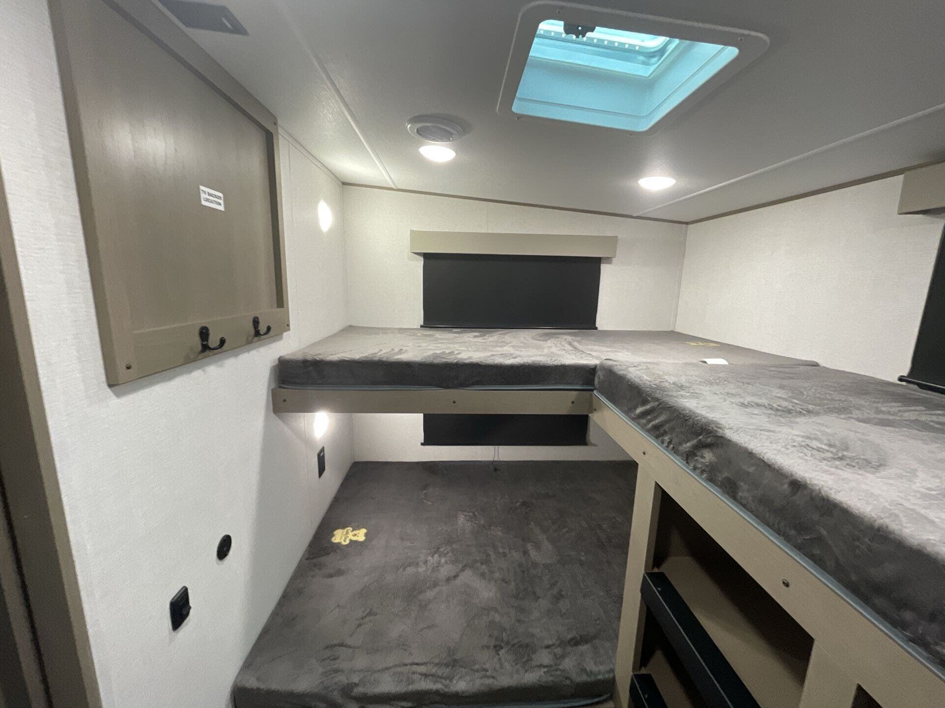 - Interior Amenities: Bunk beds, shower, toilet, U-shaped dinette, medicine cabinet, overhead cabinetry