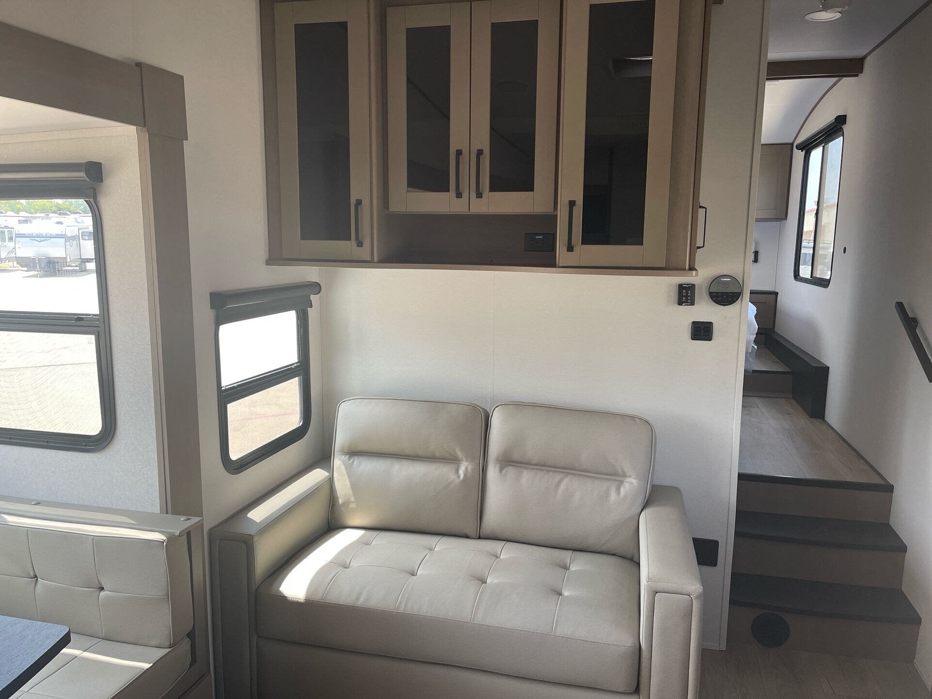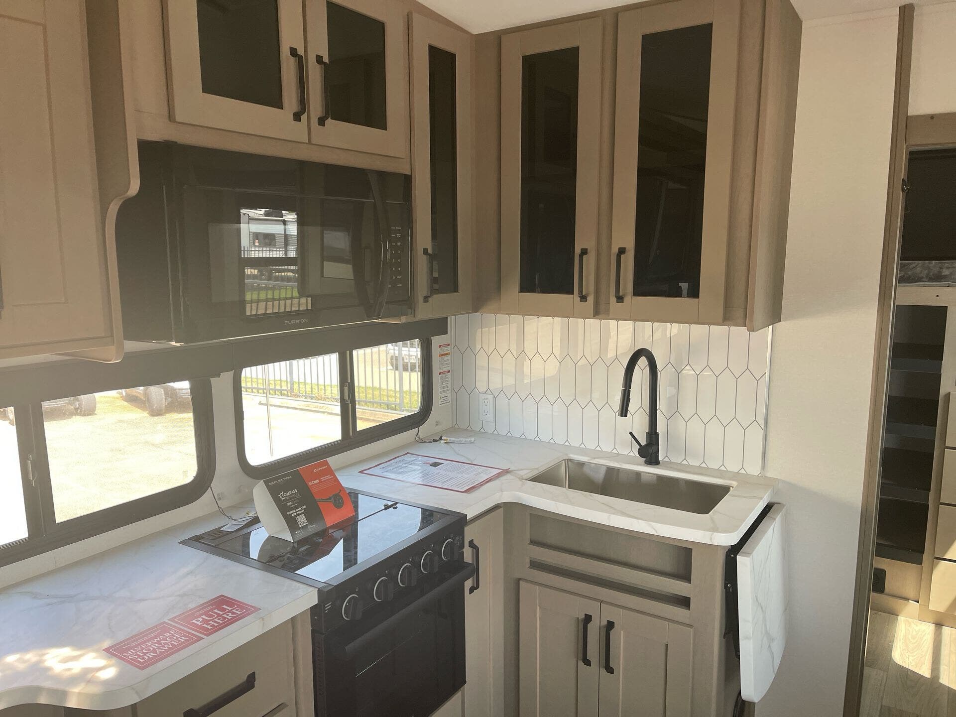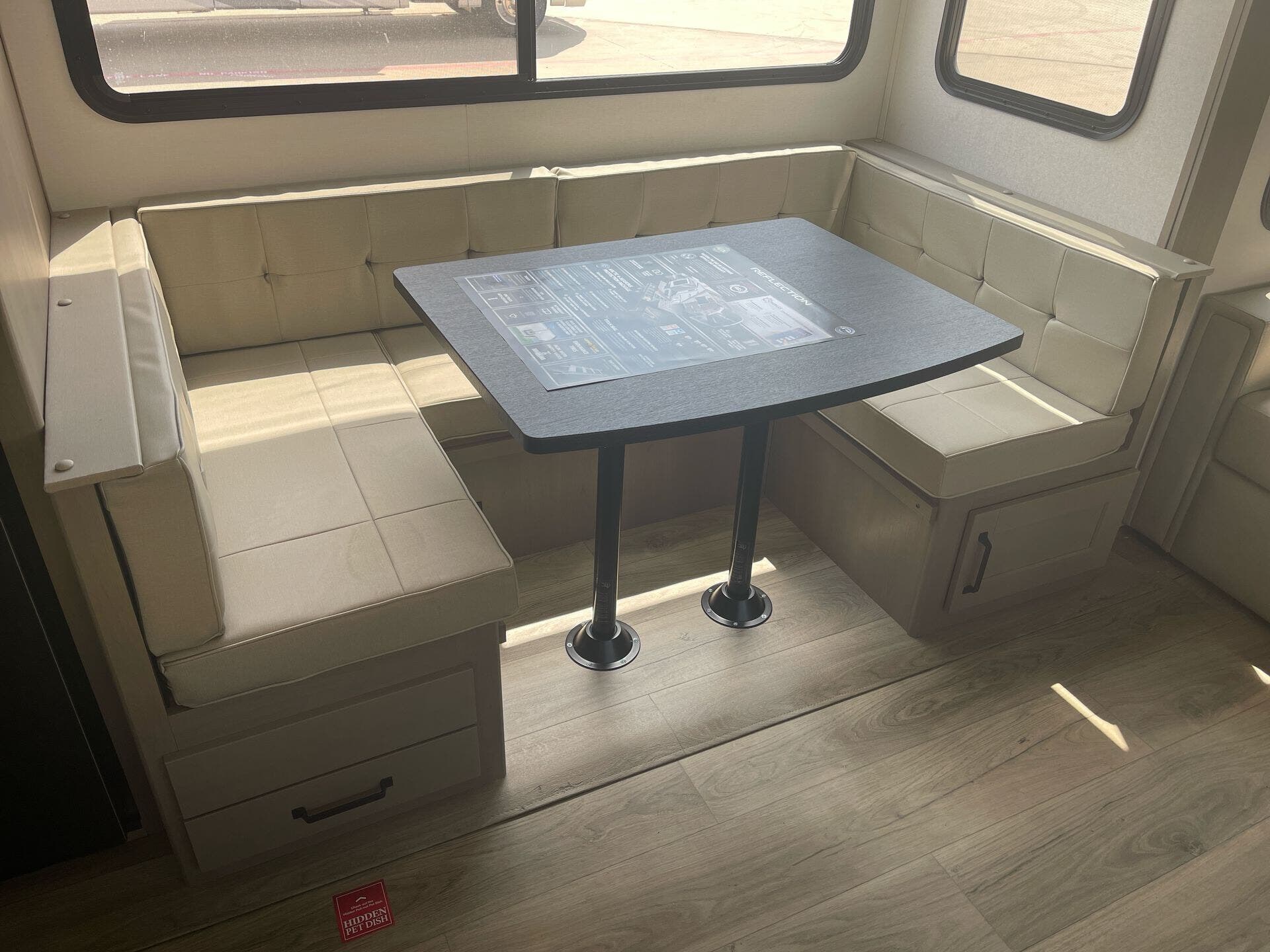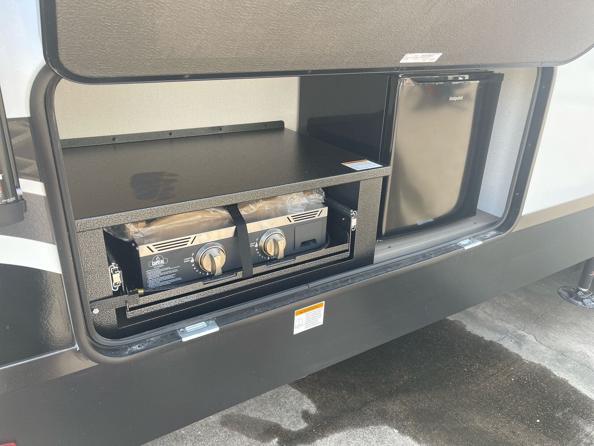 Up front, the master bedroom offers a queen bed with wardrobe storage, offering a peaceful retreat. The central living area includes a U-shaped dinette and optional theater seating, both ideal for dining and relaxation. The well-equipped kitchen features a three-burner cooktop, flip-up countertop for extra prep space, and a 16-cu-ft refrigerator. Outdoor cooks will appreciate the exterior griddle and fridge.