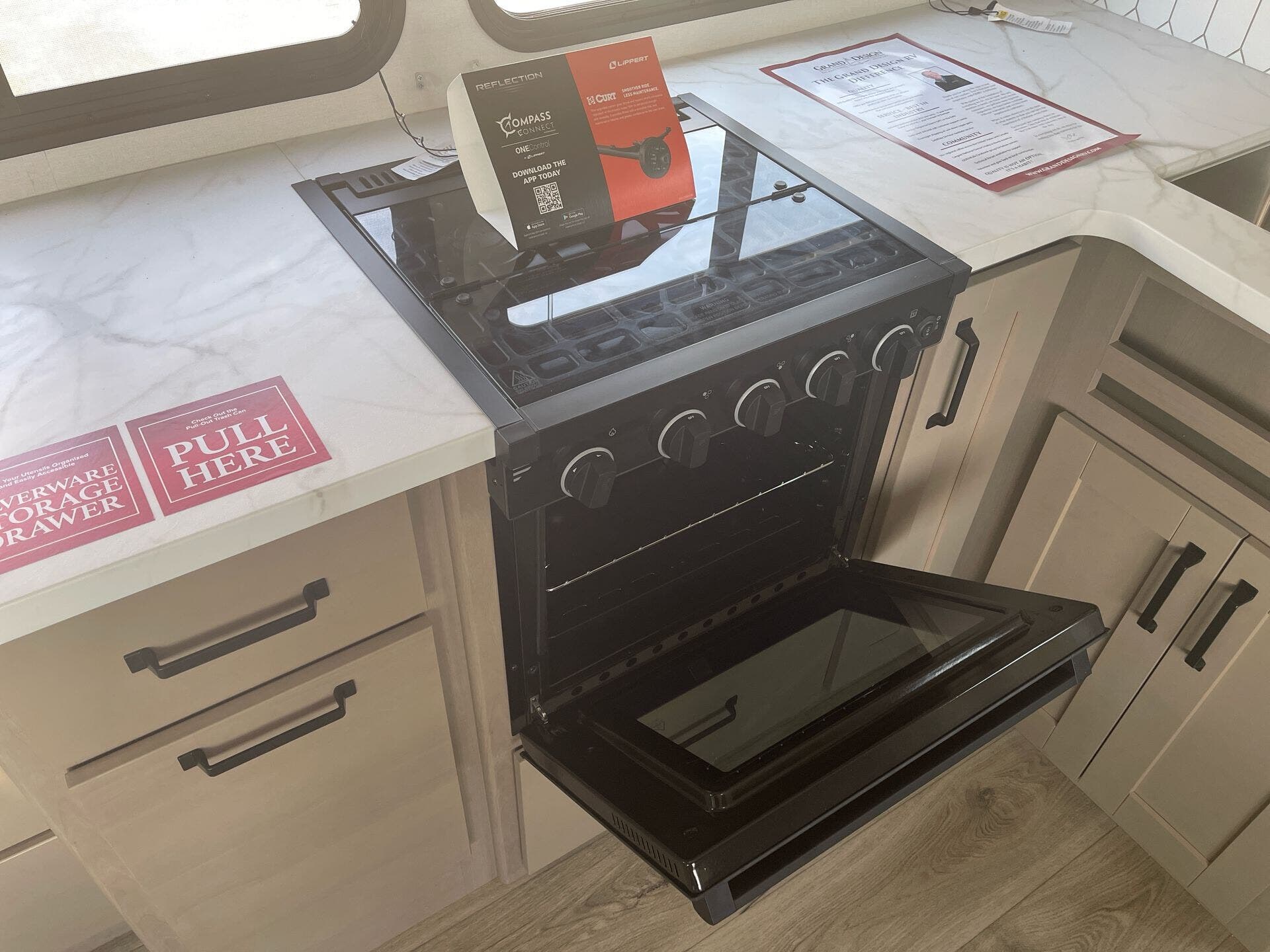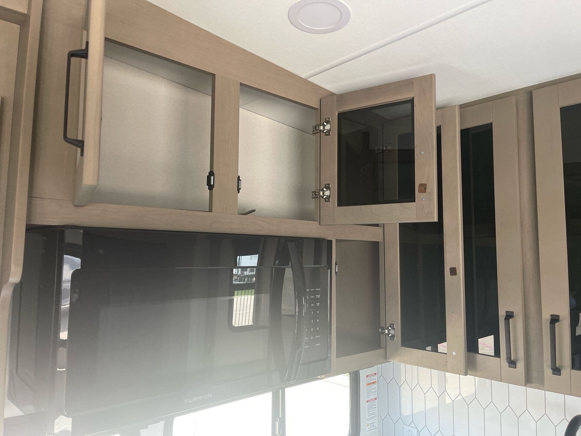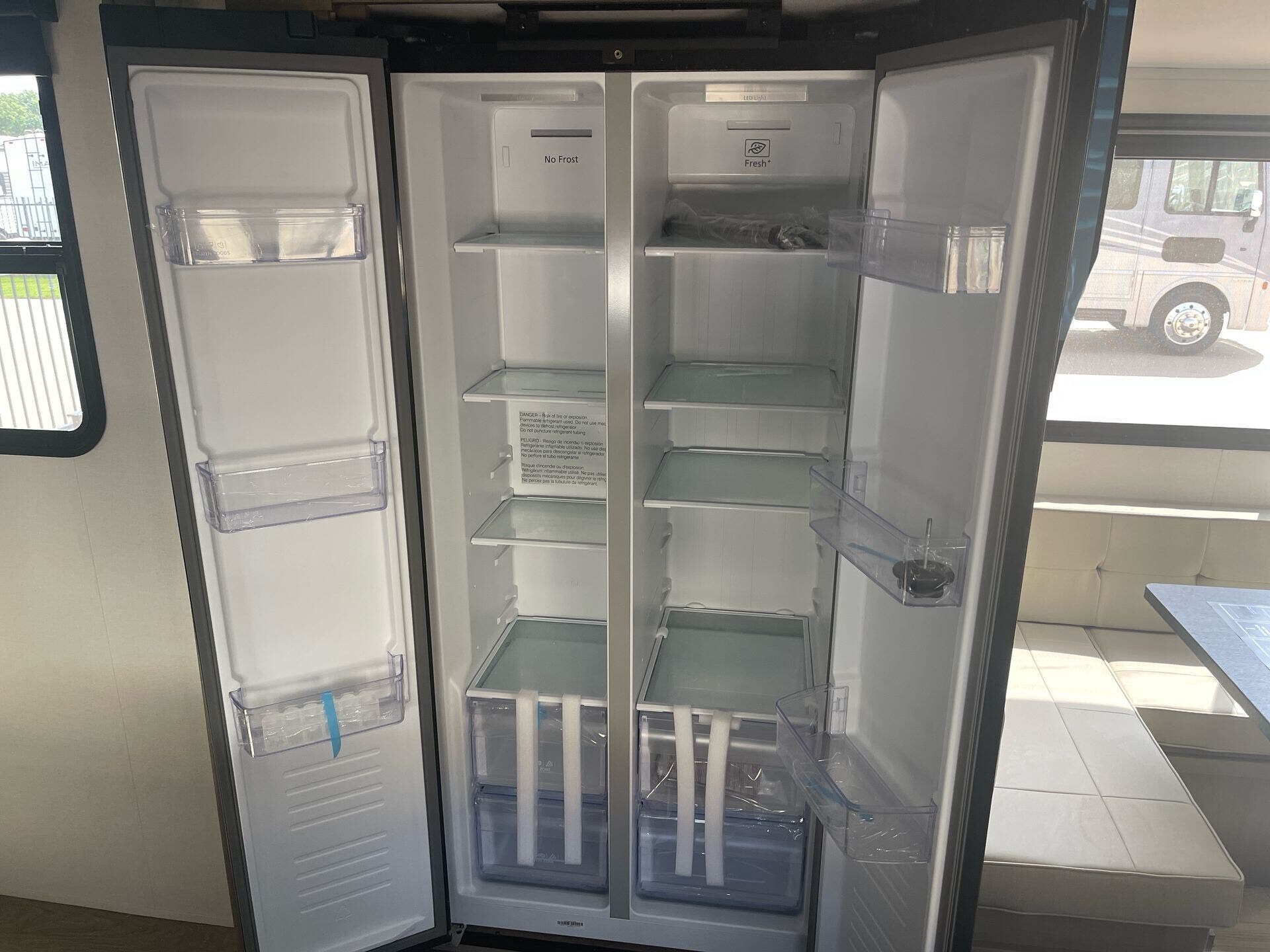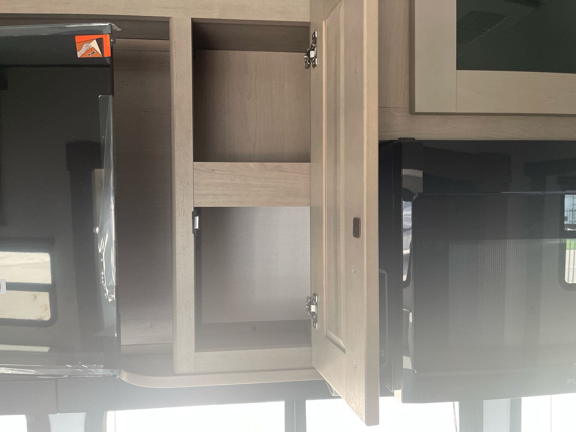 Up front, the master bedroom offers a queen bed with wardrobe storage, offering a peaceful retreat. The central living area includes a U-shaped dinette and optional theater seating, both ideal for dining and relaxation. The well-equipped kitchen features a three-burner cooktop, flip-up countertop for extra prep space, and a 16-cu-ft refrigerator. Outdoor cooks will appreciate the exterior griddle and fridge.