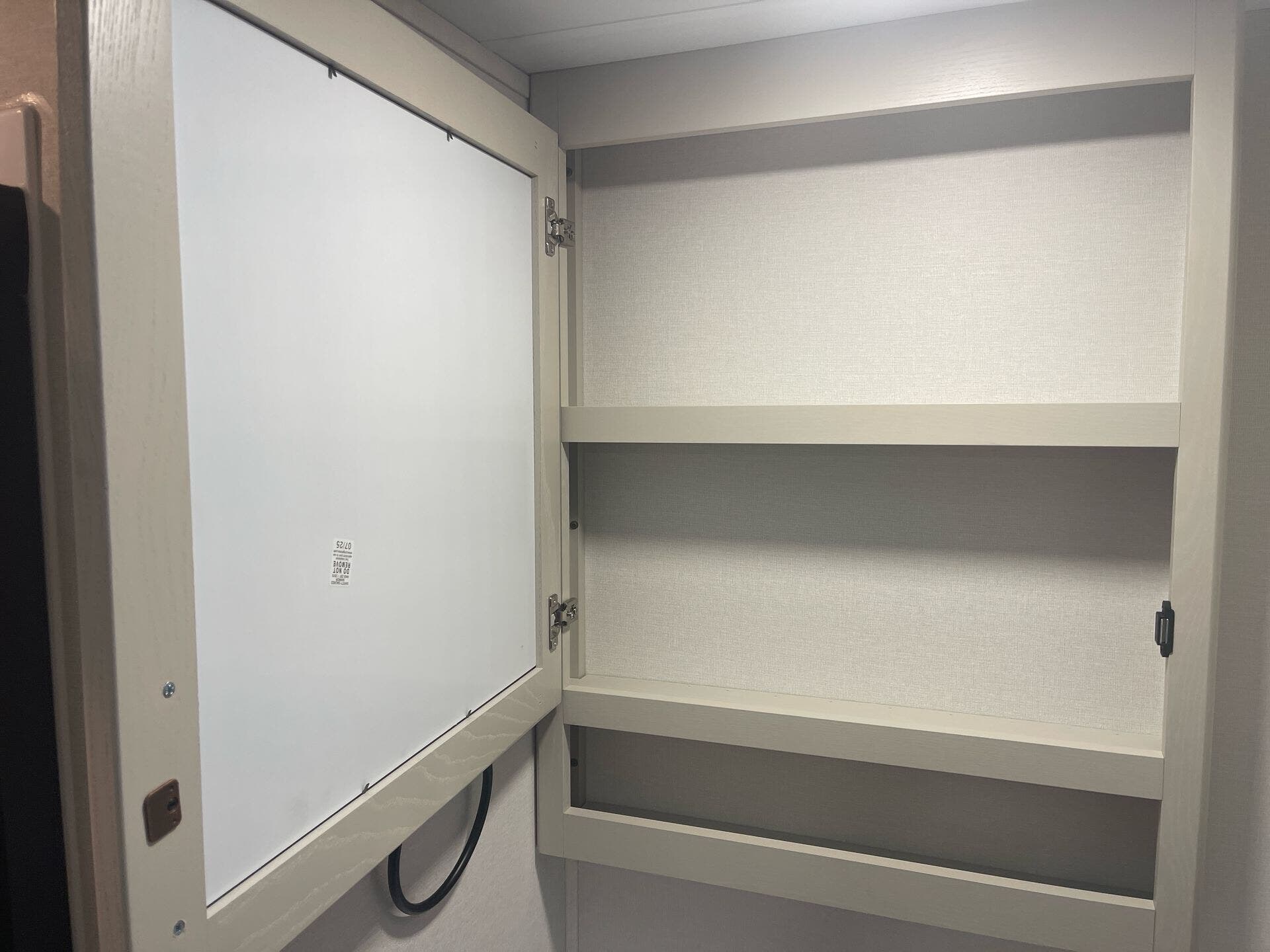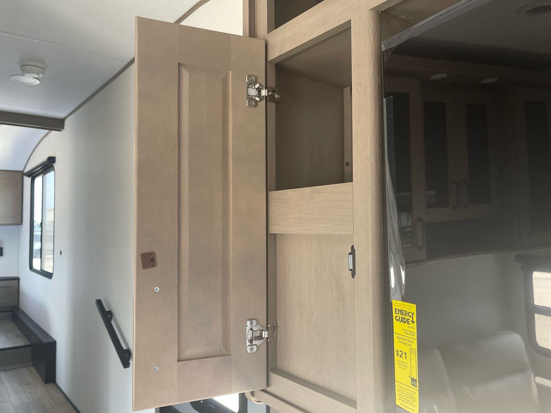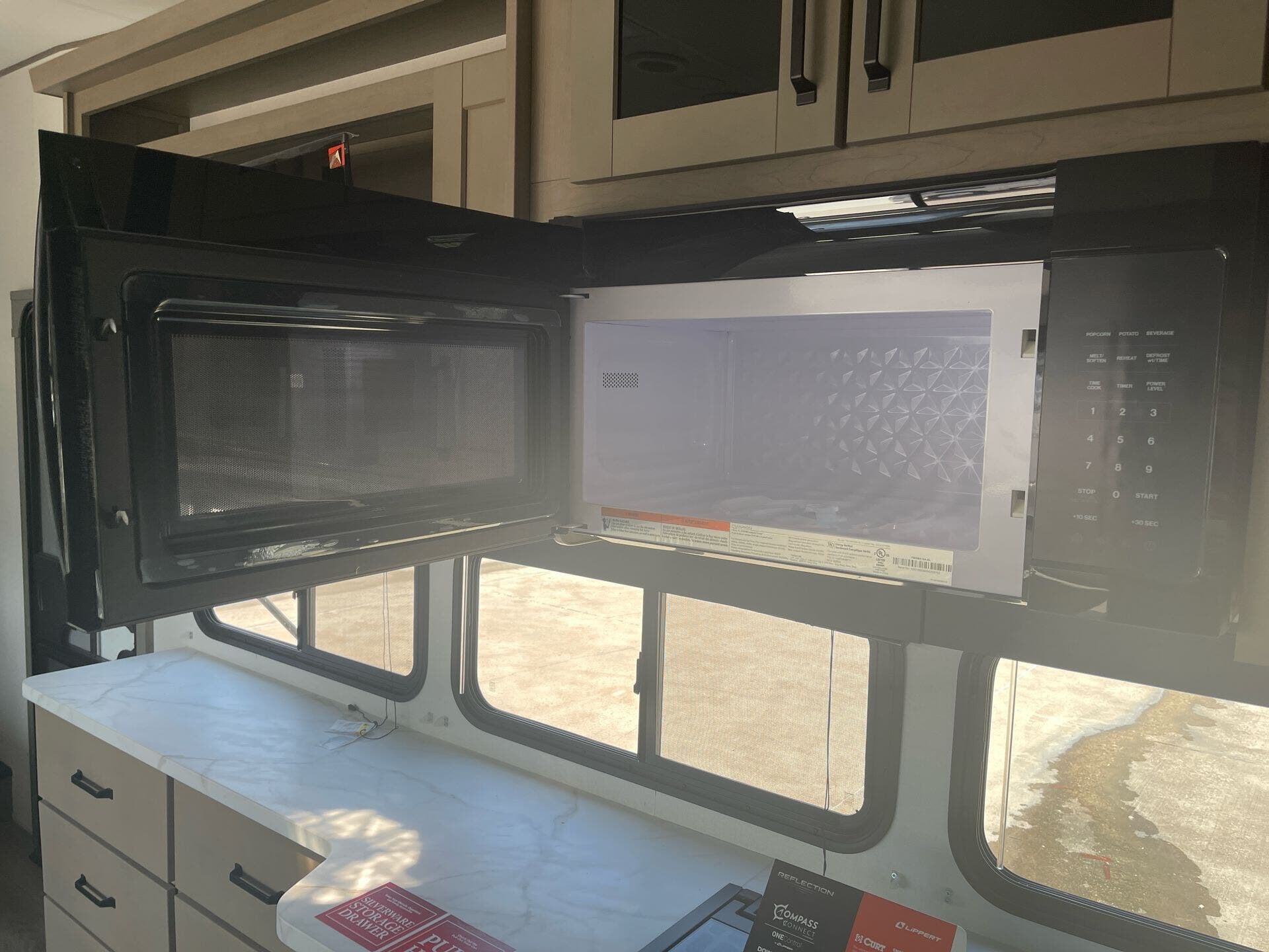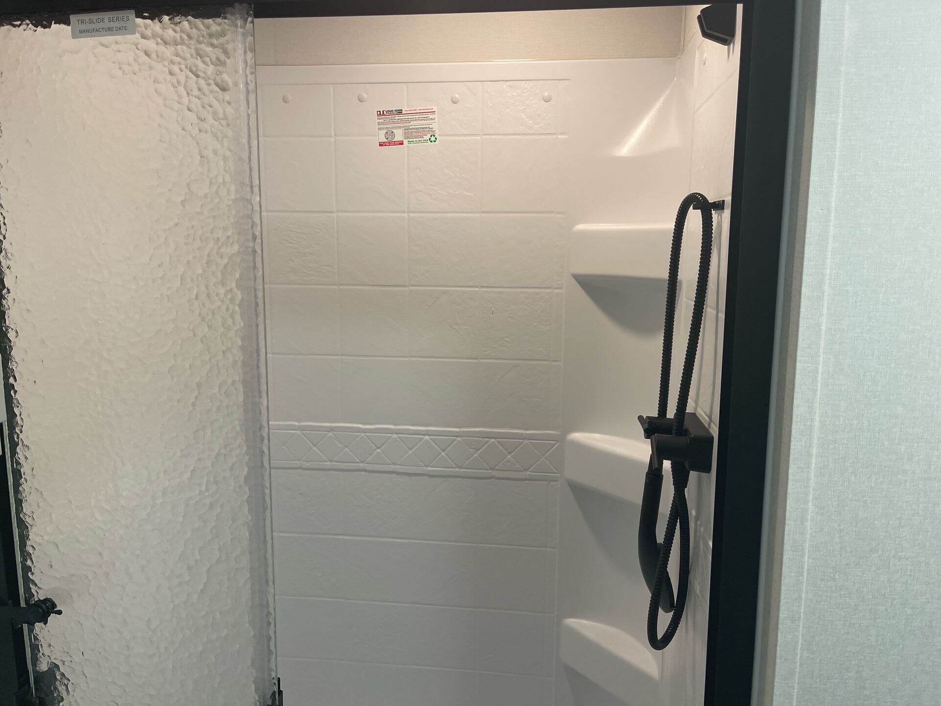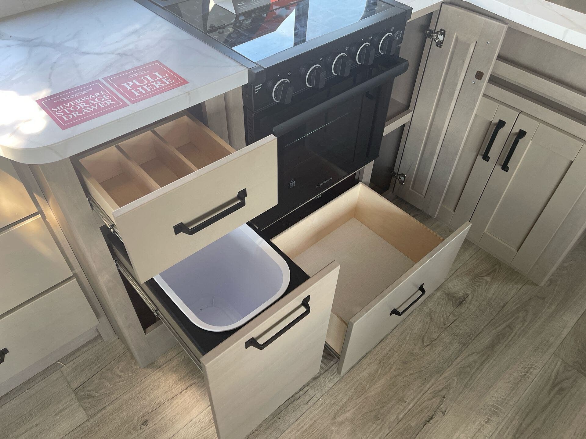 Up front, the master bedroom offers a queen bed with wardrobe storage, offering a peaceful retreat. The central living area includes a U-shaped dinette and optional theater seating, both ideal for dining and relaxation. The well-equipped kitchen features a three-burner cooktop, flip-up countertop for extra prep space, and a 16-cu-ft refrigerator. Outdoor cooks will appreciate the exterior griddle and fridge.