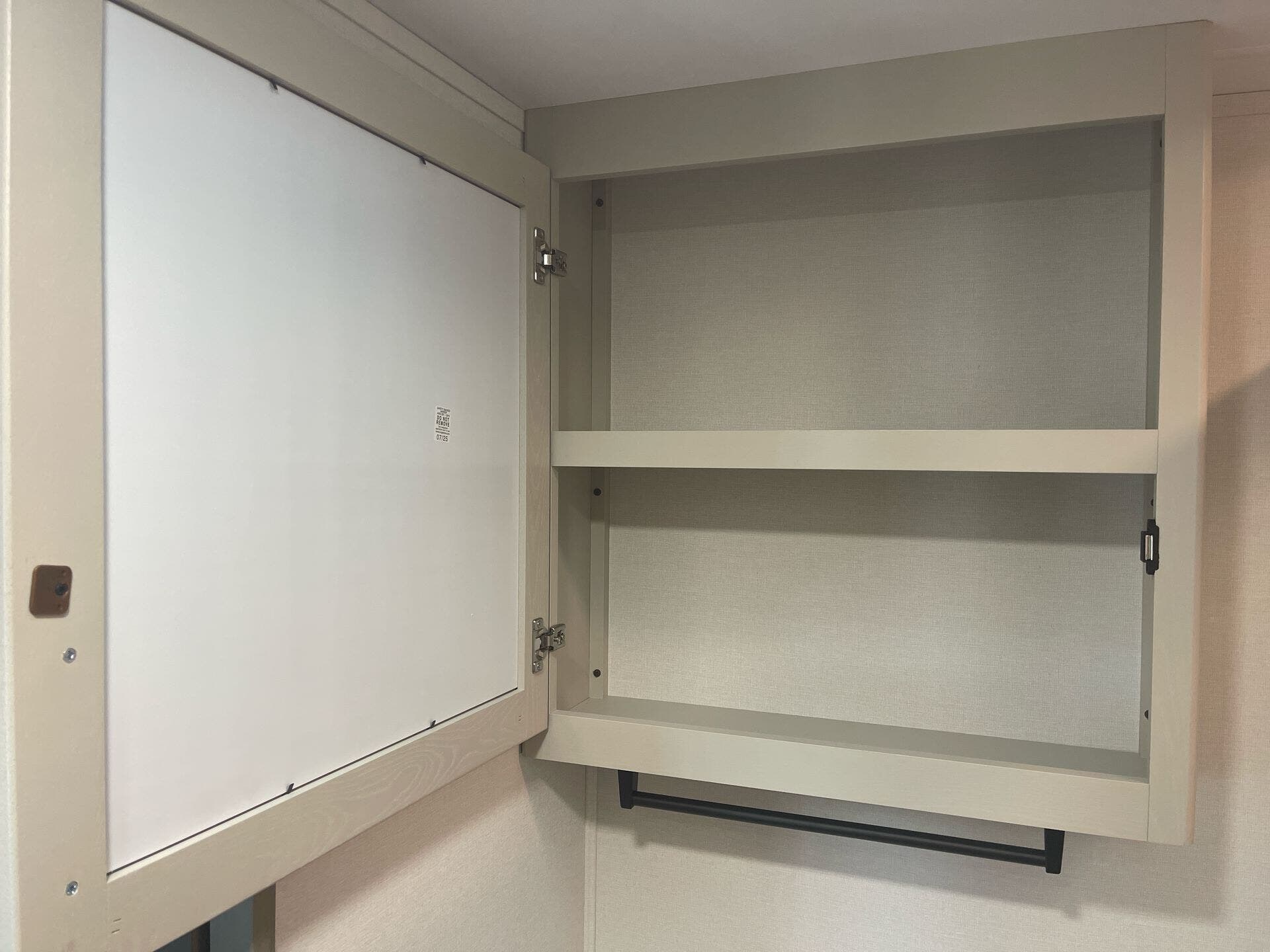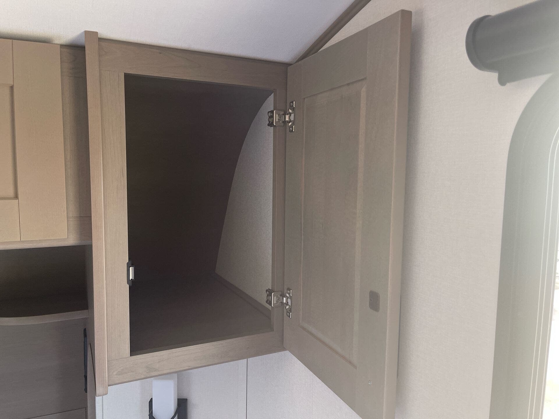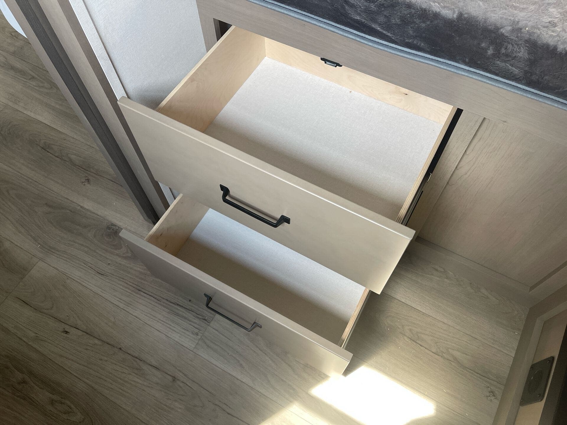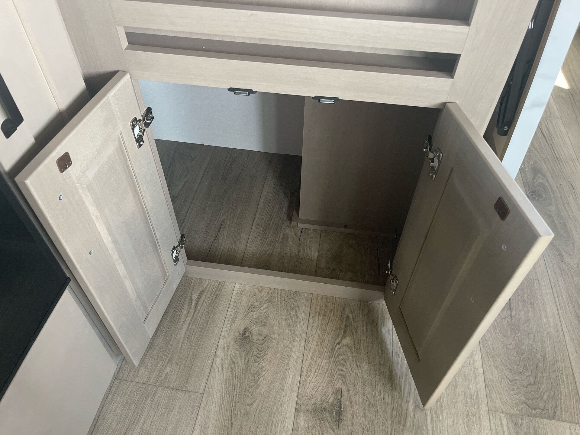 Up front, the master bedroom offers a queen bed with wardrobe storage, offering a peaceful retreat. The central living area includes a U-shaped dinette and optional theater seating, both ideal for dining and relaxation. The well-equipped kitchen features a three-burner cooktop, flip-up countertop for extra prep space, and a 16-cu-ft refrigerator. Outdoor cooks will appreciate the exterior griddle and fridge.