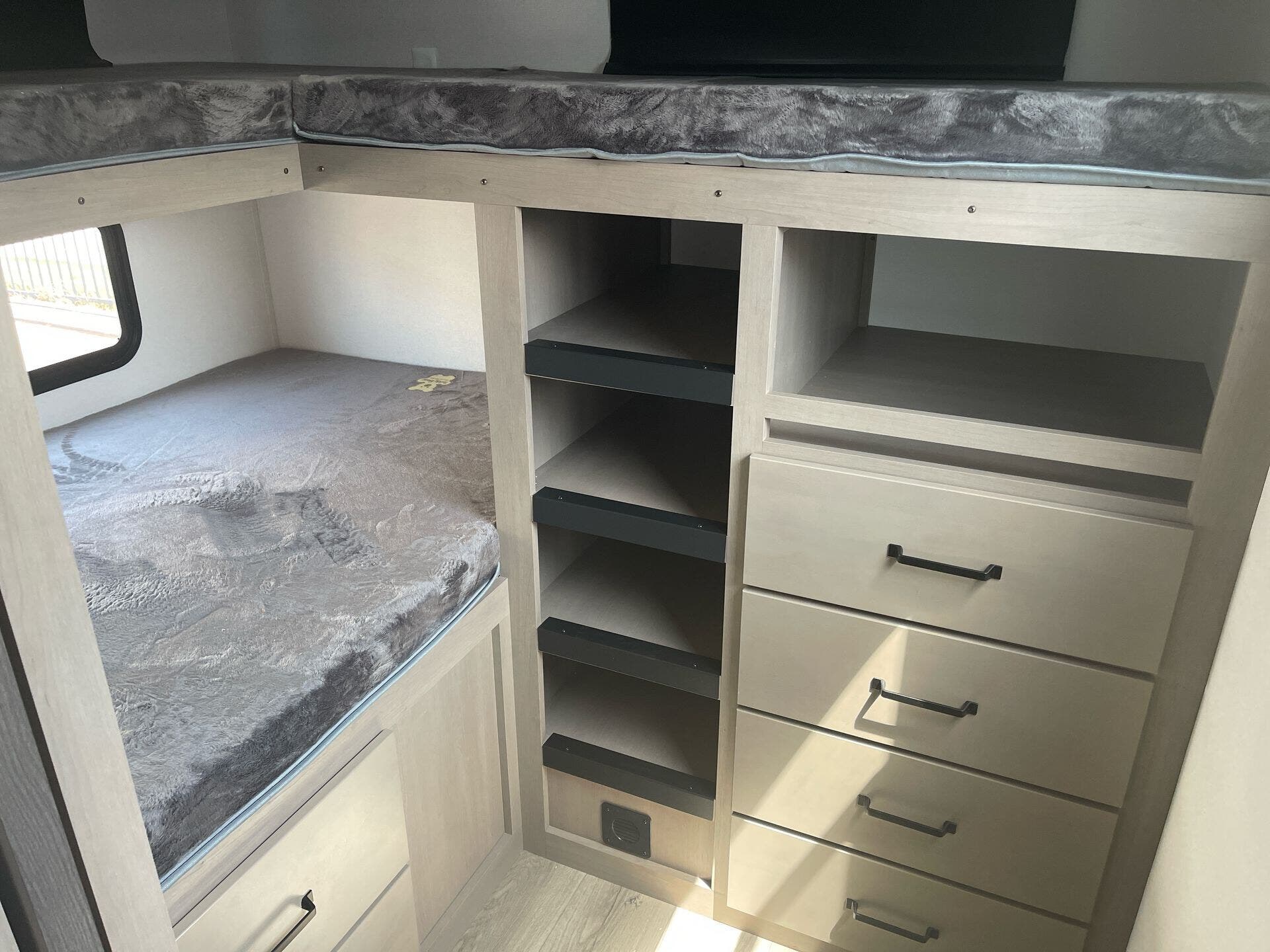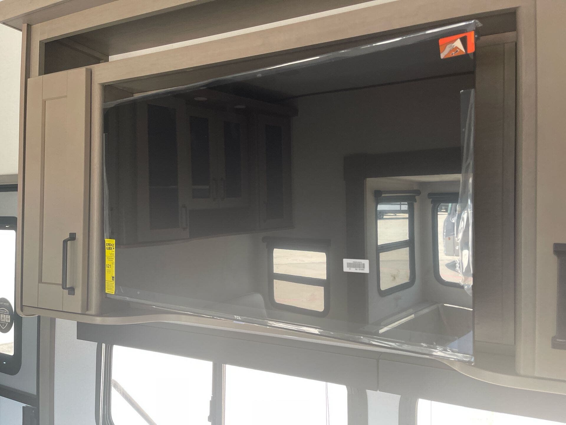 The Reflection 298BH spans 34 ft 9 in, combining thoughtful layout with manageable towability—ideal for half-ton trucks thanks to its 1,450-lb hitch weight, 9,050-lb dry weight, and 10,995-lb GVWR. At the rear, a private bunkhouse houses double-over-double bunks and a TV prep area, making it perfect for kids or guests seeking privacy.