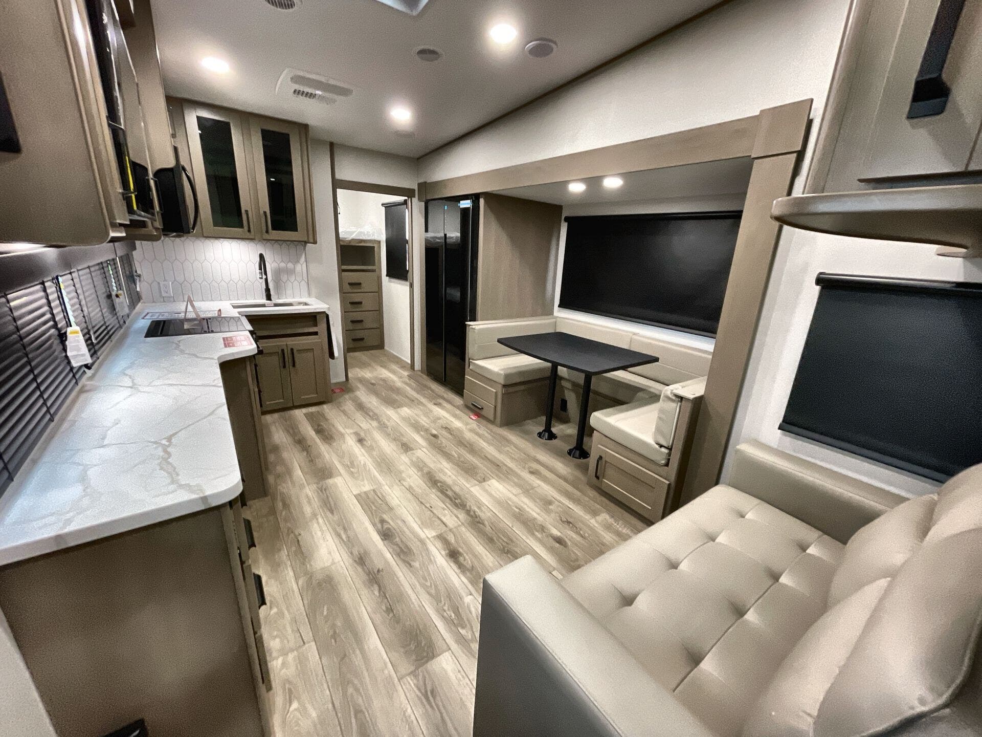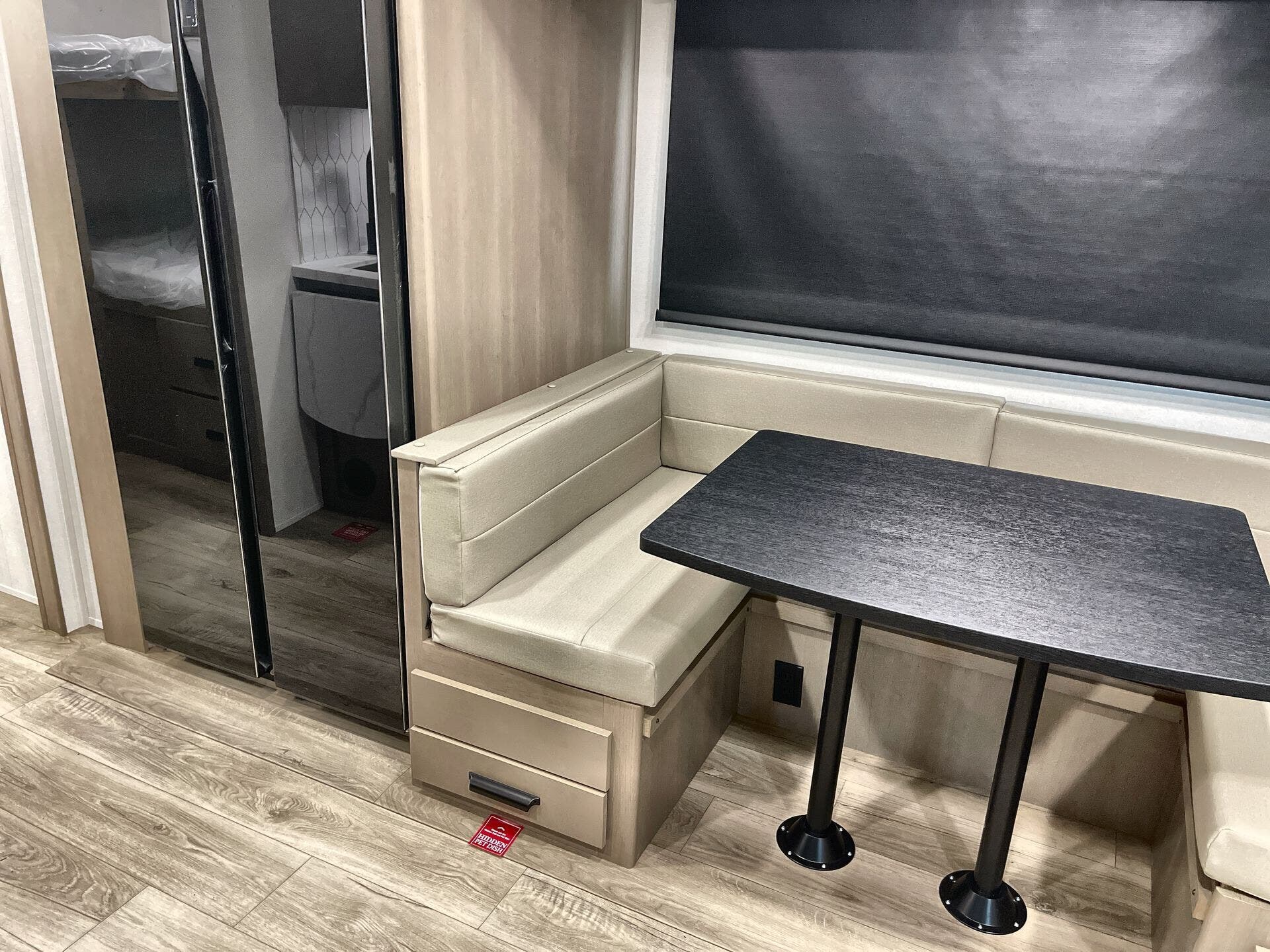 - Living area offers Day/Night Shades, Theater Seating, a Sofa Bed, and a Booth Dinette, delivering flexible seating and sleeping options.