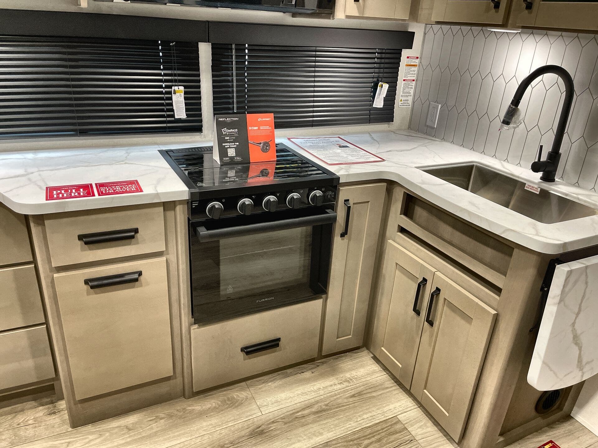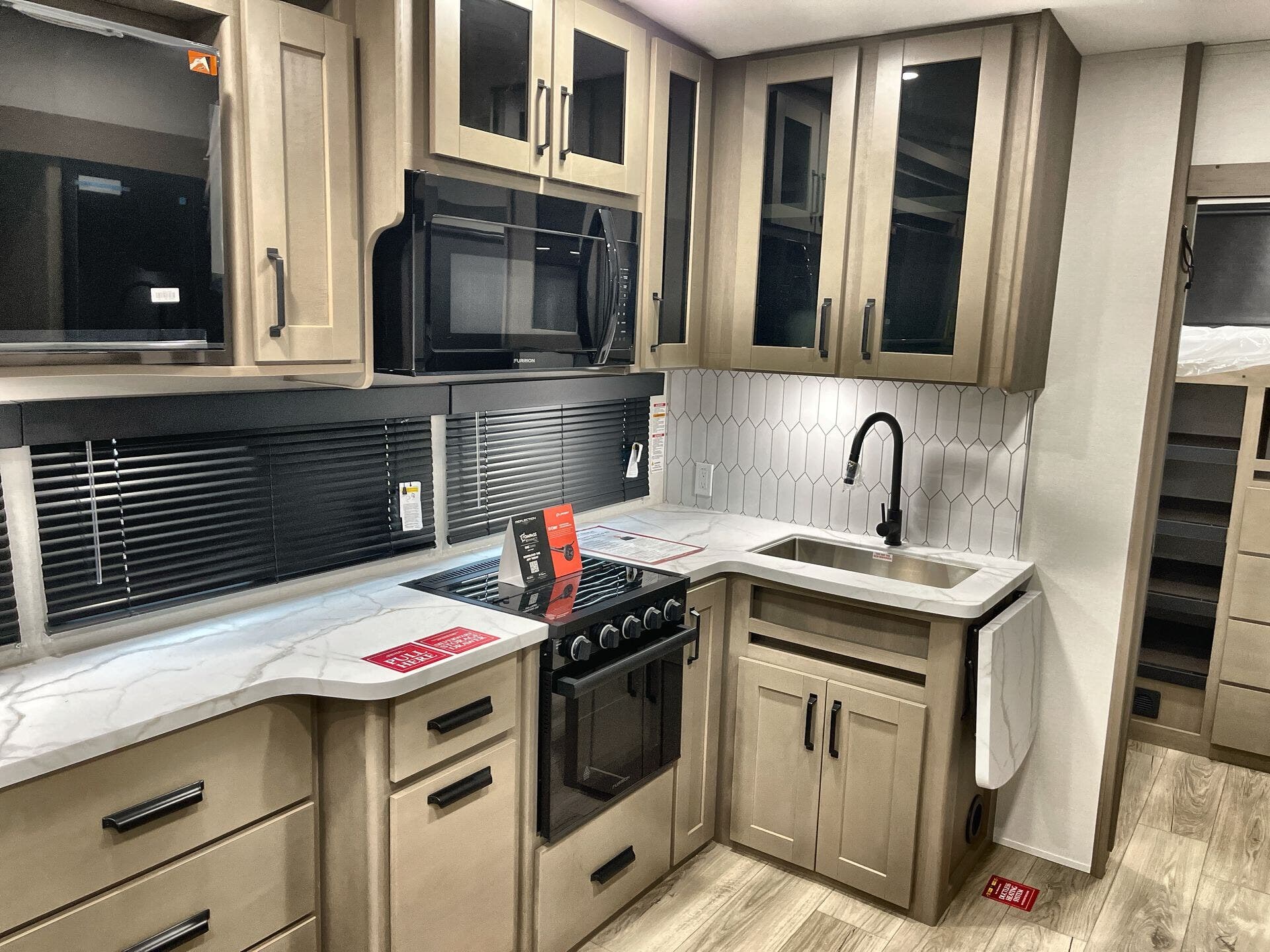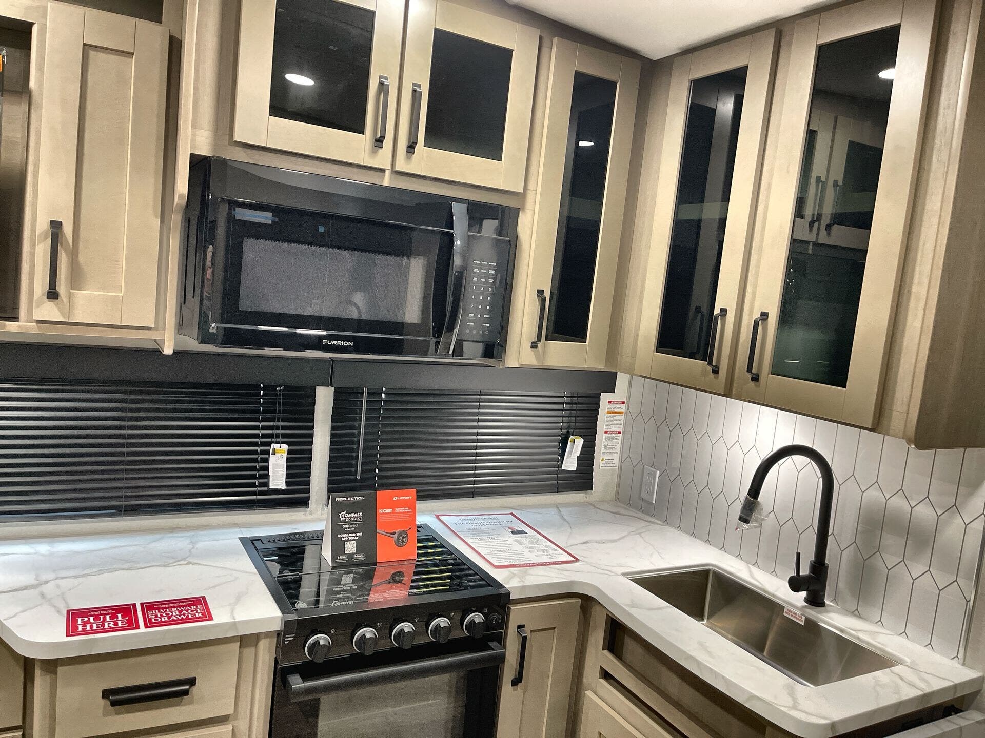 - Reliable kitchen layout includes an Island Kitchen, two sinks, a stove top burner, oven, microwave, and refrigerator for home-style meals on the road.