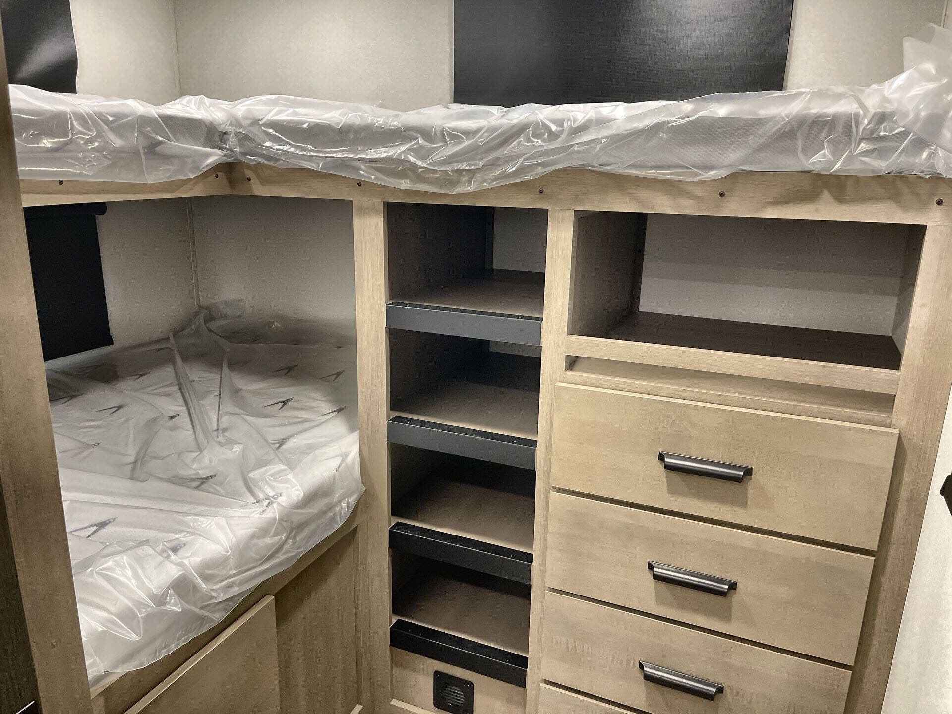 Booth Dinette, Bunk Beds, Bunkhouse, Day/Night Shades, Dinette Bed, Island Kitchen, Kitchen Sink, Medicine Cabinet, Non-Smoking Unit, Overhead Cabinetry, Pet Friendly, Queen Bed, Shower, Sofa Bed, Theater Seating, Toilet, Wardrobe(s)