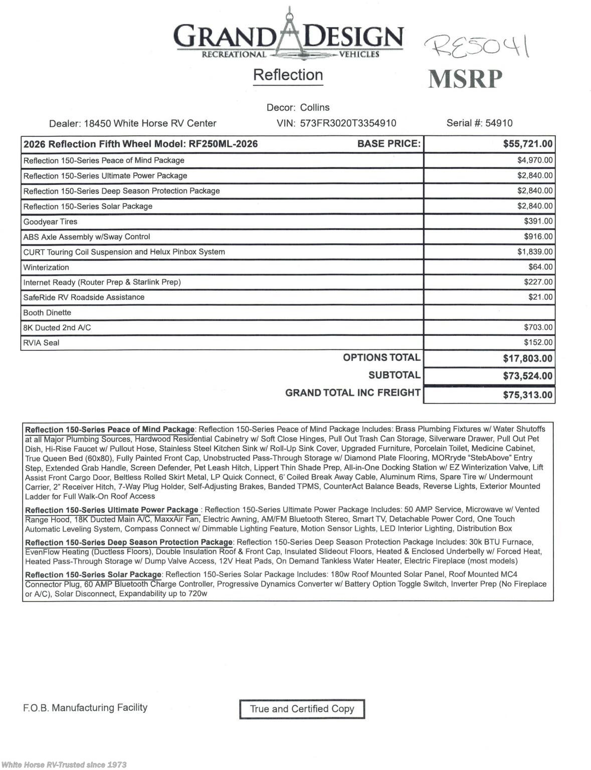 Request More Info on this 2026 Grand Design Reflection 150 Series 250ML Offered for sale by White Horse RV Center