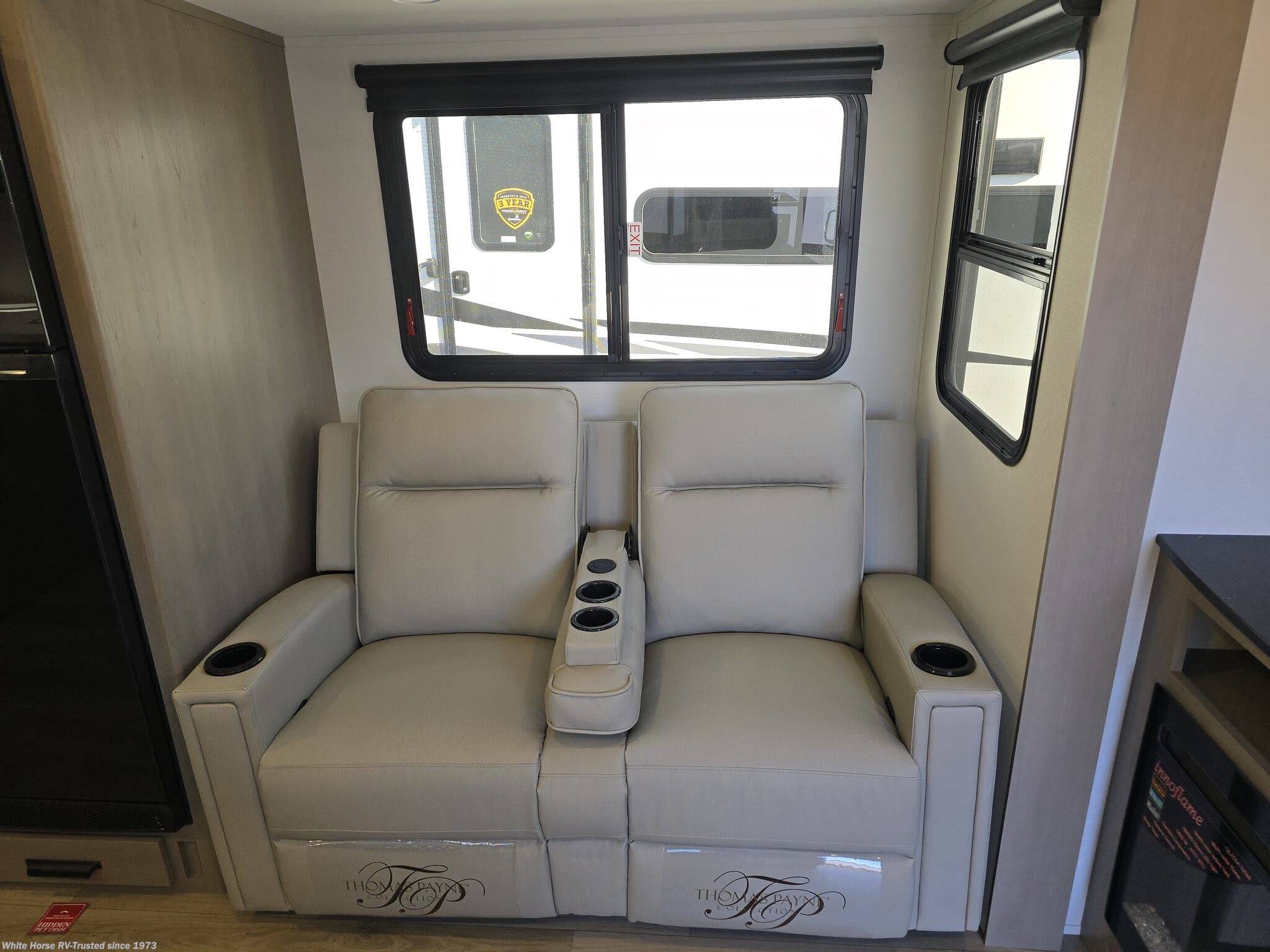 Rear living layout offers theater-seating comfort and a tri-fold sofa for guests or extra sleep space